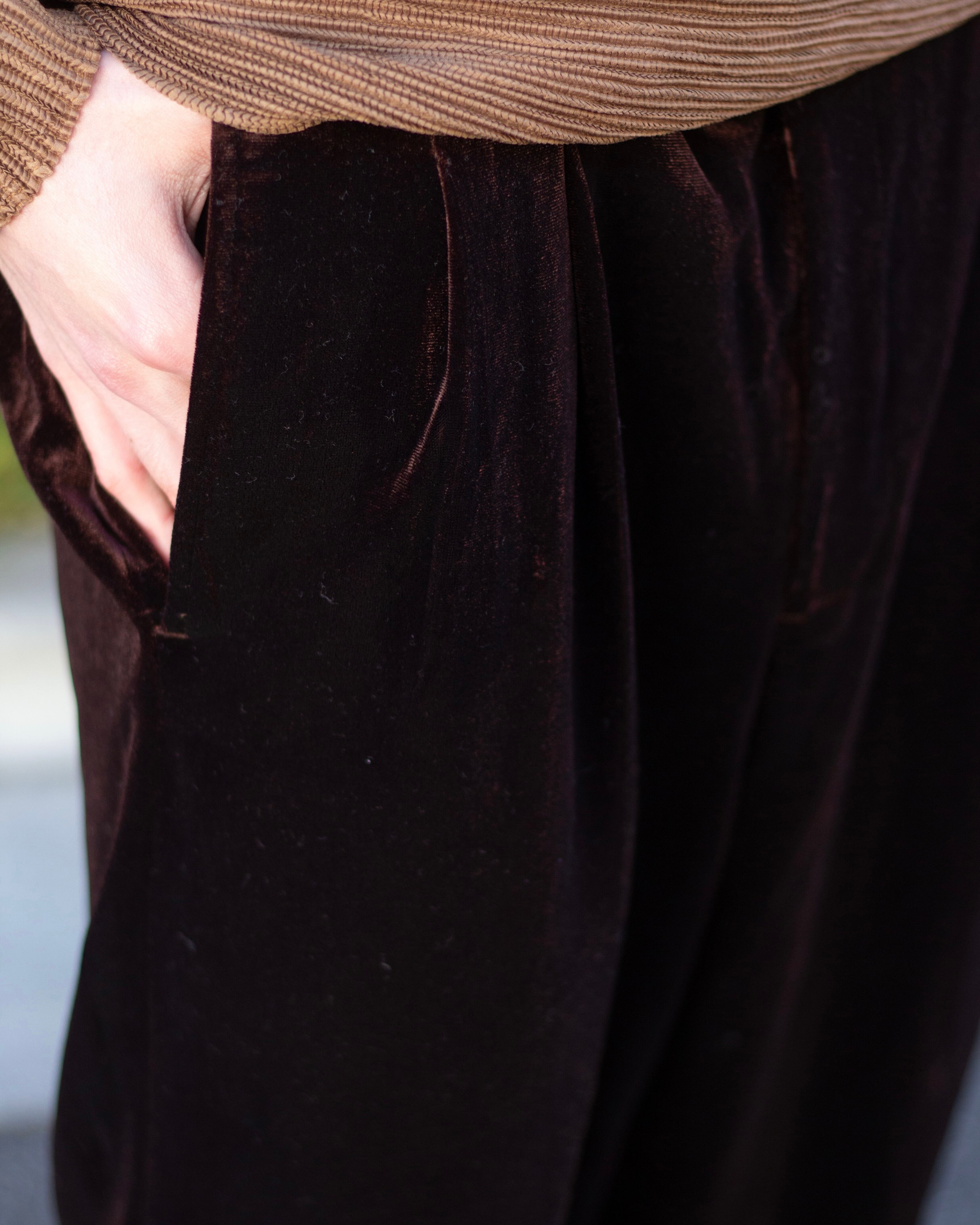 深みのあるボルドーカラーが魅力のベロアツータックスラックス。