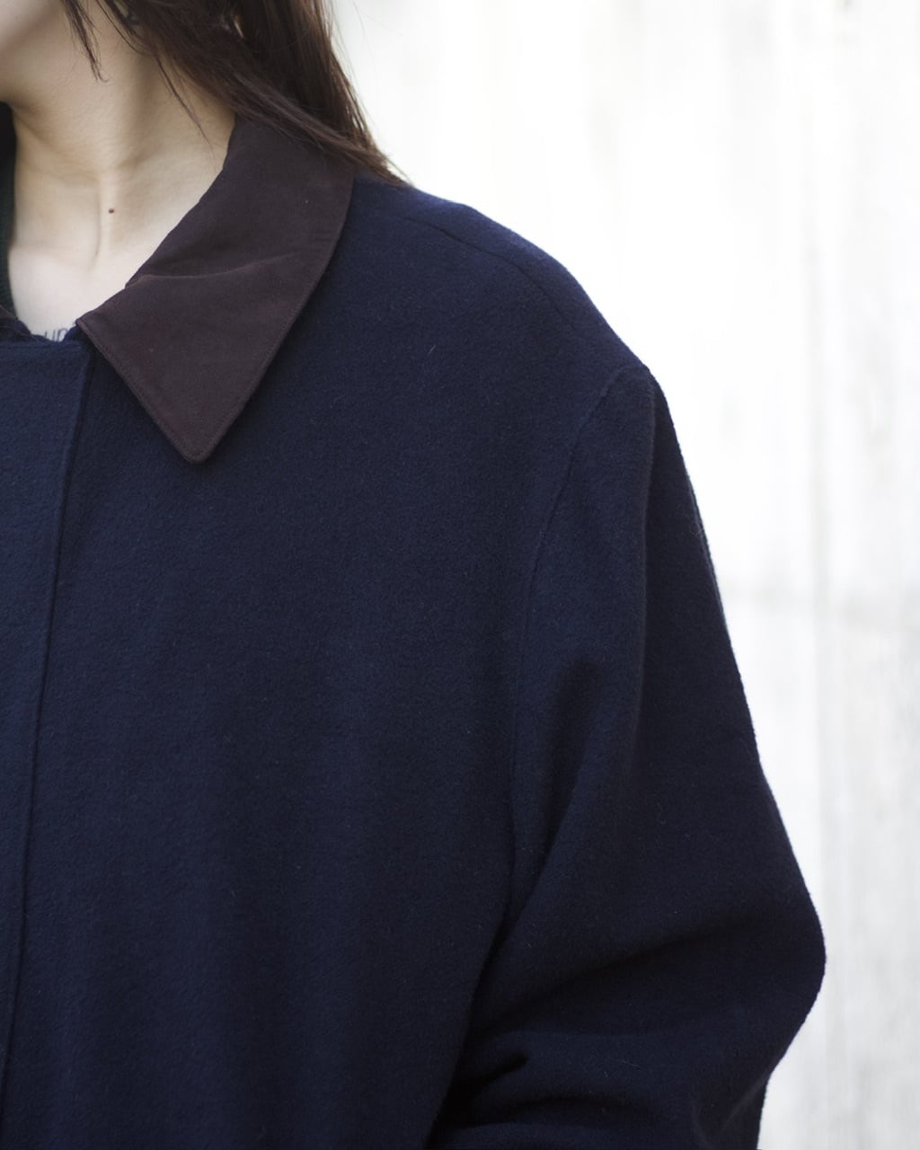 ボタンが比翼になっているタイプで、襟のブラウンのスウェード生地が目を惹く1着。