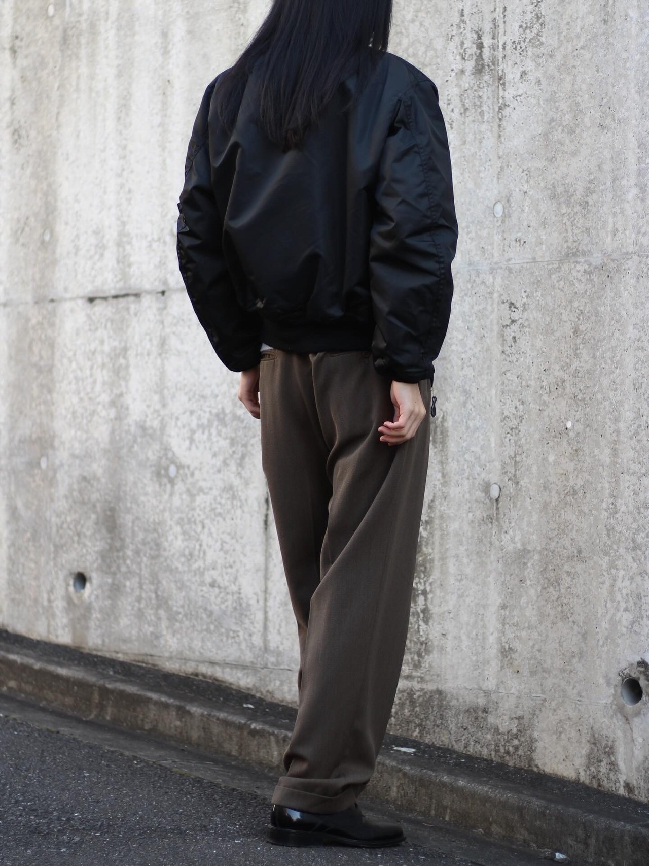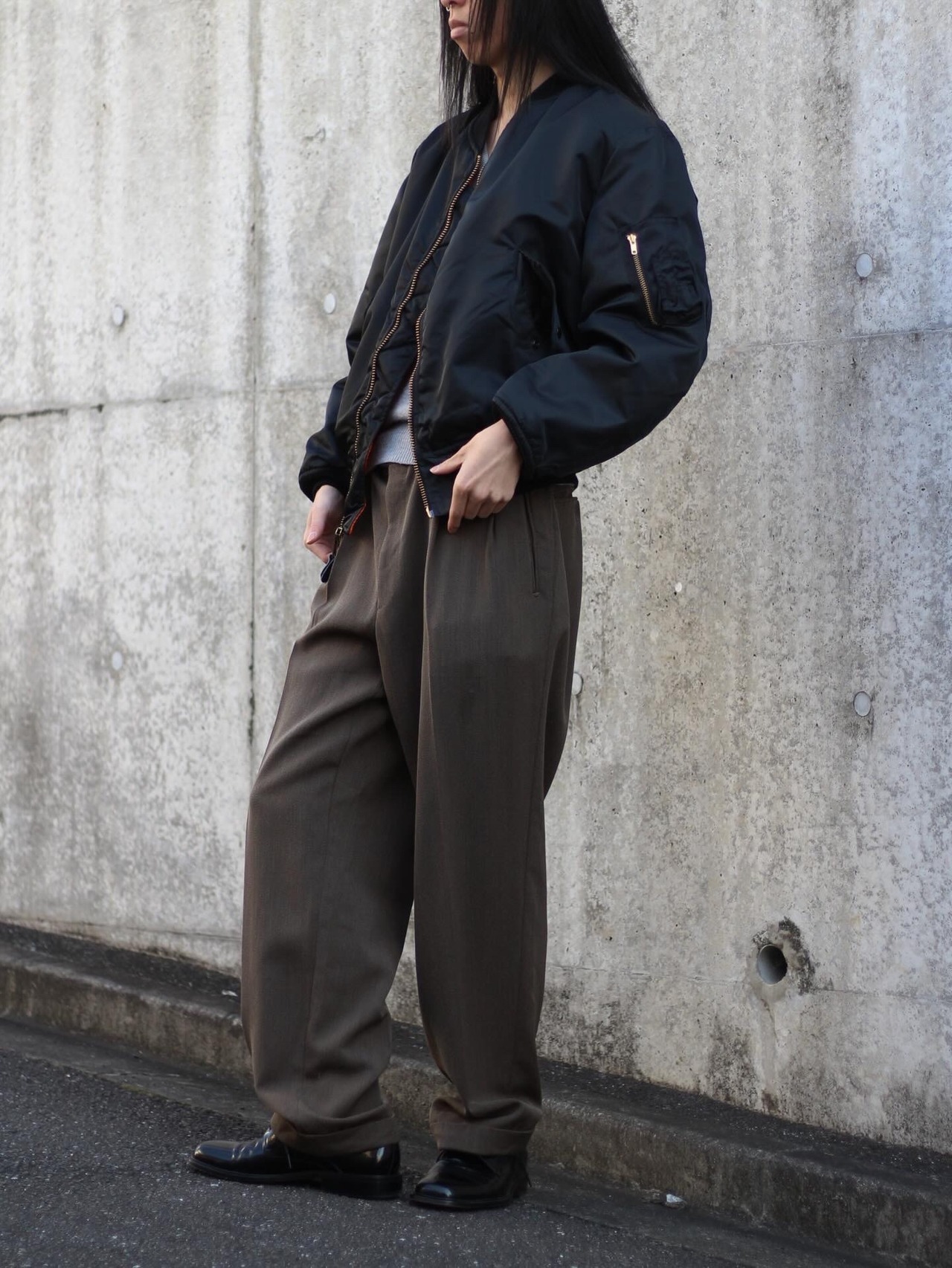 ボンバーシルエットに対して着丈が短めなのもポイント。ミリタリーアイテムだが、デザイナーズなどのアイテムとも合わせやすいカラーリングとサイジング。