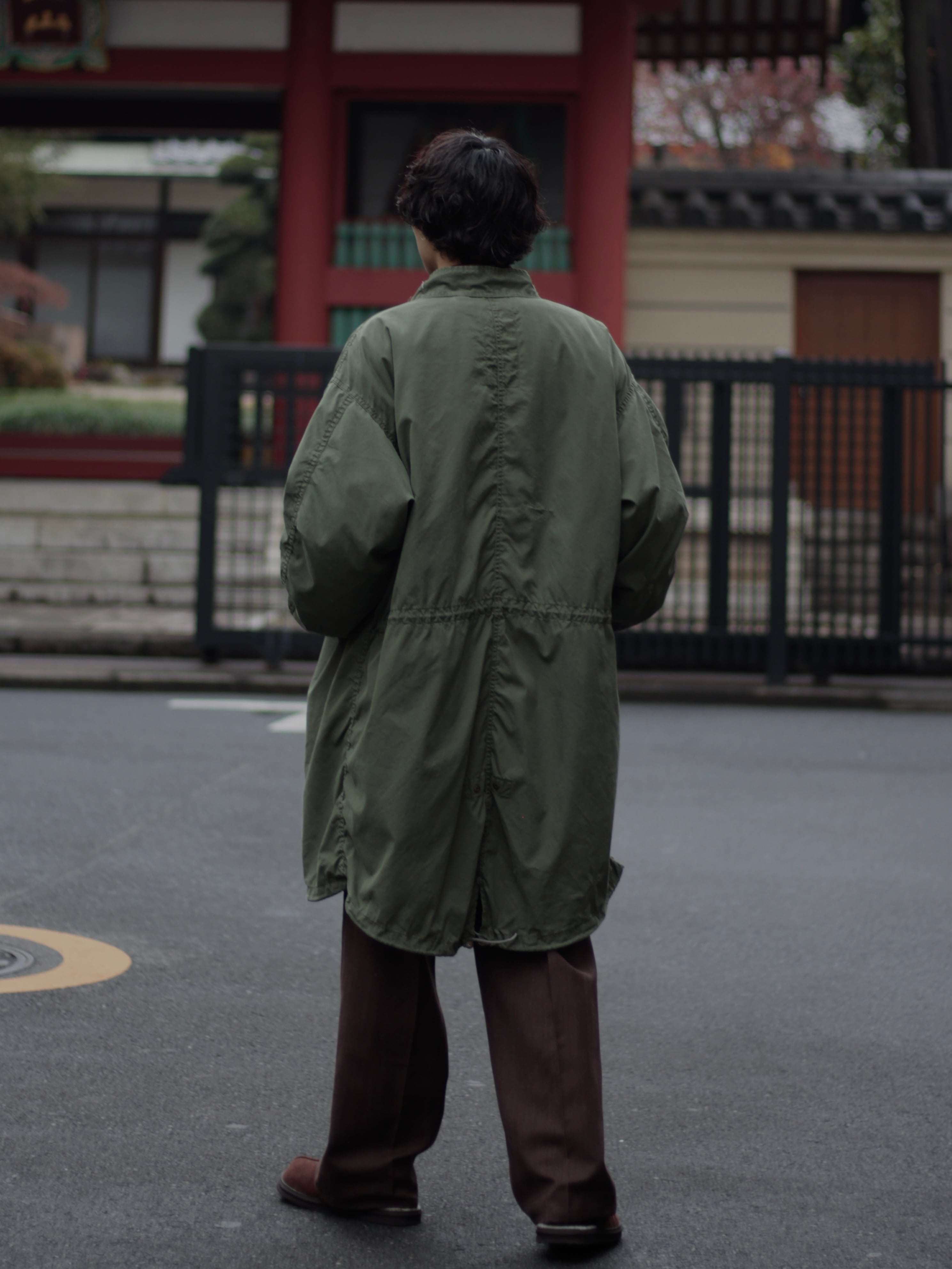 ファブリックはコットンとナイロン混紡のタフなシェル生地に、特徴的なフィッシュテールシルエット。