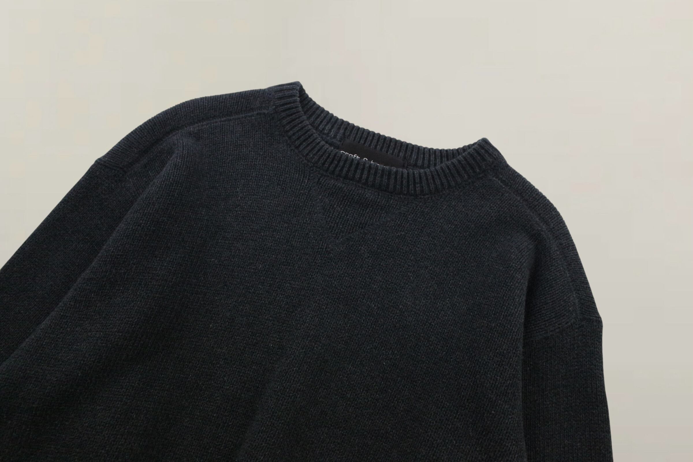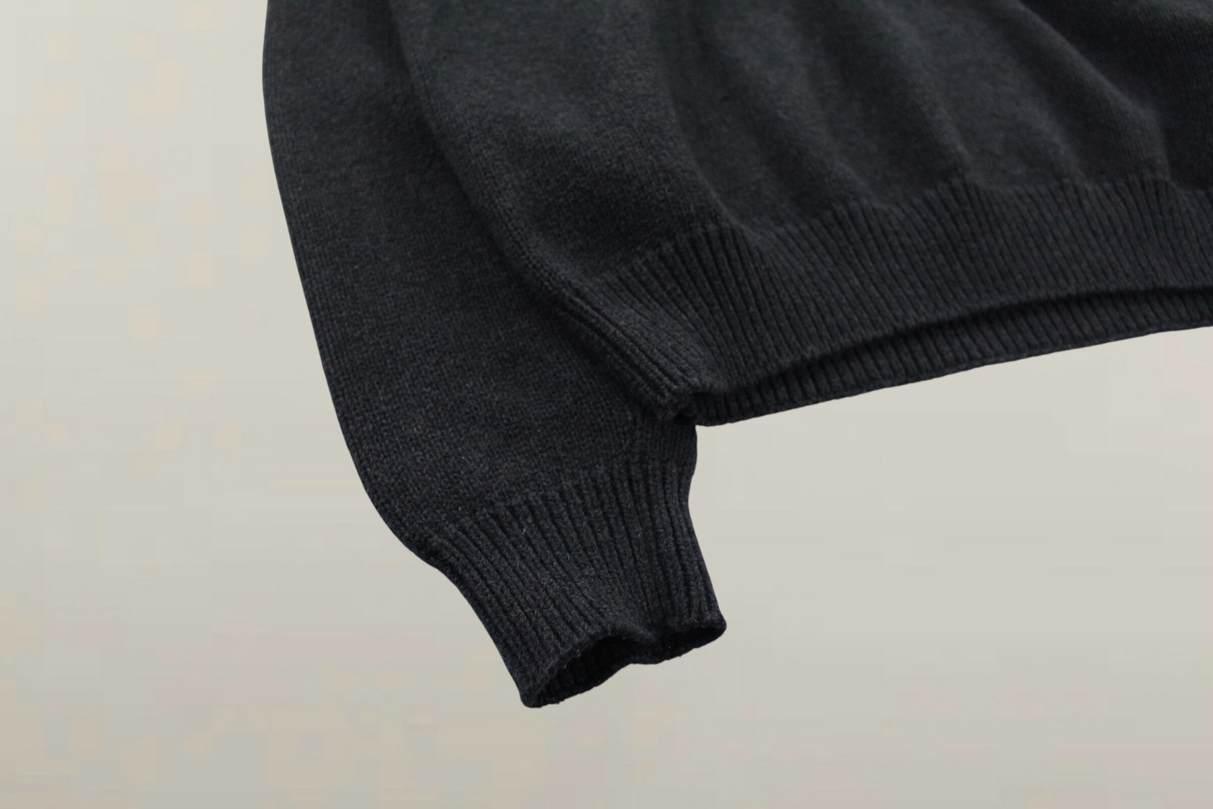 洒落てるるチャコールグレーカラーがコットンニットならではのカジュアルさが程良く削ぎ落とされた良い雰囲気。