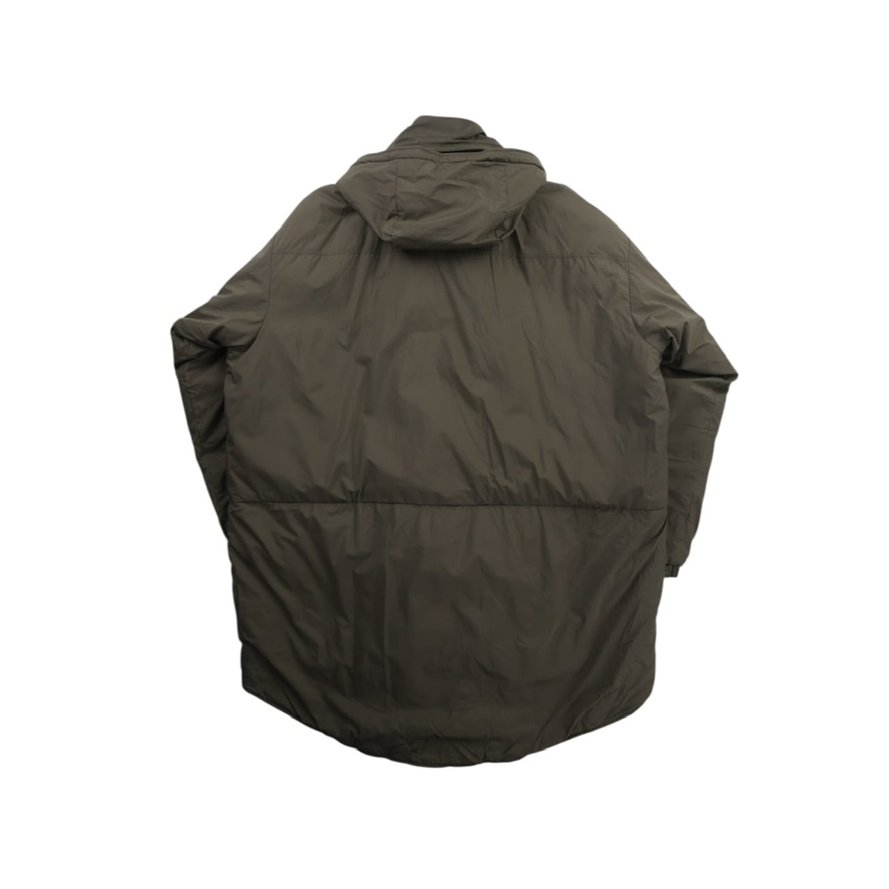 無駄なデザインの無いシンプルな見た目に丸みを帯びたボリュームのあるシルエット、フードは被っても違和感のない大きなサイズ感且つ、収納したままでも、出したままでもサマになる見た目。(中々フード収納可のアウターでどちらの状態でも格好の良い物は多くはないかと)