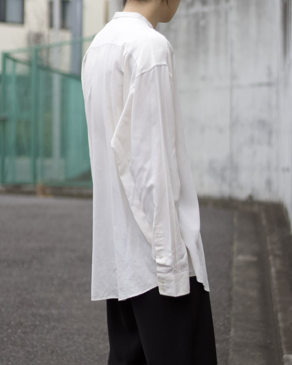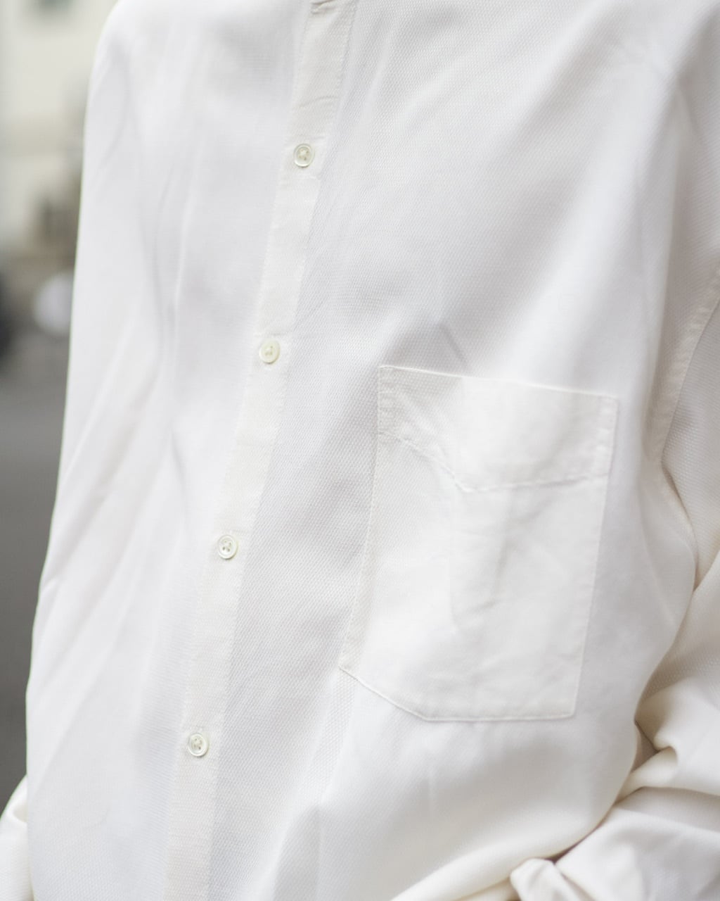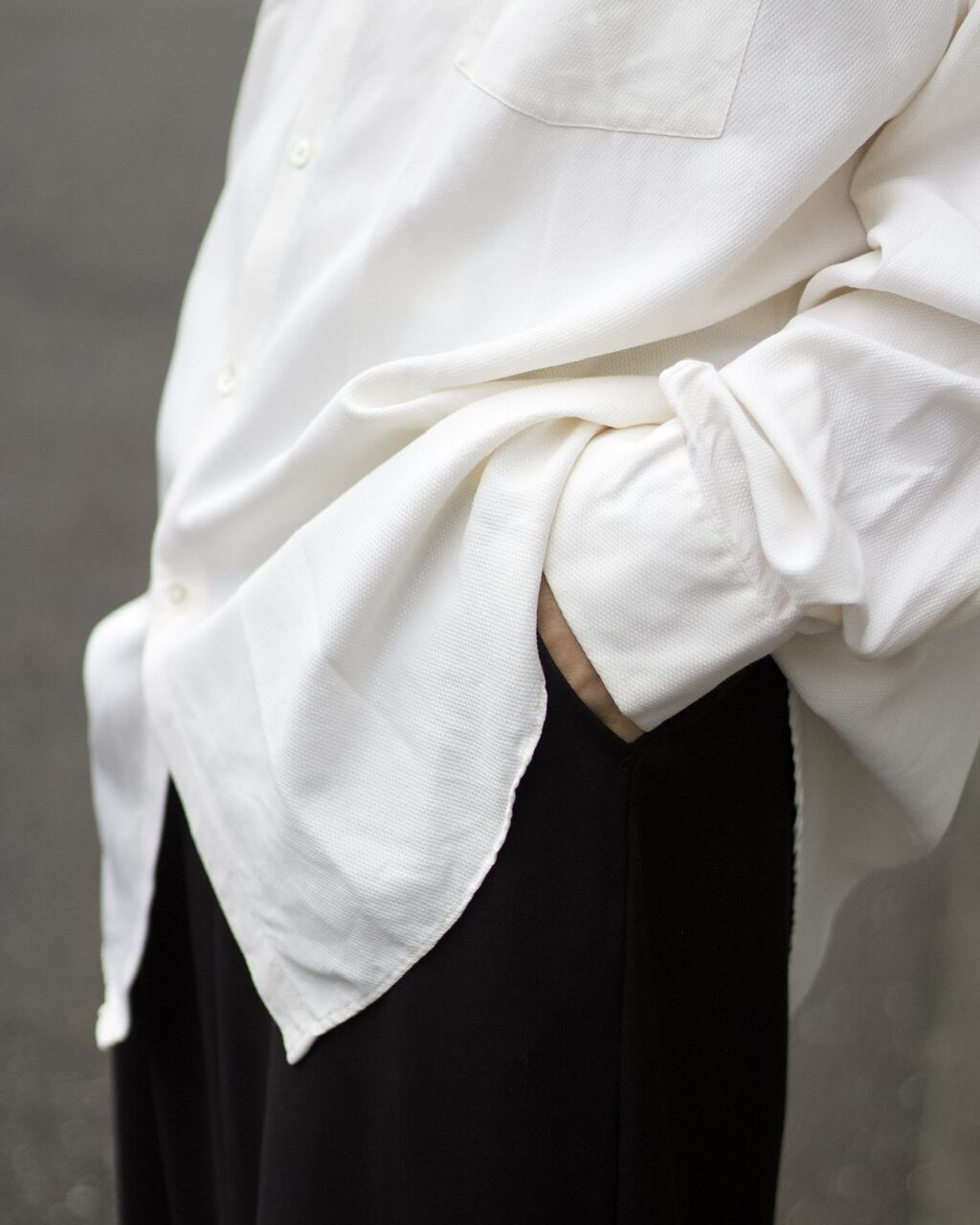 このシャツの上品な綺麗な感じをゆるっとしたサイズ感で外してあげるとグッとコーディネートが楽しくなります。