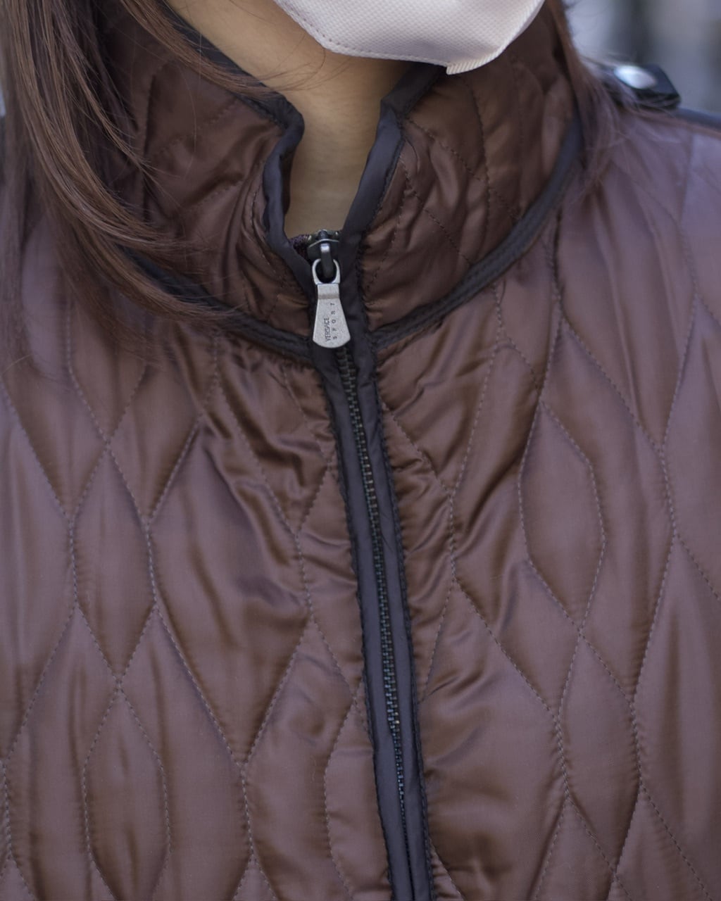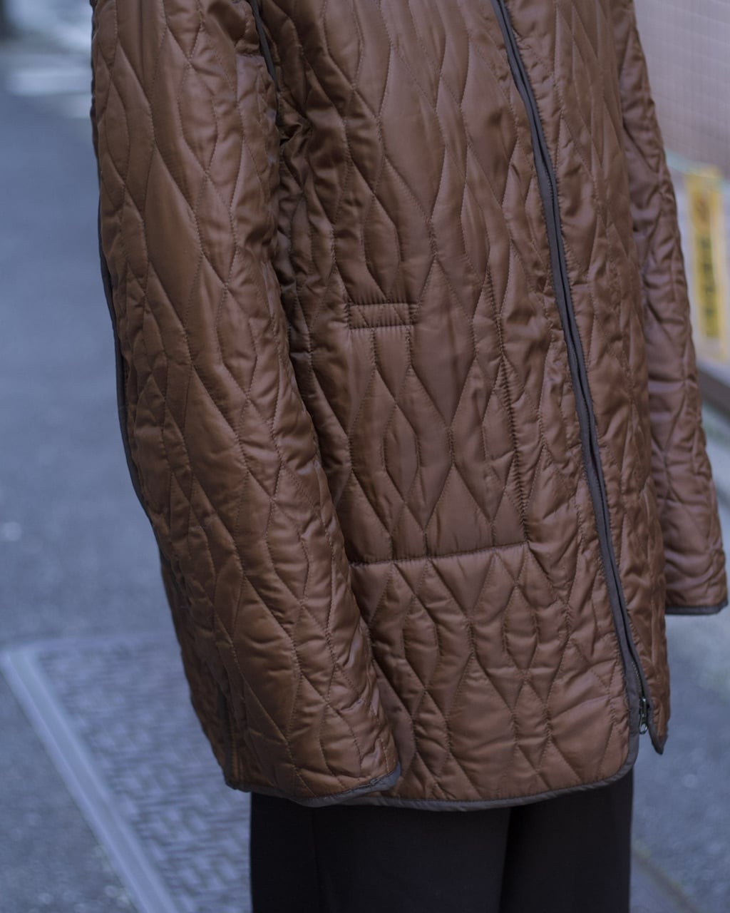 落ち着いたブラウンカラーに、立体感のあるダイヤ型キルティングが特徴的な一着!