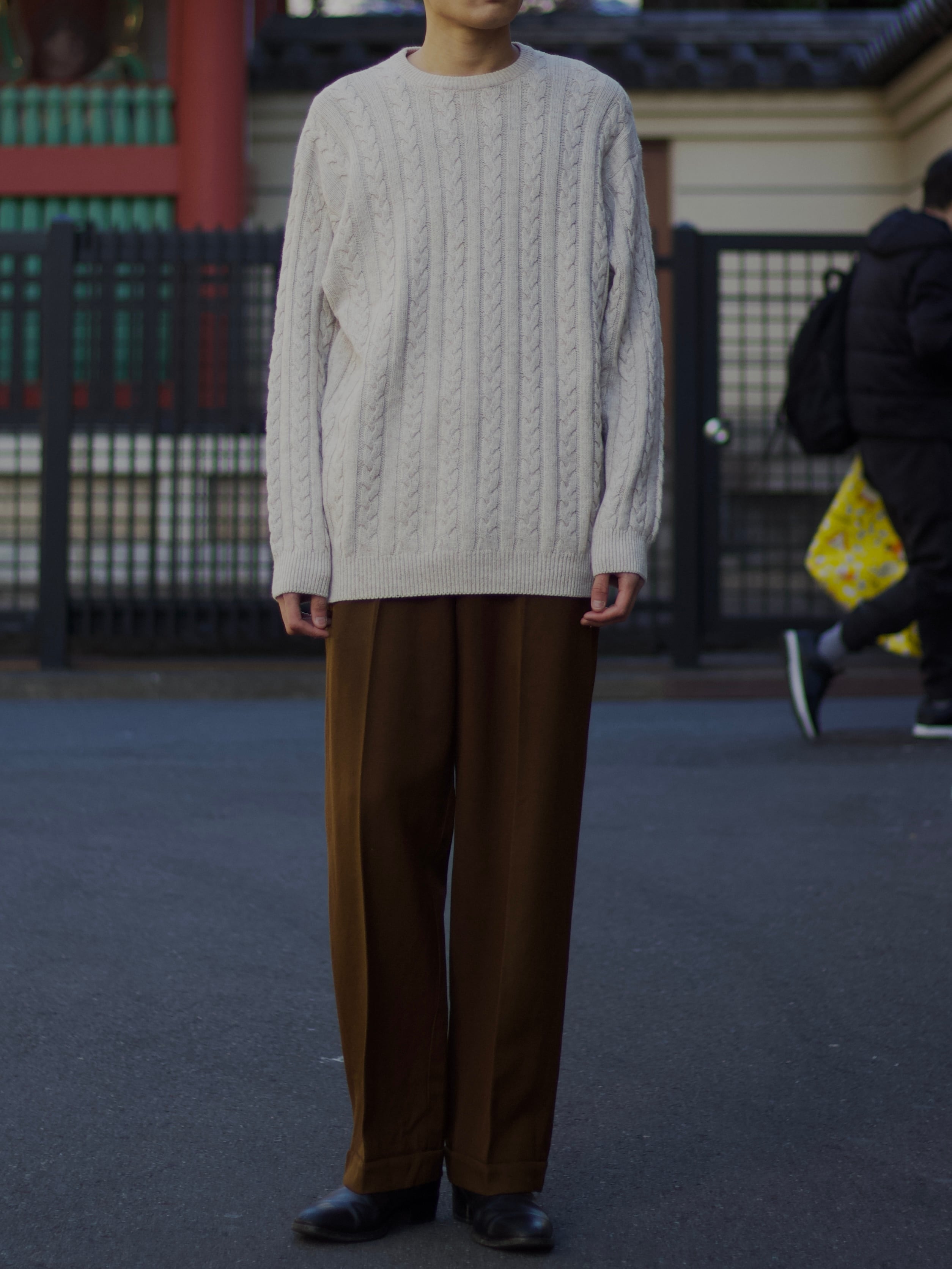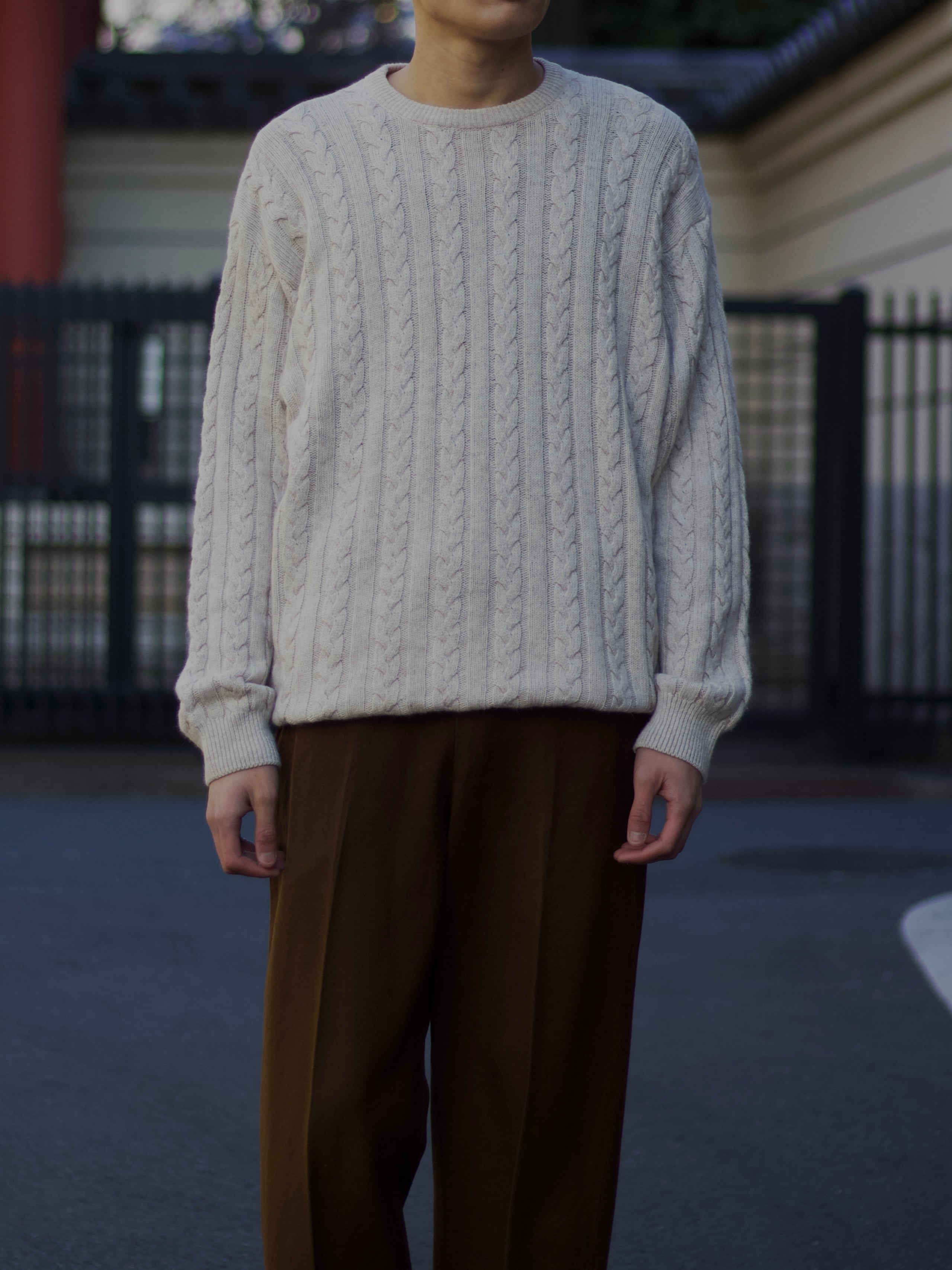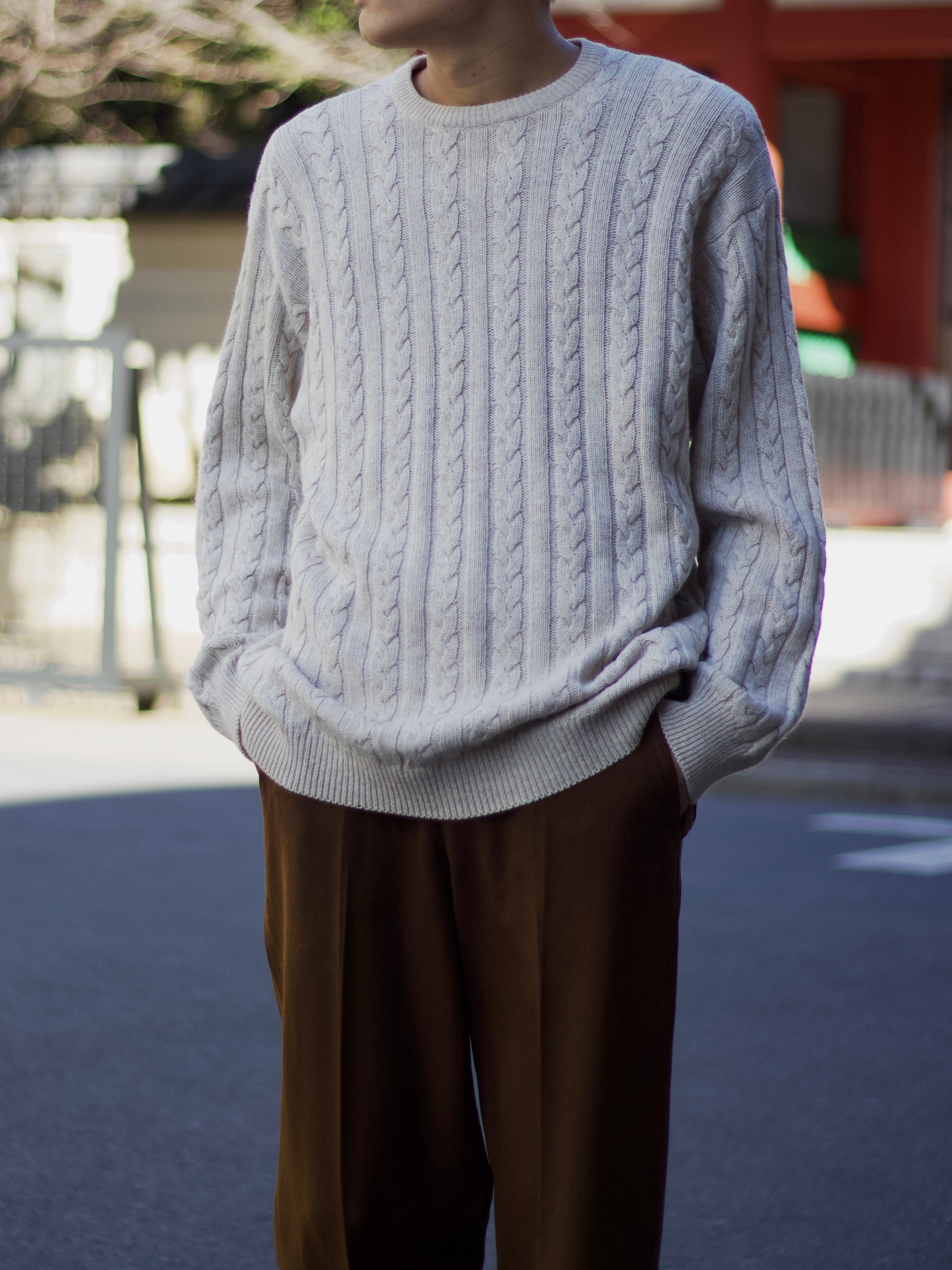 立体感のあるクラシカルなケーブル編みは80sらしい程よいボリューム感がありつつもライトベージュカラーのおかげで重たくなりすぎず大人っぽく品のある印象に。