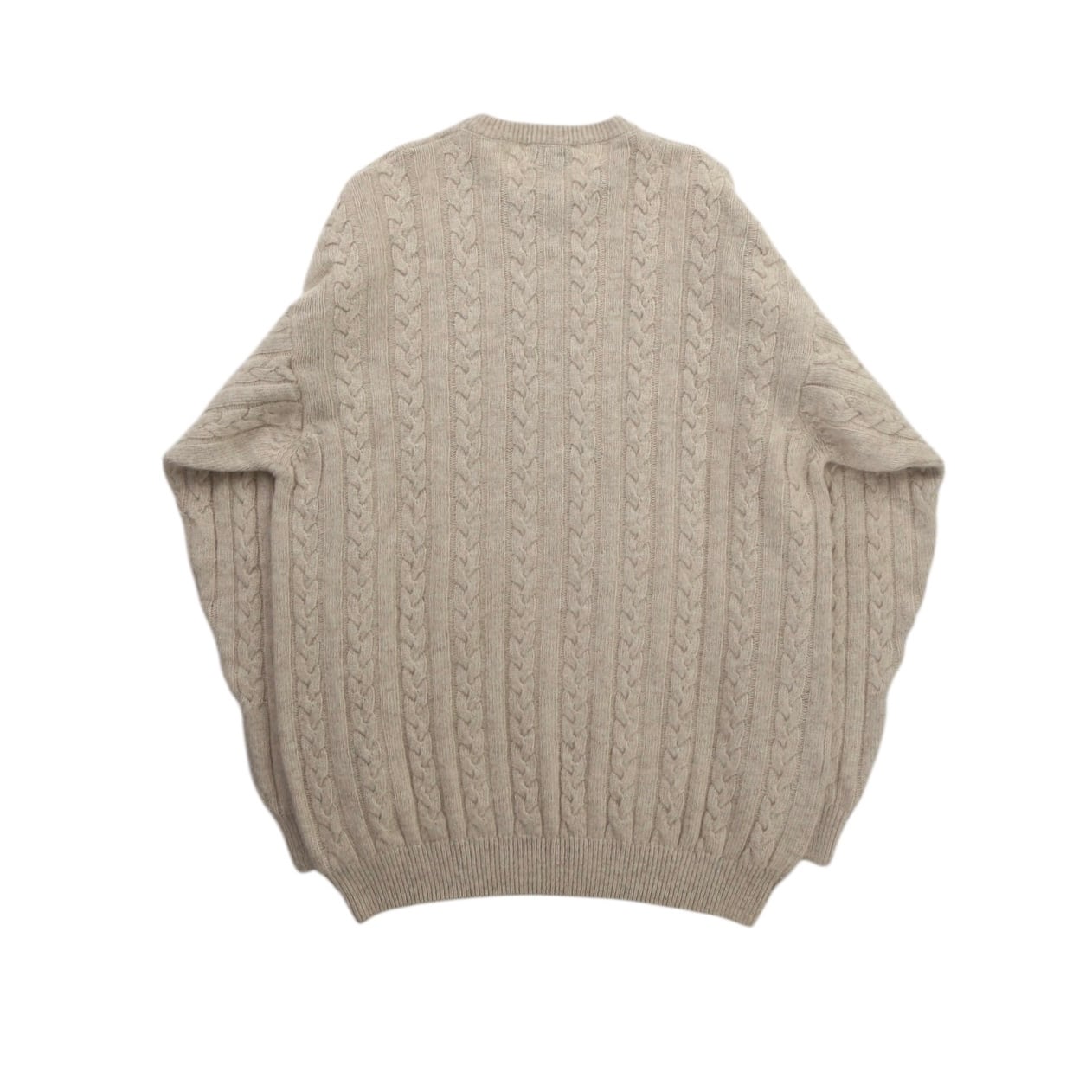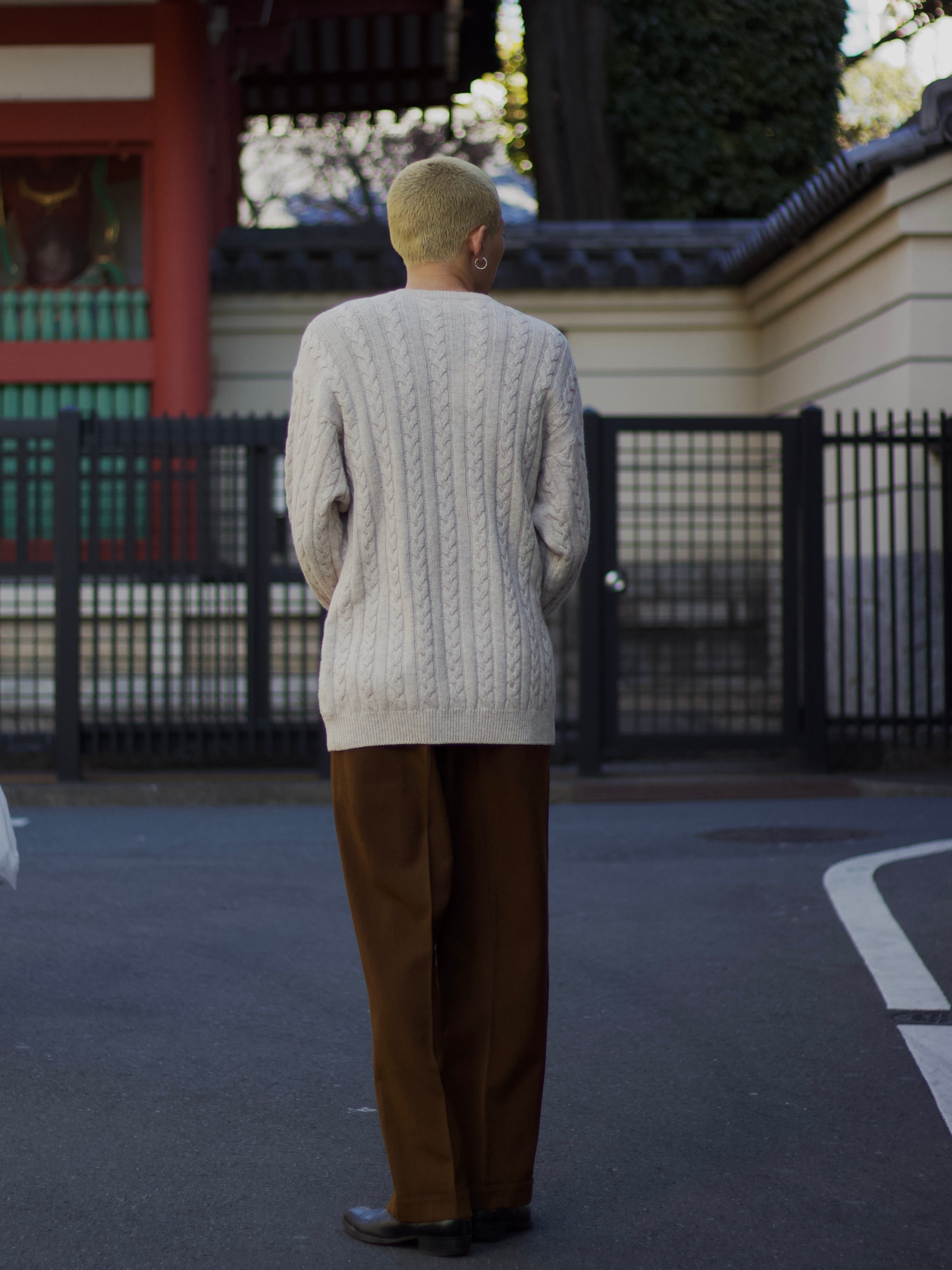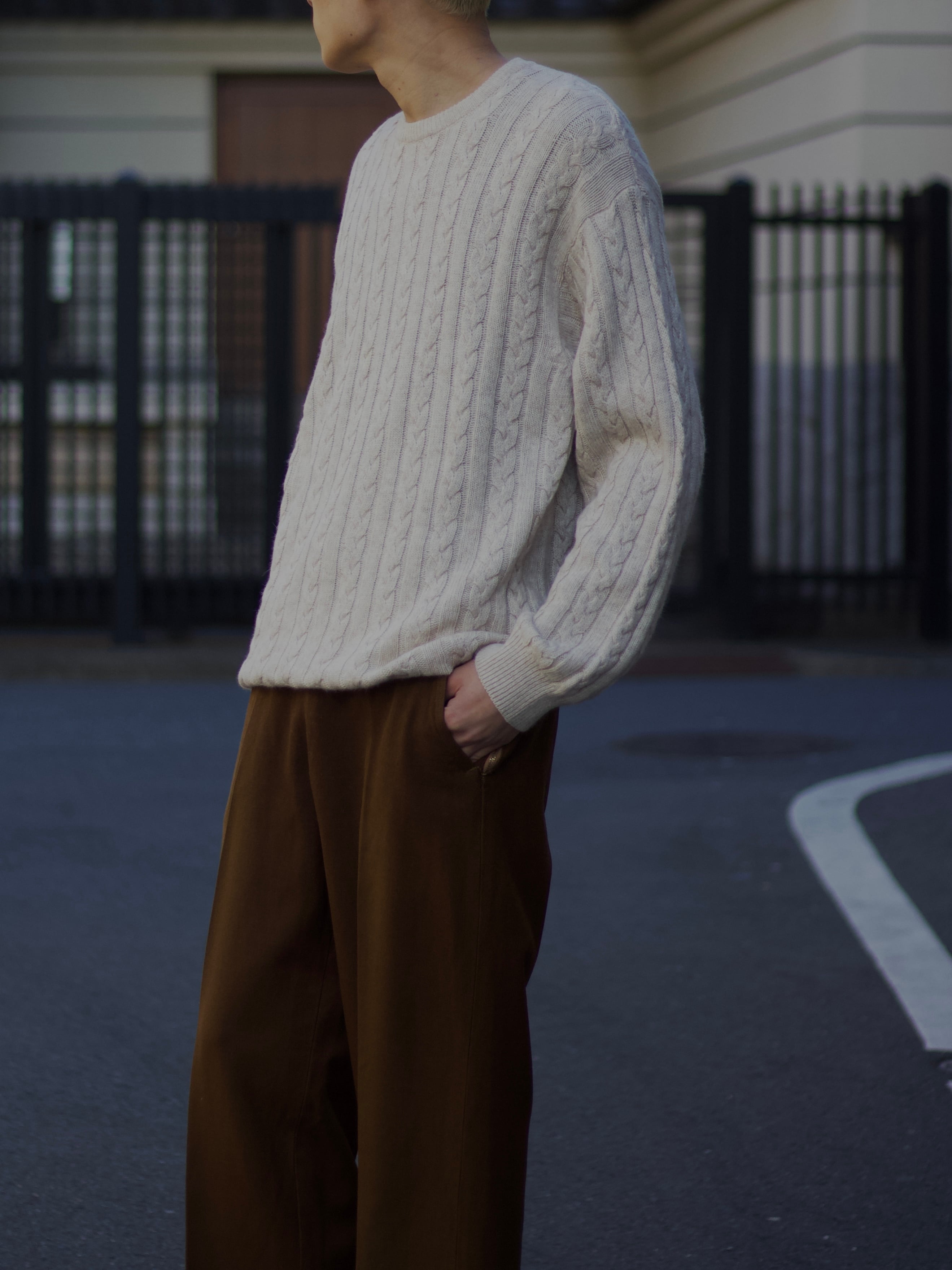 立体感のあるクラシカルなケーブル編みは80sらしい程よいボリューム感がありつつもライトベージュカラーのおかげで重たくなりすぎず大人っぽく品のある印象に。