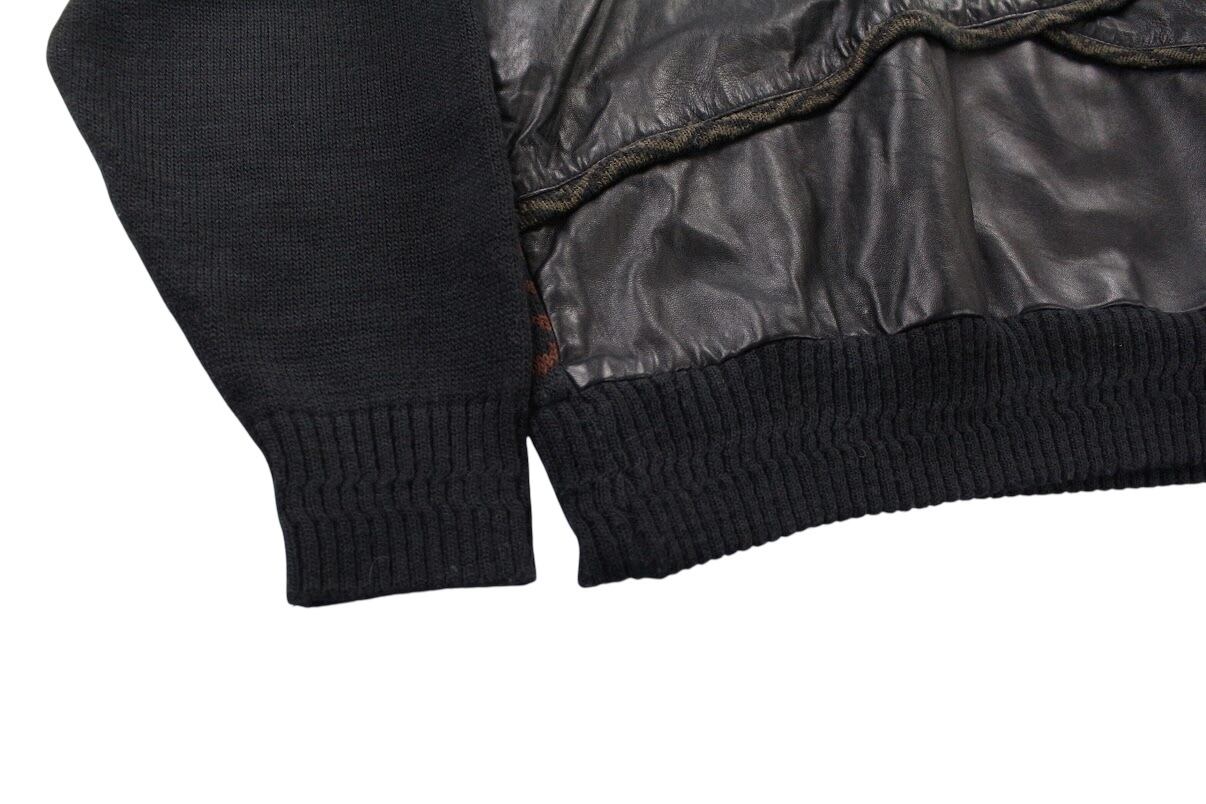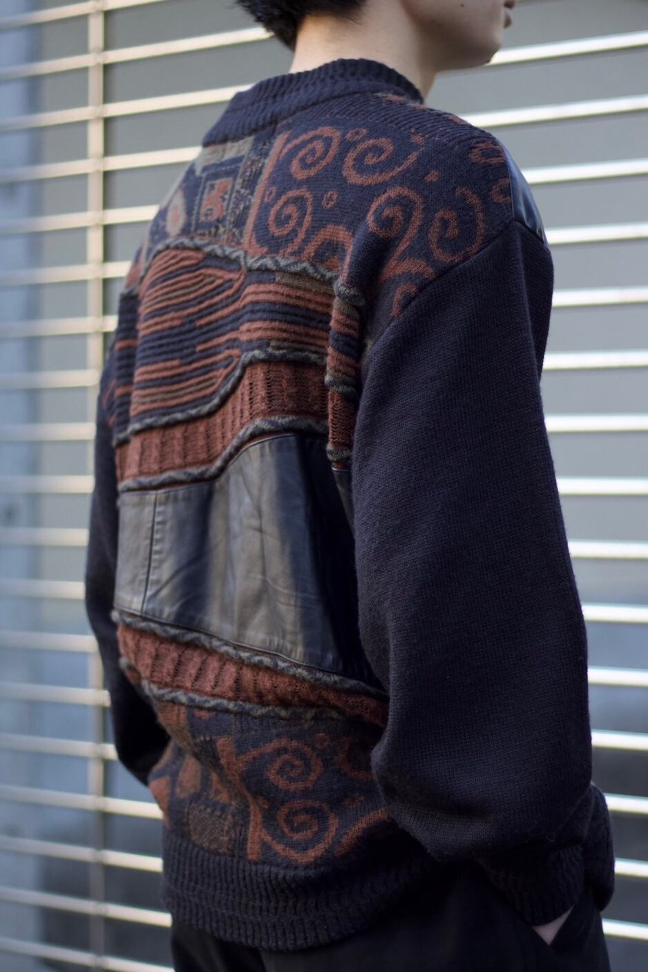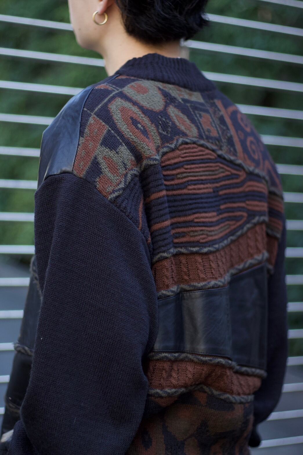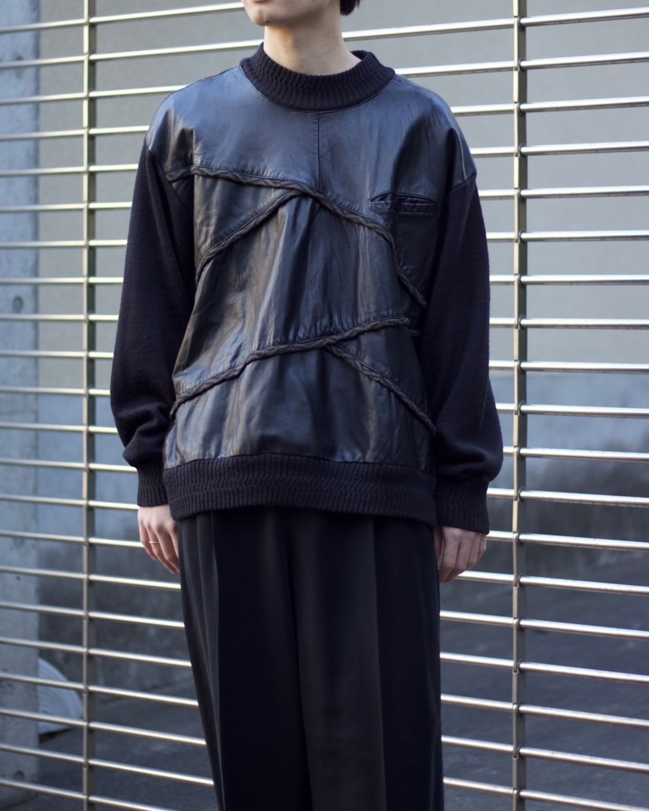 バックには、3Dニットと幾何学な柄が入っておりそこにプラスしてレザー。