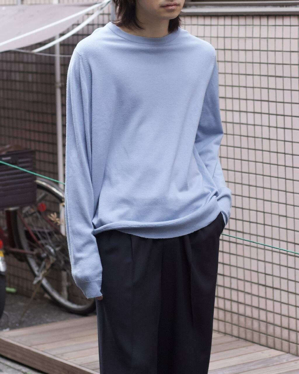水色のクルーネックニットが入荷。