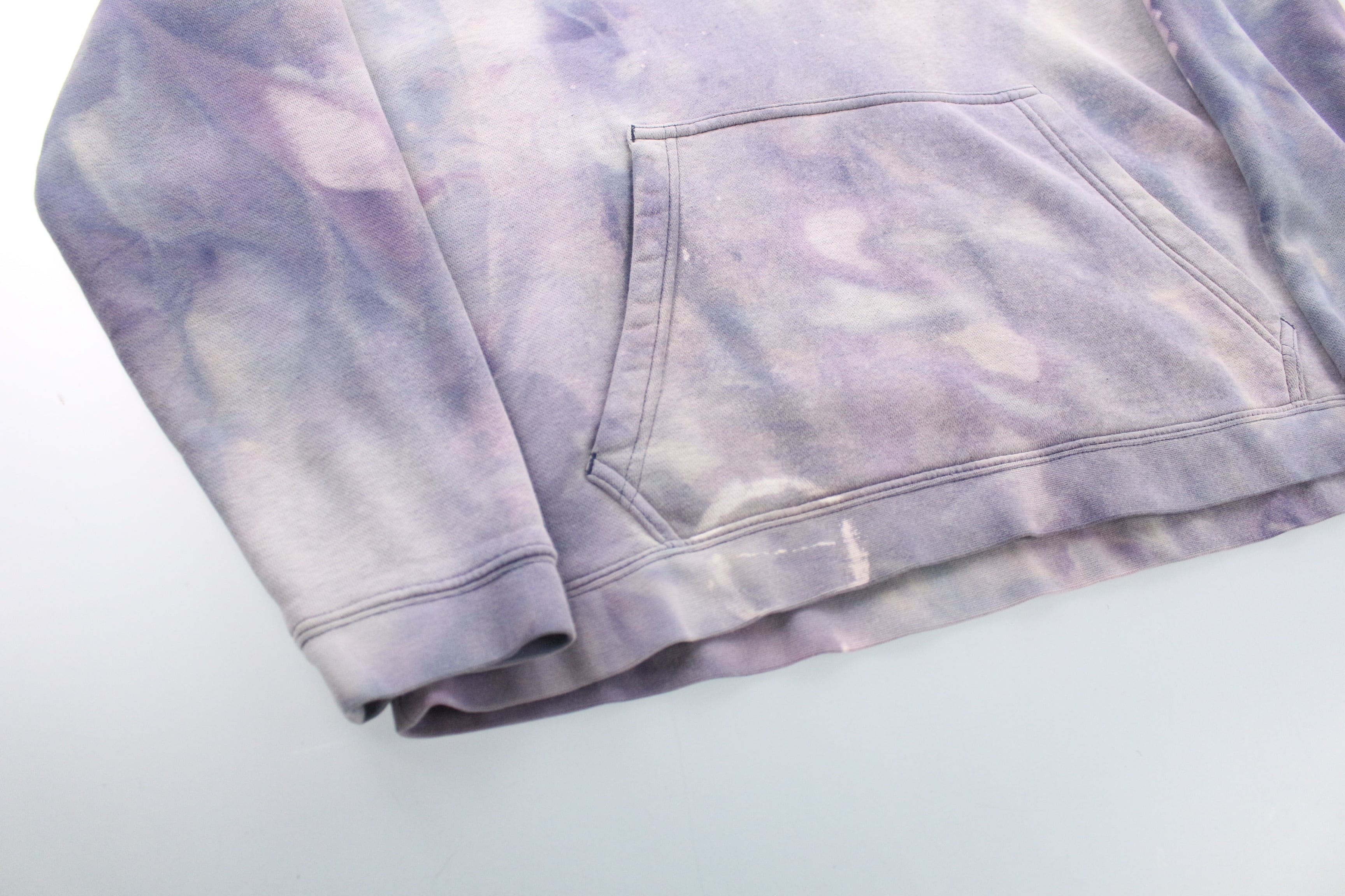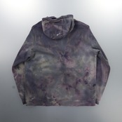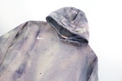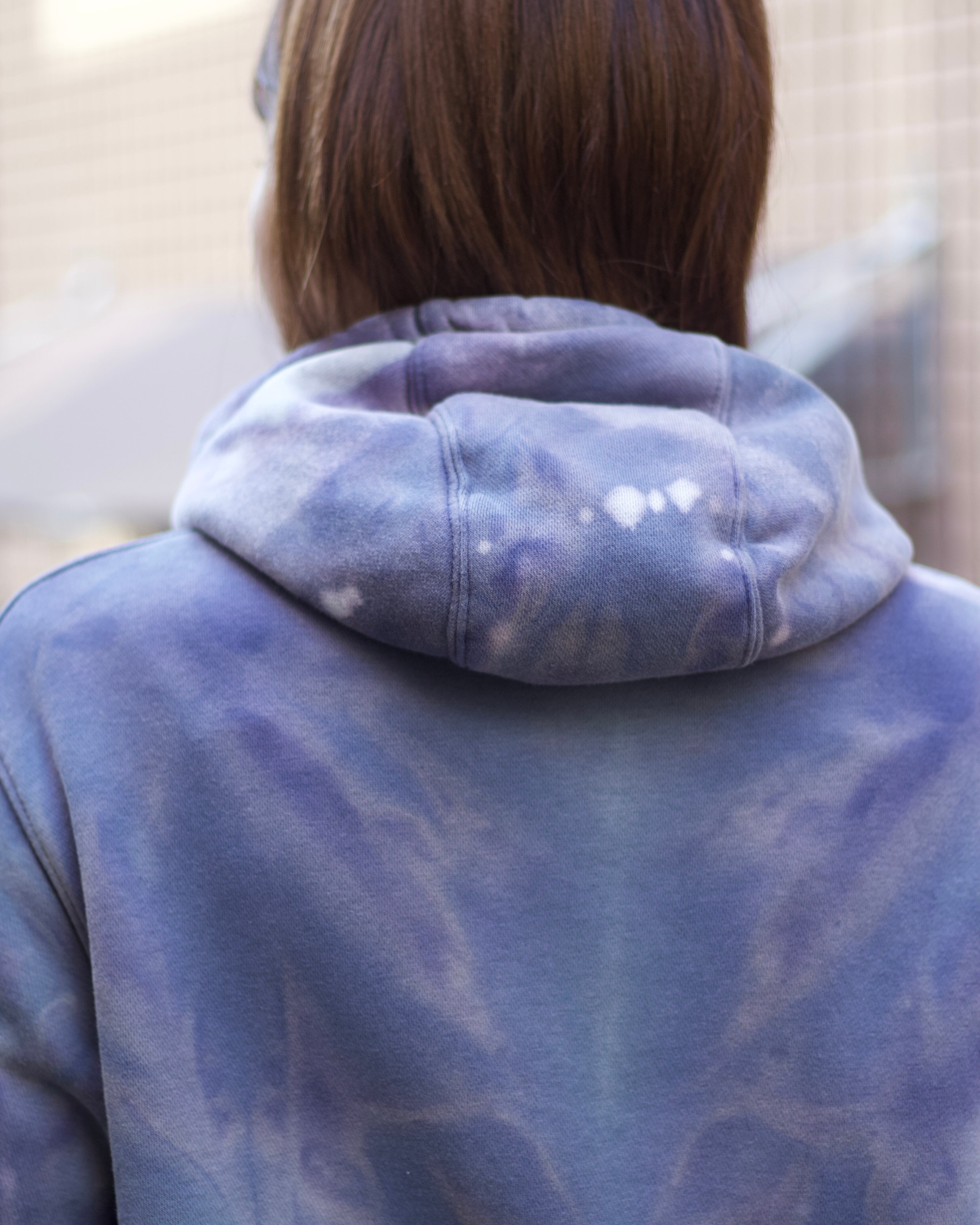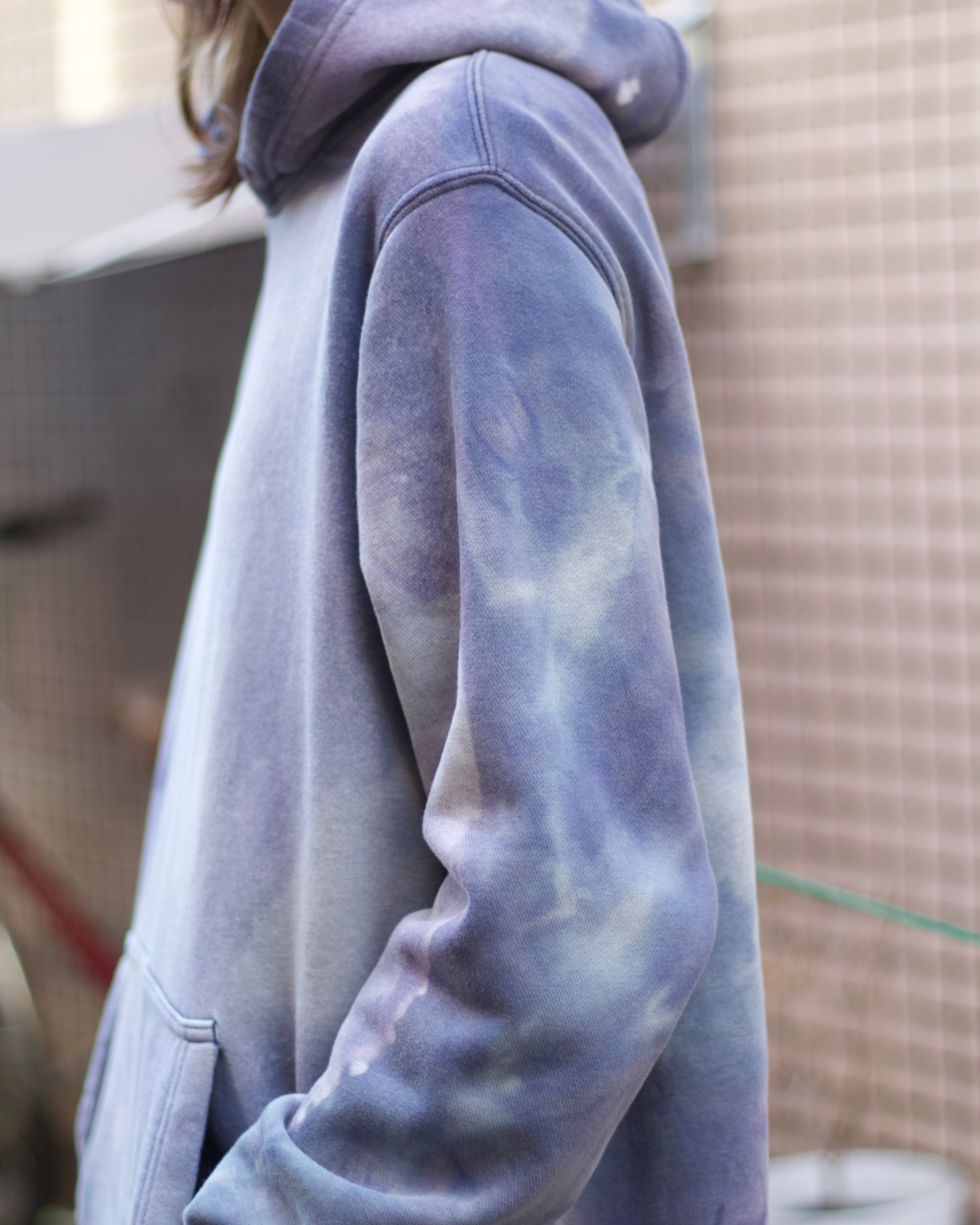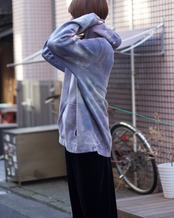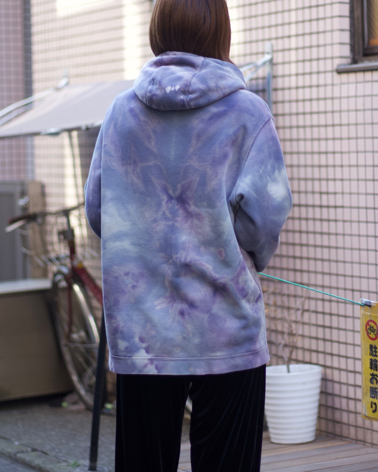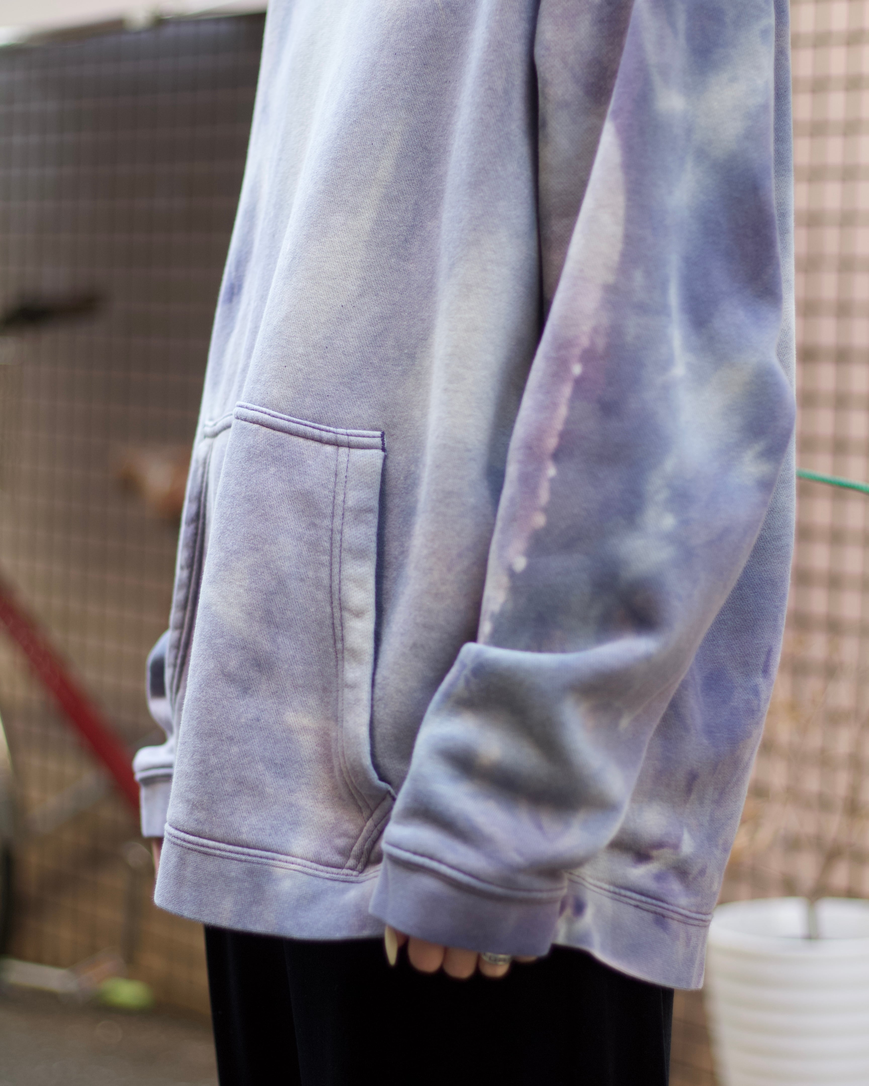 全体に施されたムラ感のあるタイダイ染めが特徴で、パープル・グレー・ブラックが混ざり合った雰囲気のある1着。