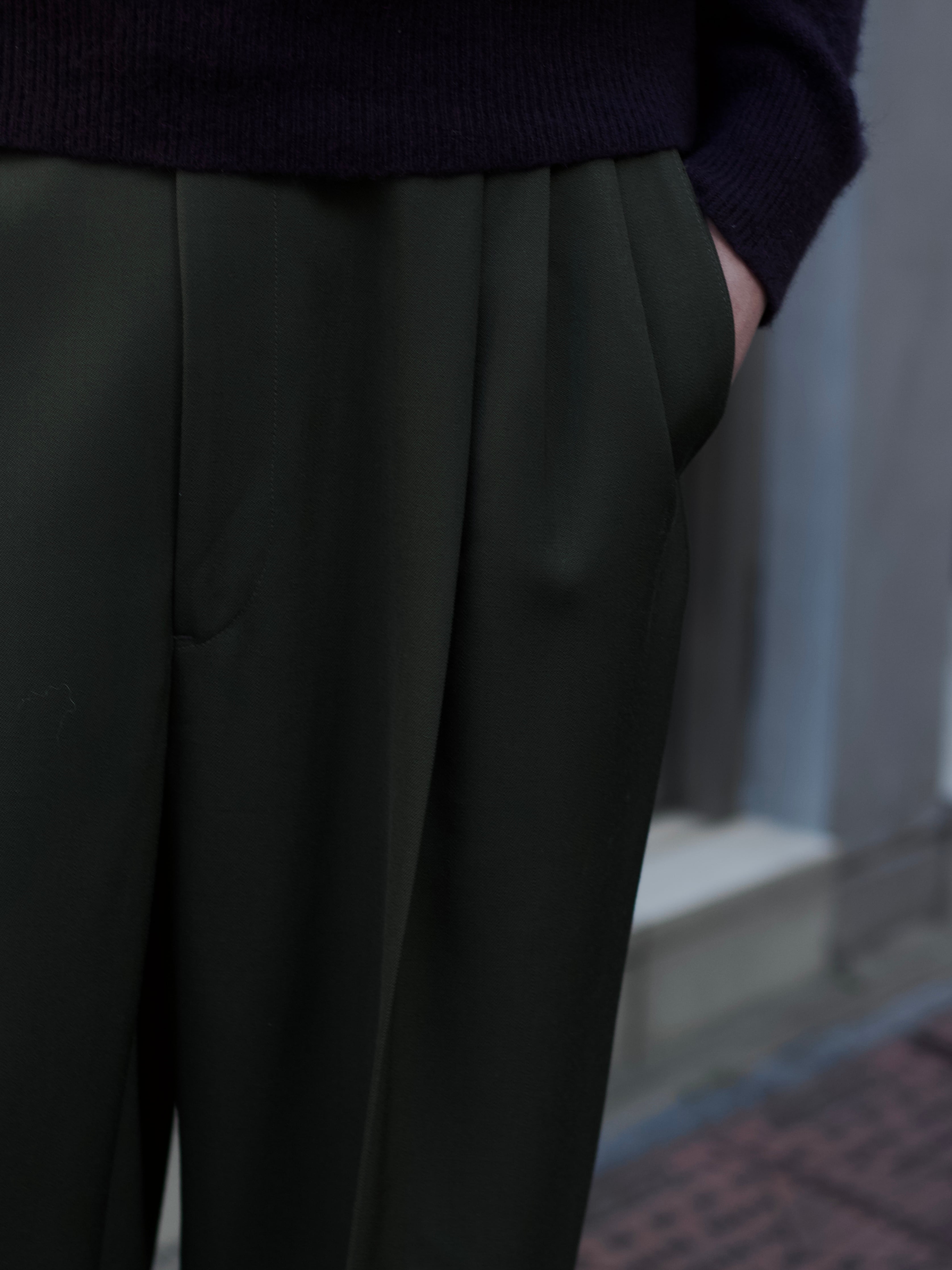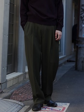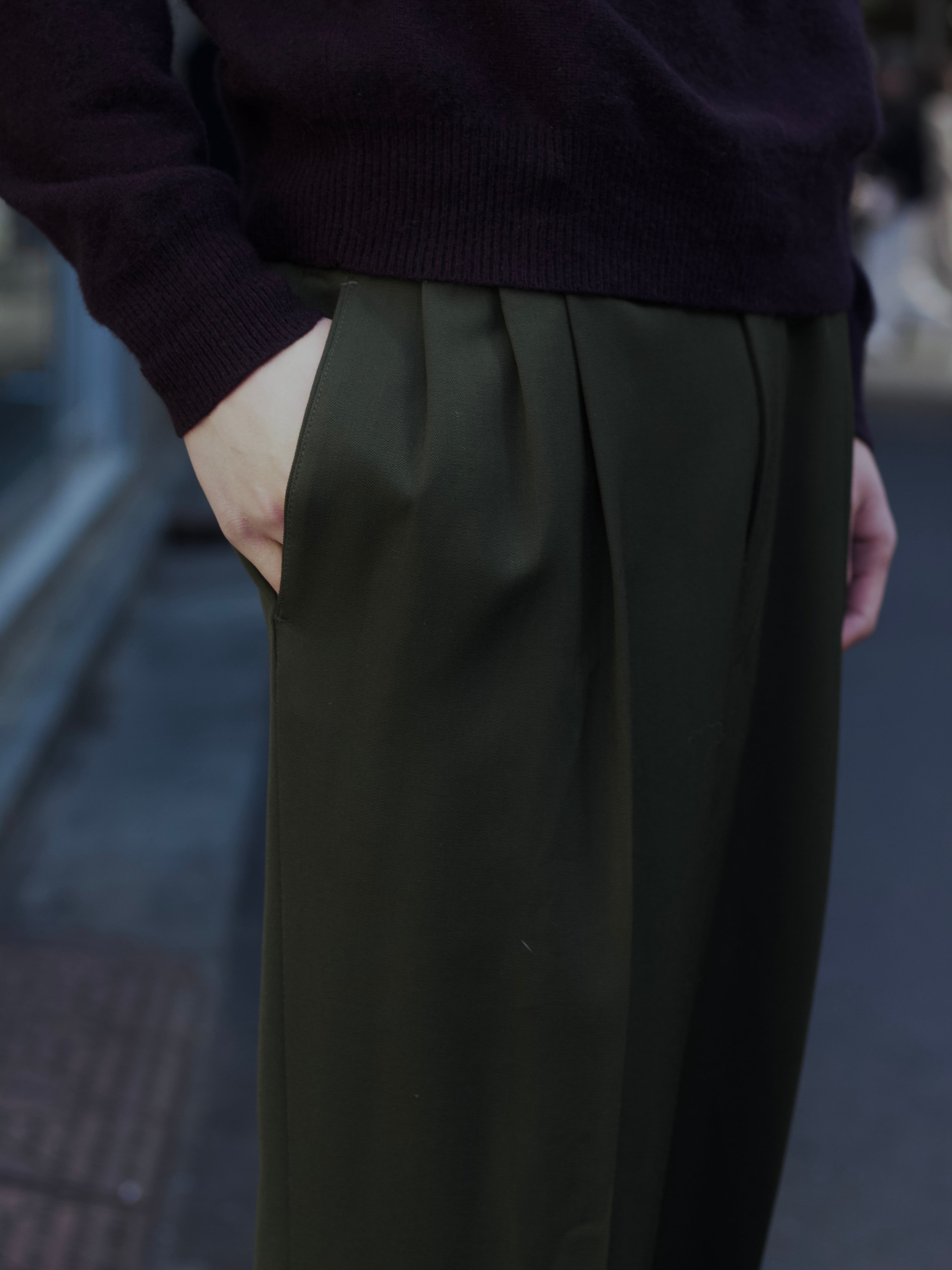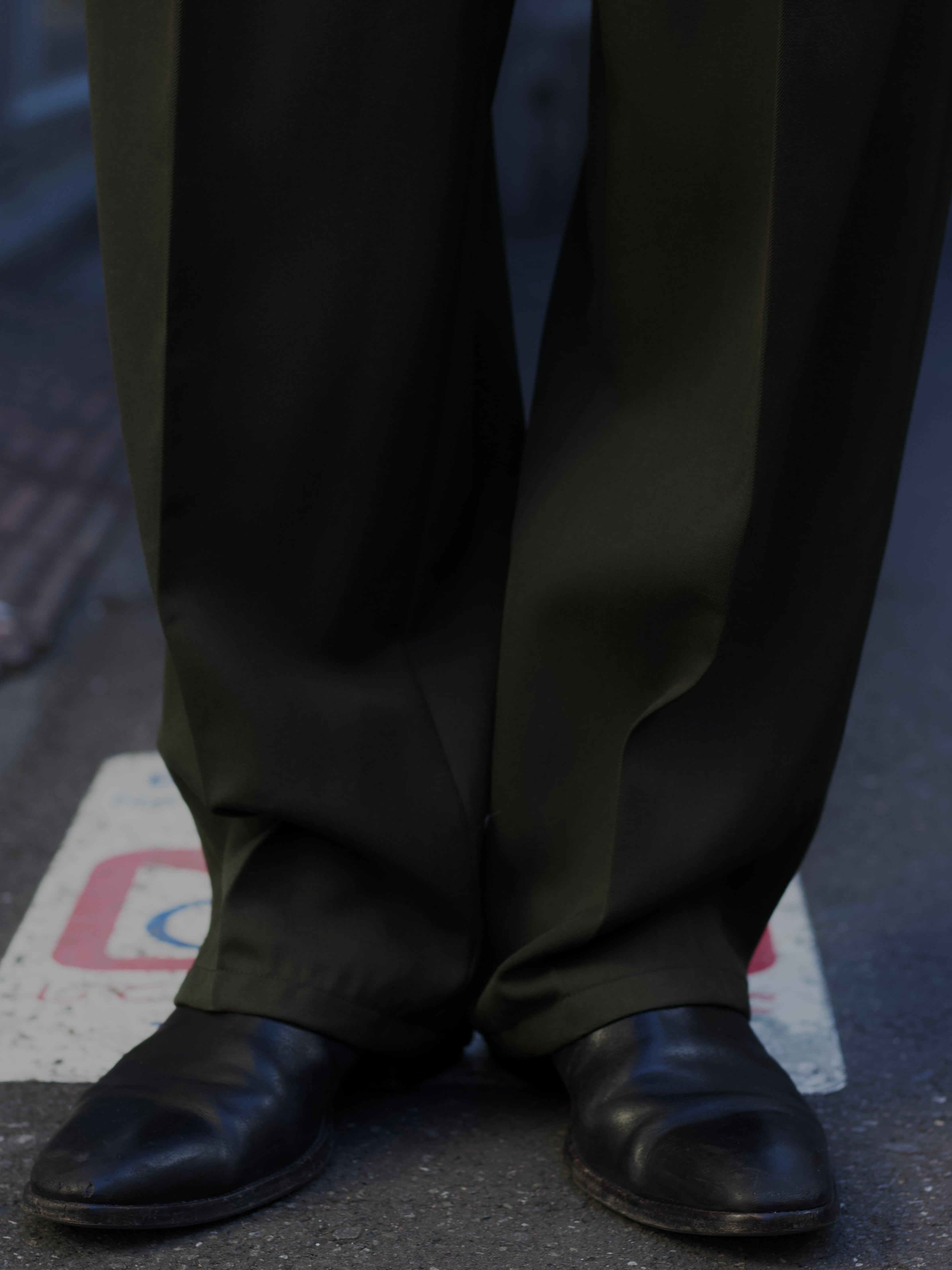 遠目で見たら軍パンに見える色味ではありますが、0距離くらいで群を抜いた雰囲気のスラックスのギャップ。