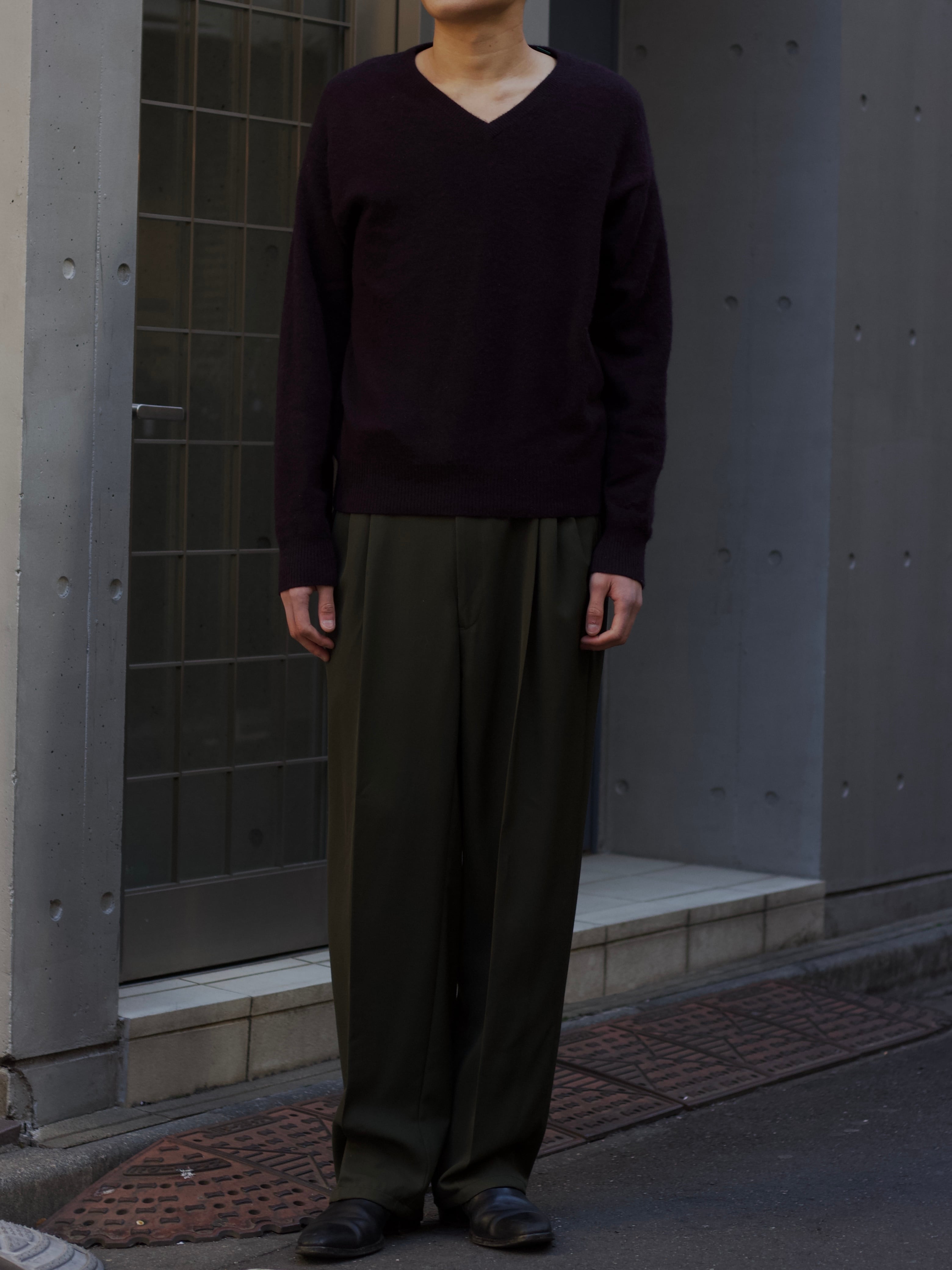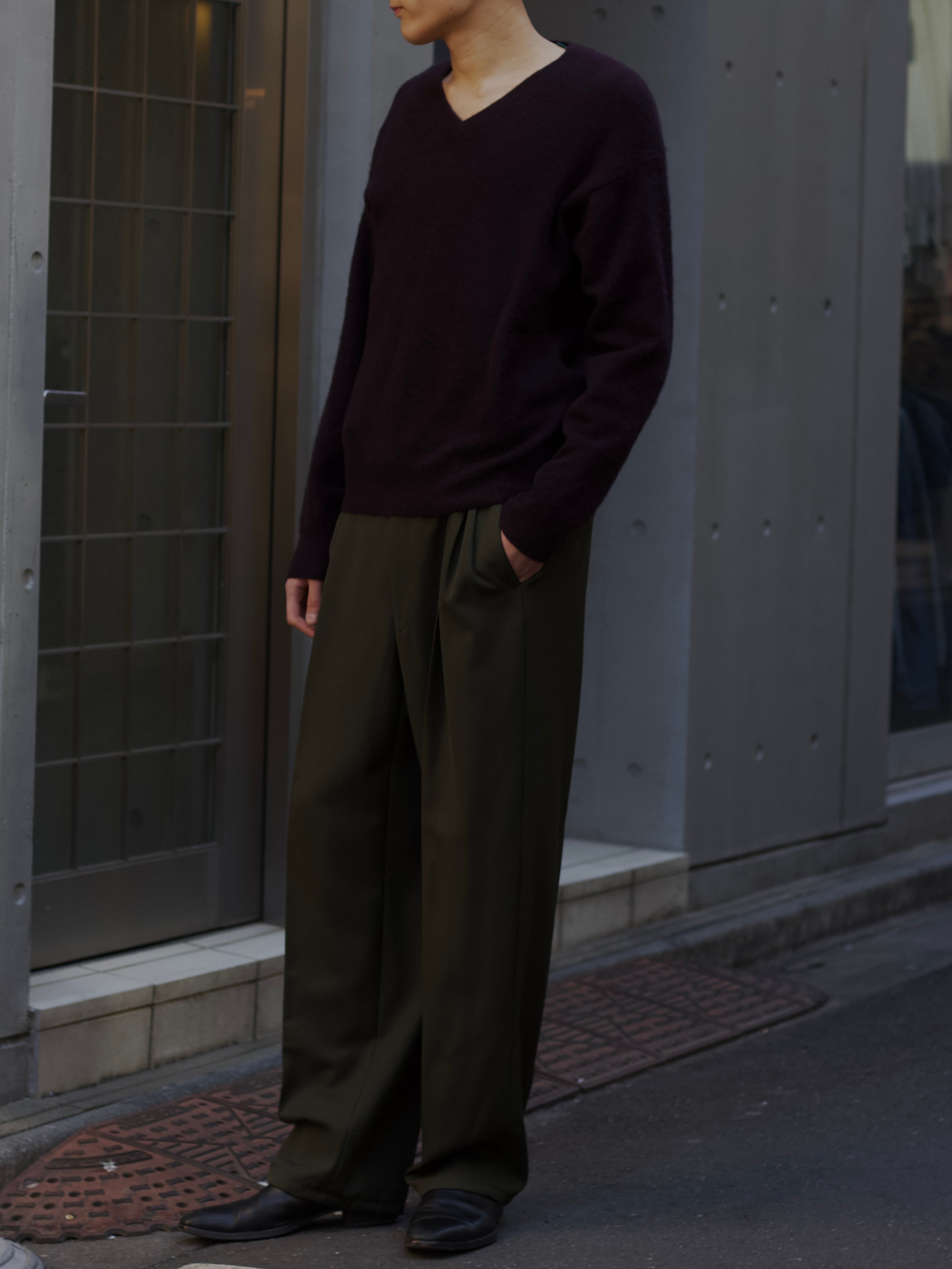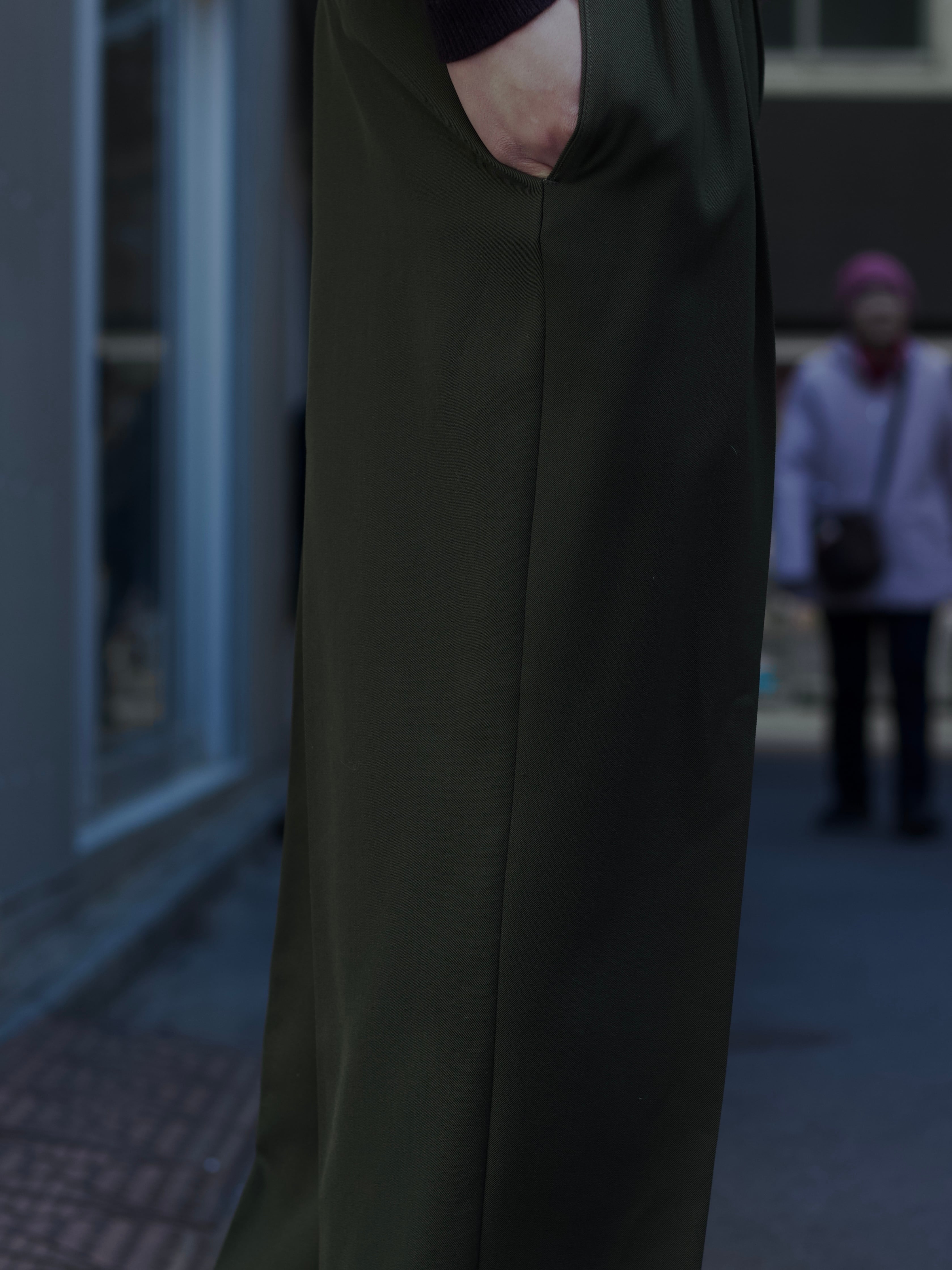 遠目で見たら軍パンに見える色味ではありますが、0距離くらいで群を抜いた雰囲気のスラックスのギャップ。