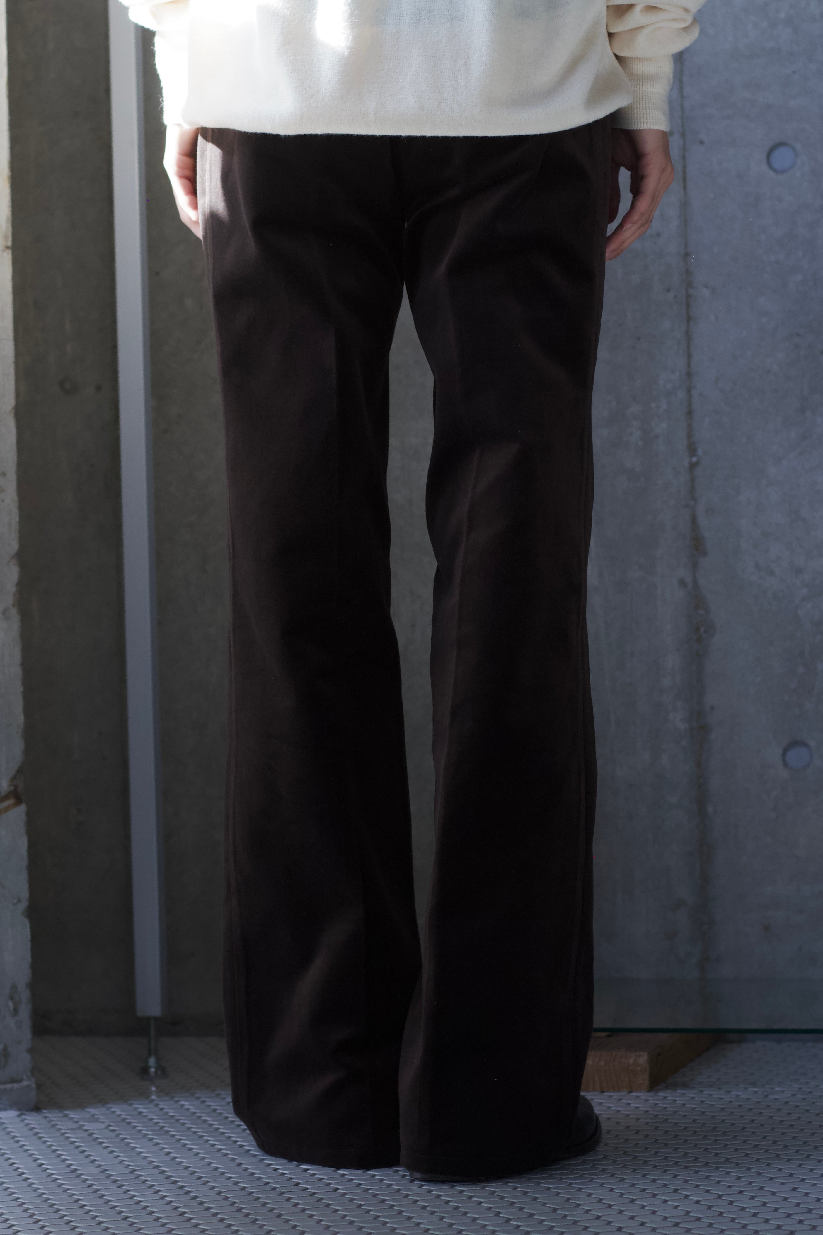 膝の絞りが無く、裾に向かって緩やかに広がるフレアシルエットは着用時の見た目もやり過ぎず、トップスも合わせやすい汎用性の高さが魅力☺︎