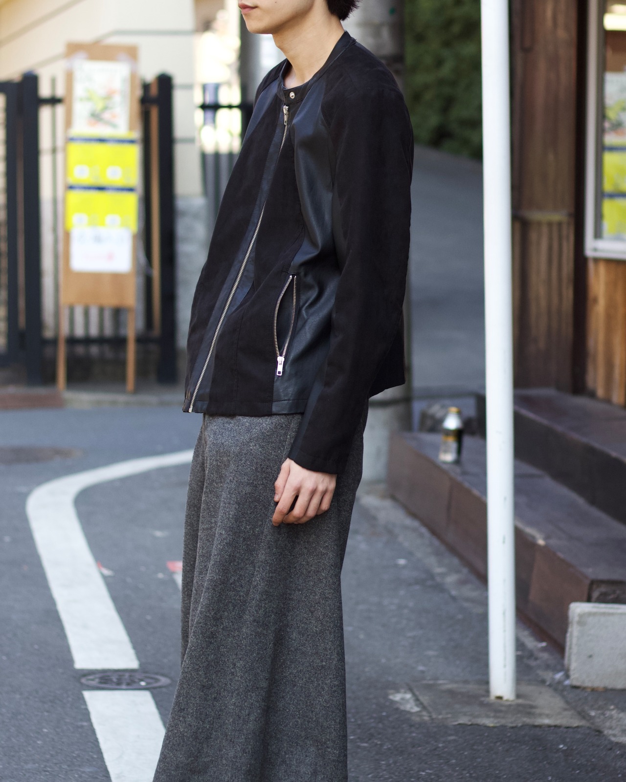 フェイクレザーとフェイクスエード、質感の異なる二つの表情を組み合わせた、デザイン性の高いジャケットが入荷しました。