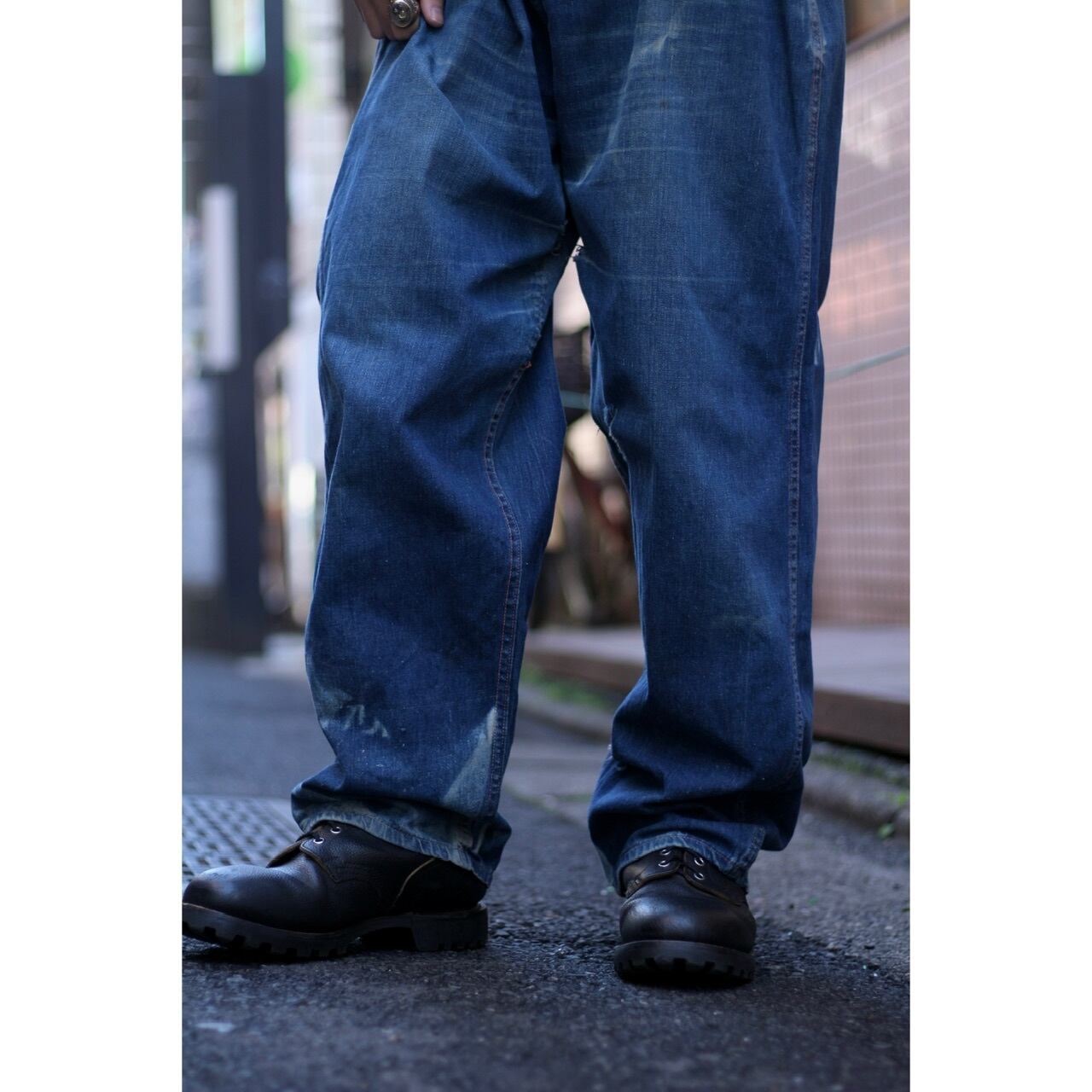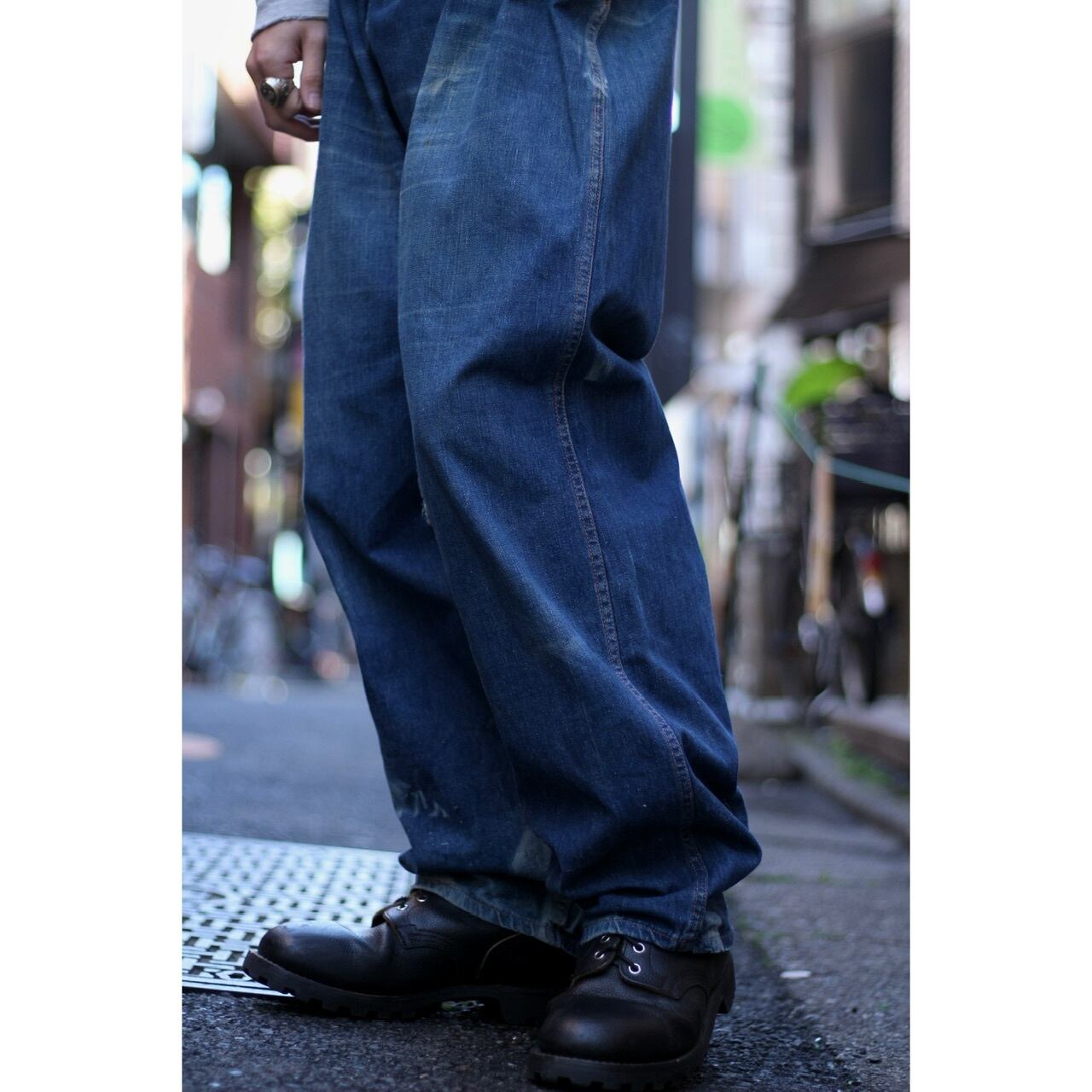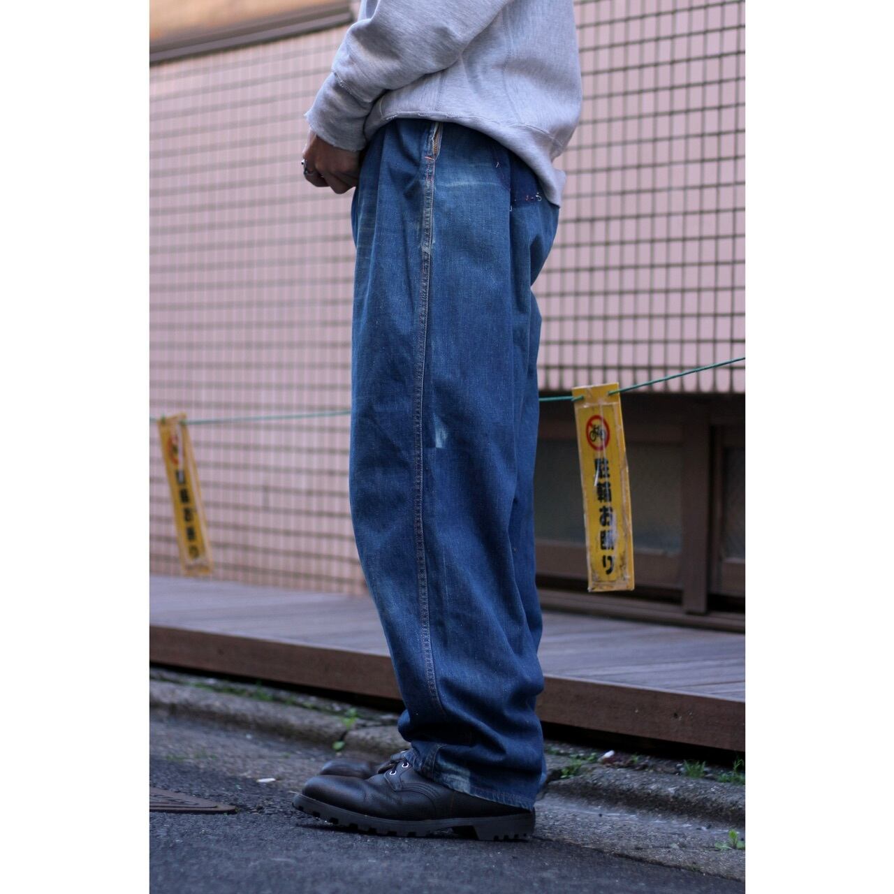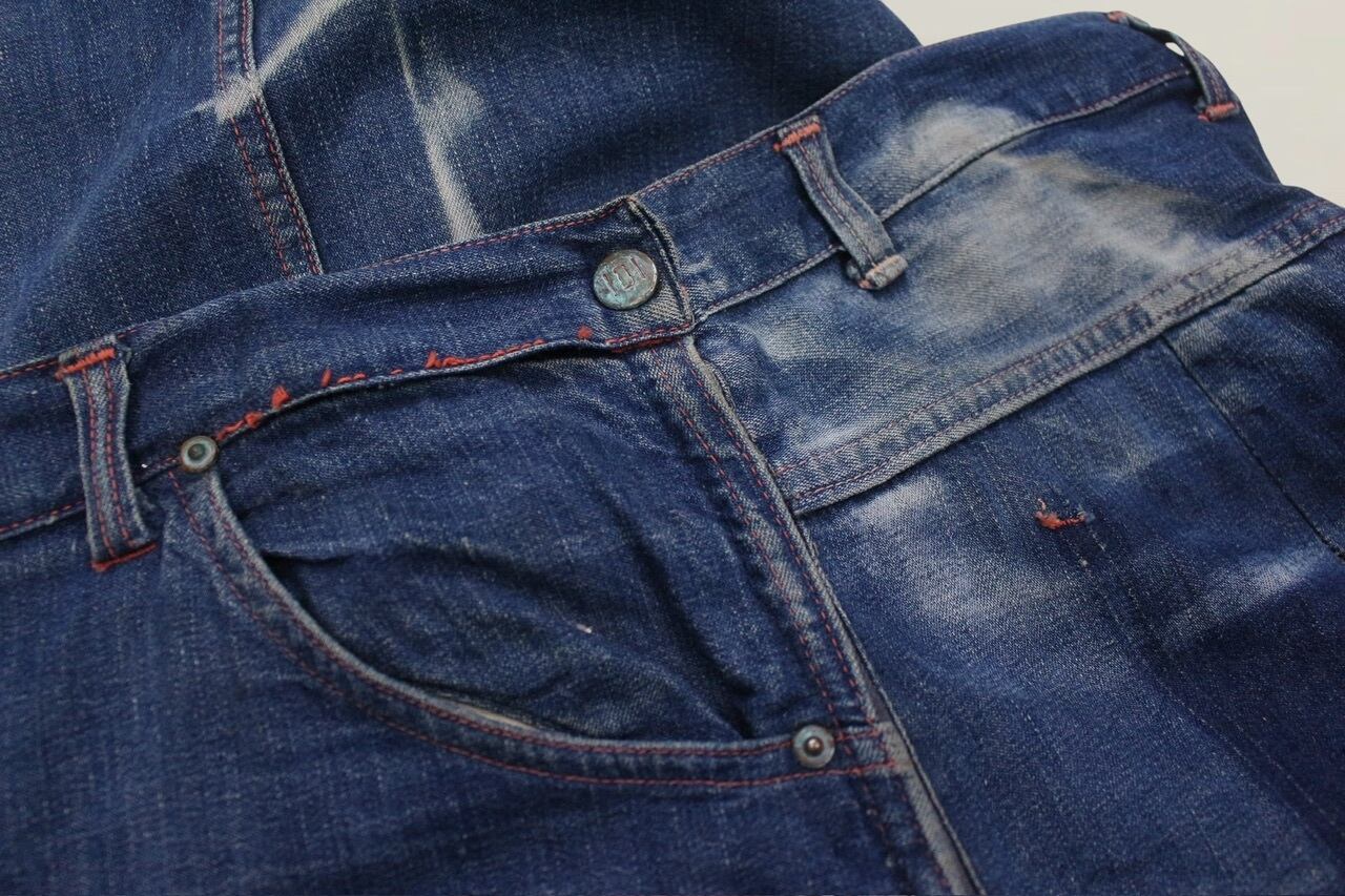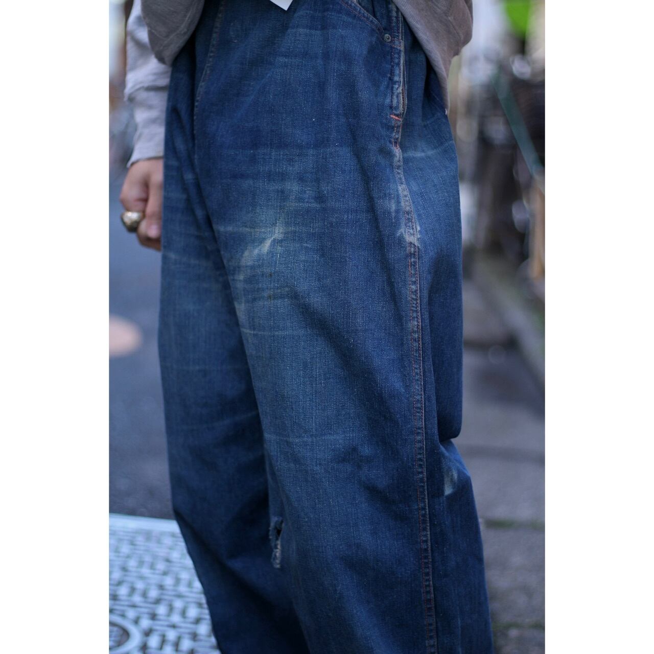 ライトオンスなデニム生地で、天然のインディゴの縦落ちが美しくそこに入るオレンジステッチ。軽やかで裾に向かってのテーパードシルエットが綺麗な一本です