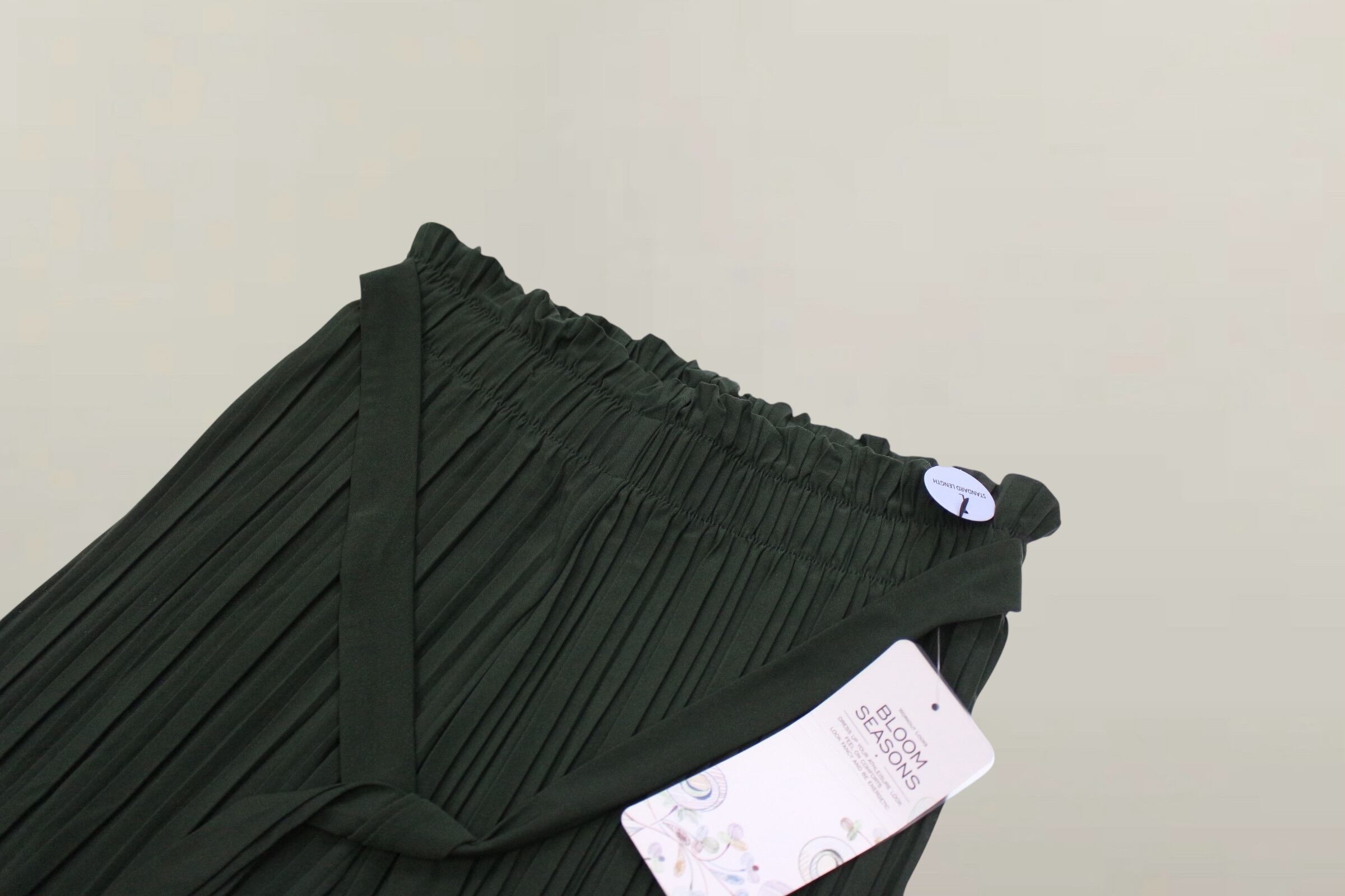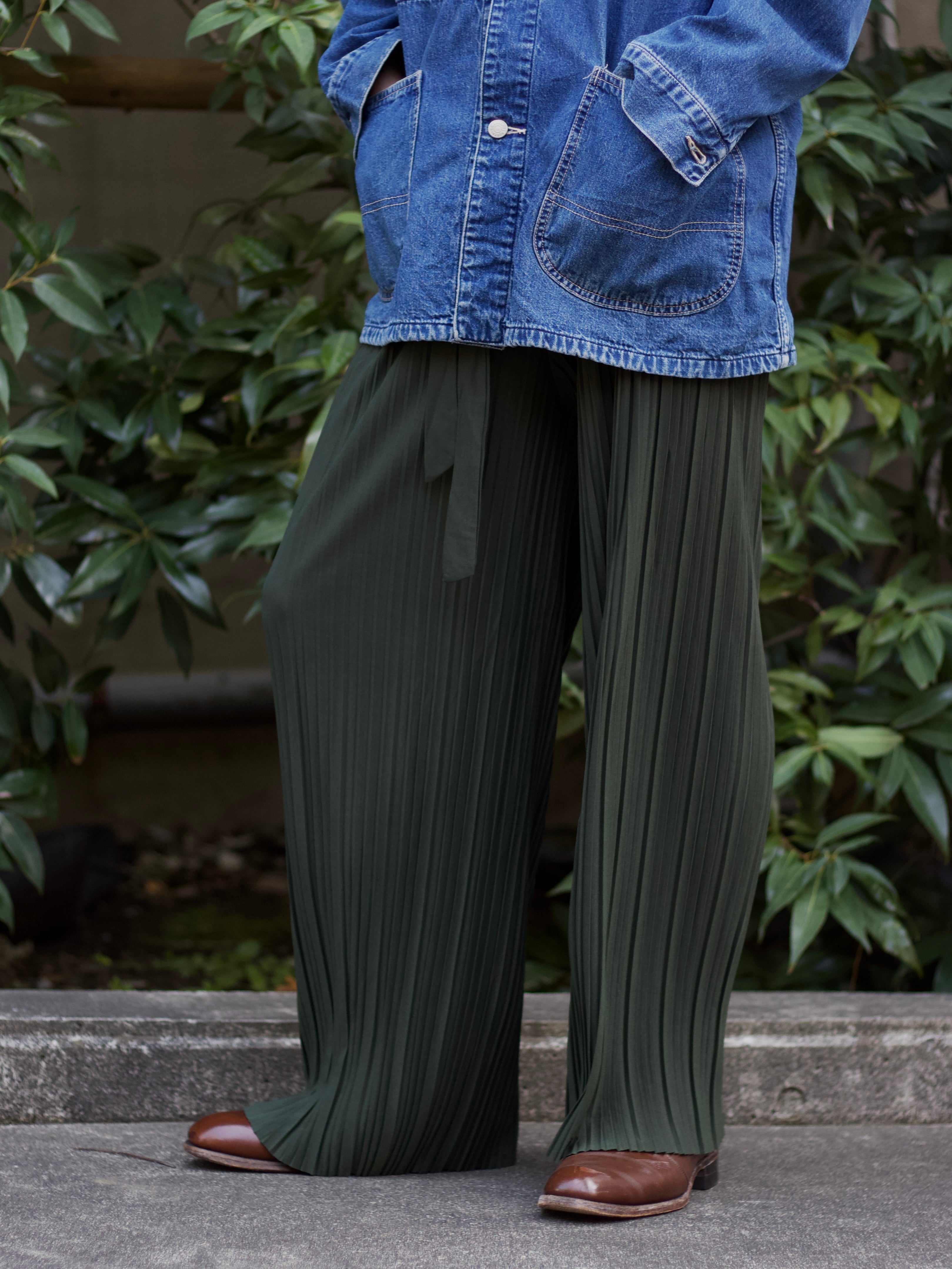 プリーツ本来のモードな雰囲気に加え、オリーブカラーの和の要素も感じる1本。