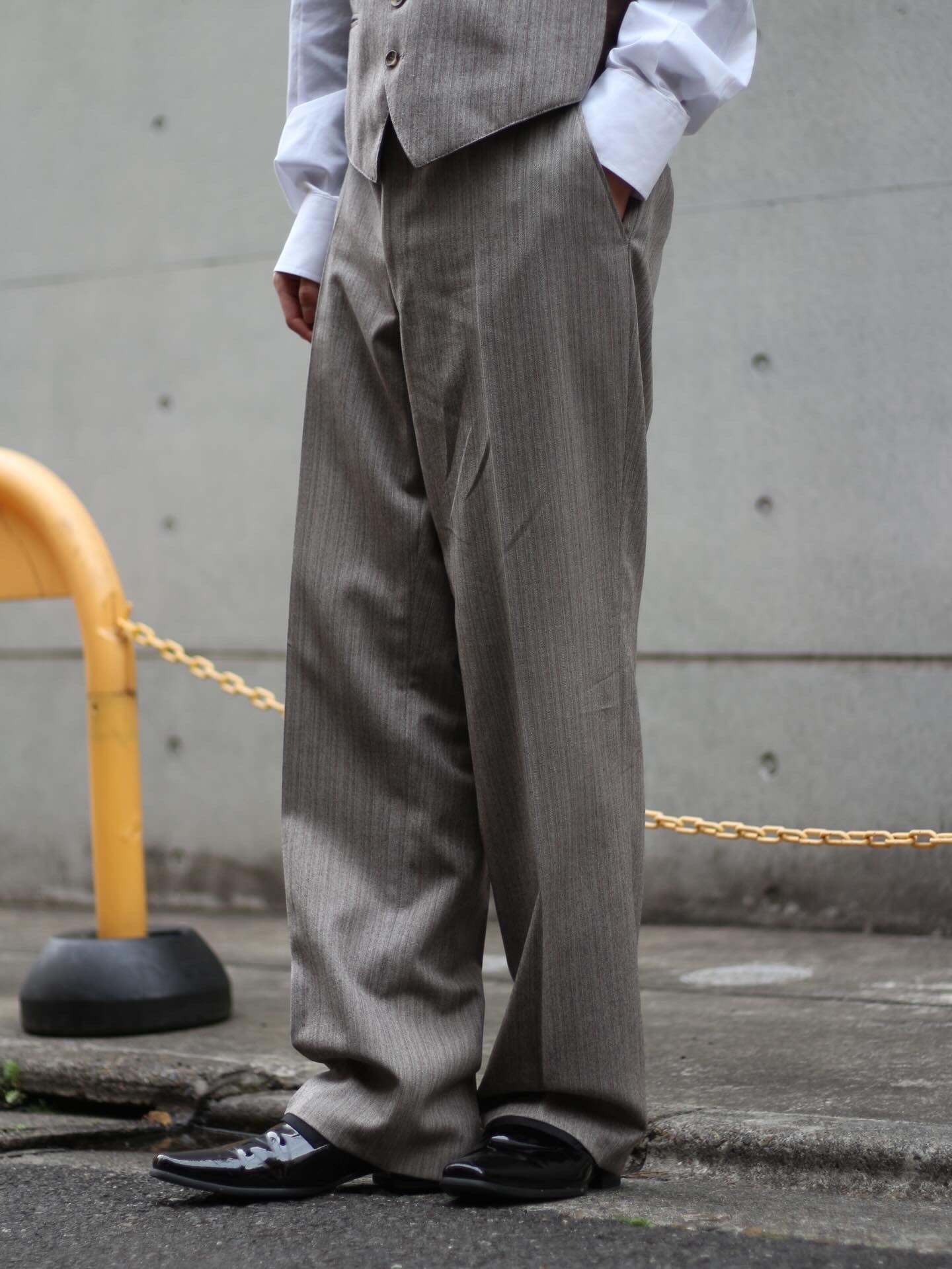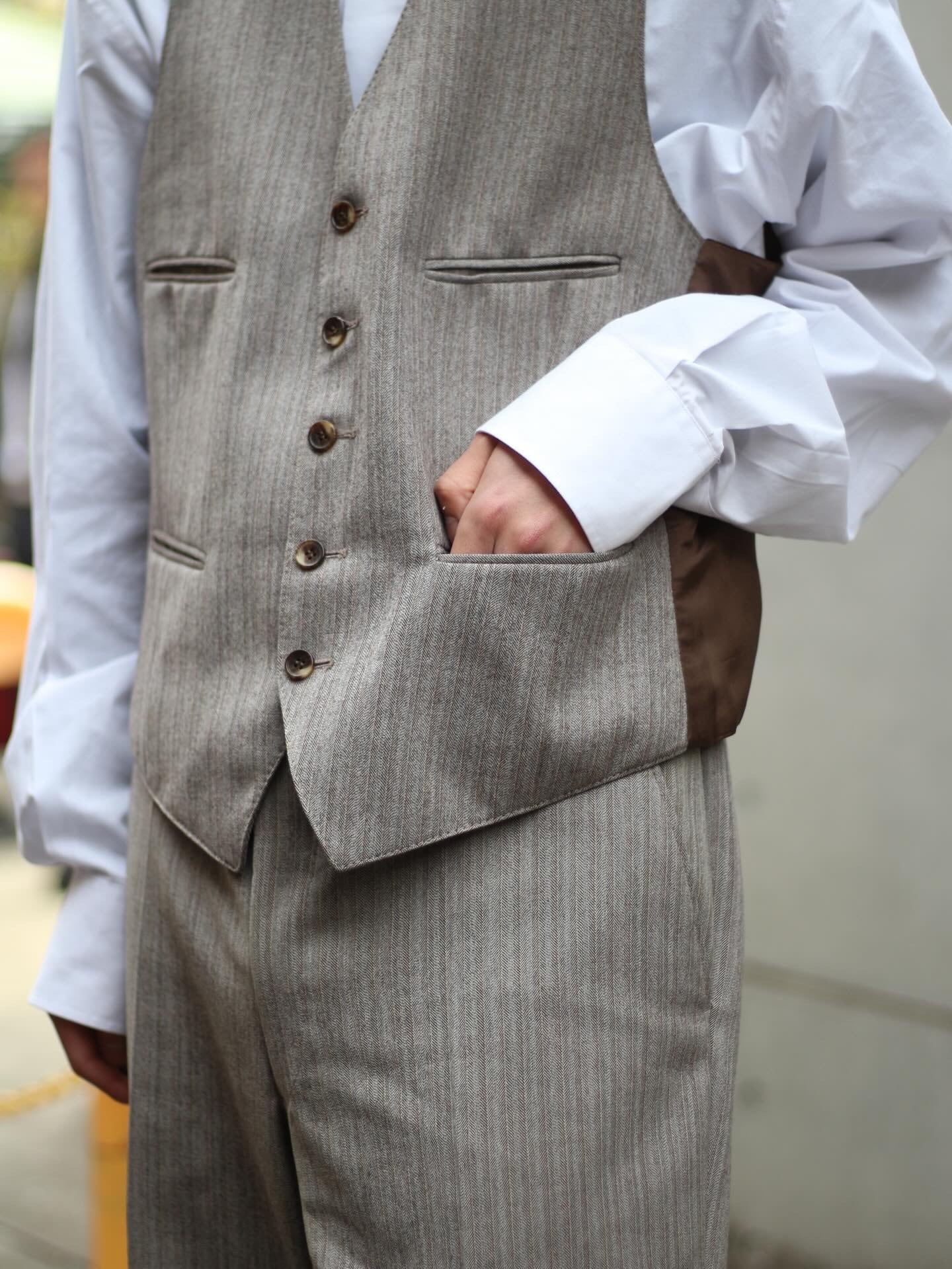 淡いブラウンのカラーリングも落ち着きがありこれぞ大人のテーラードセットアップ。