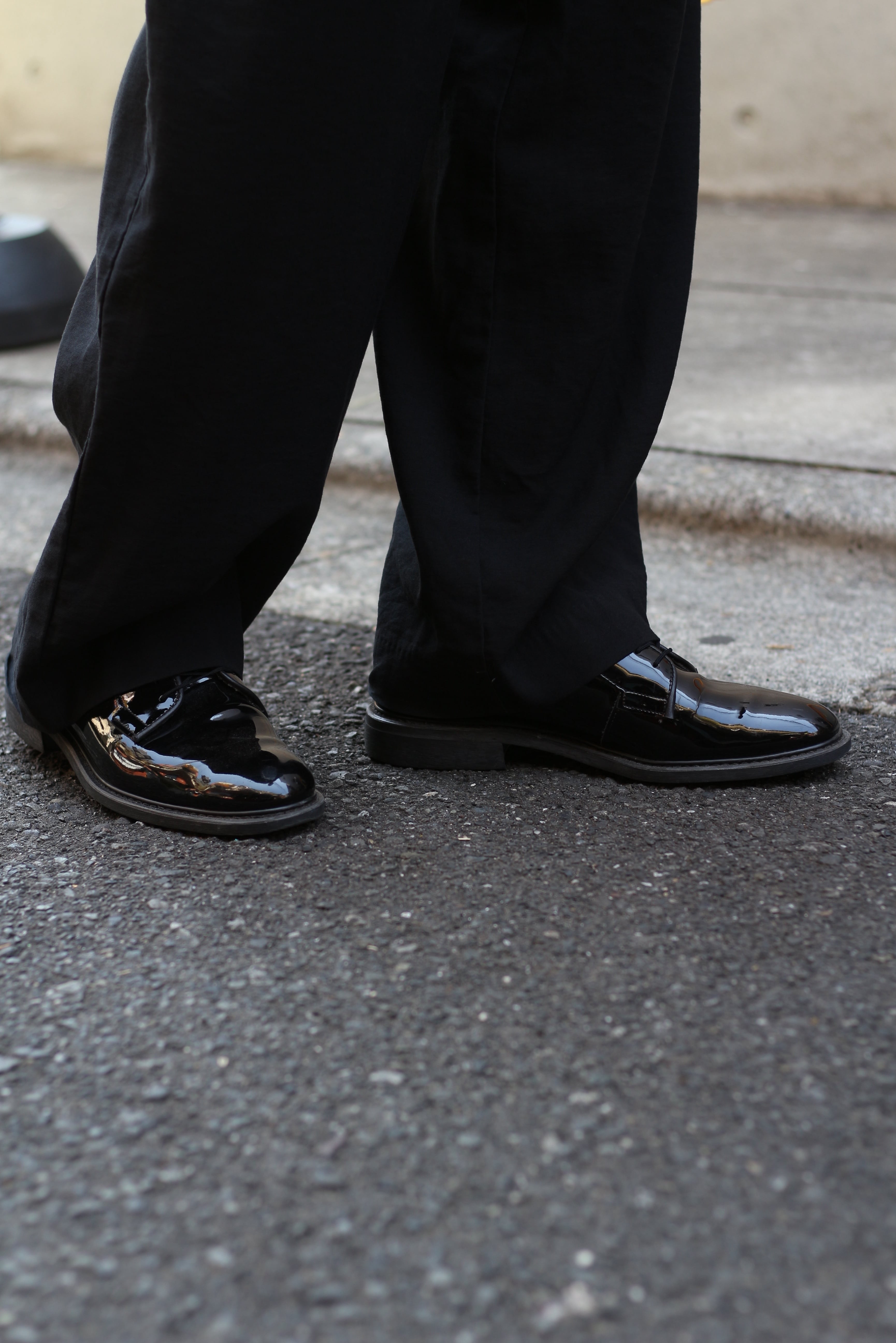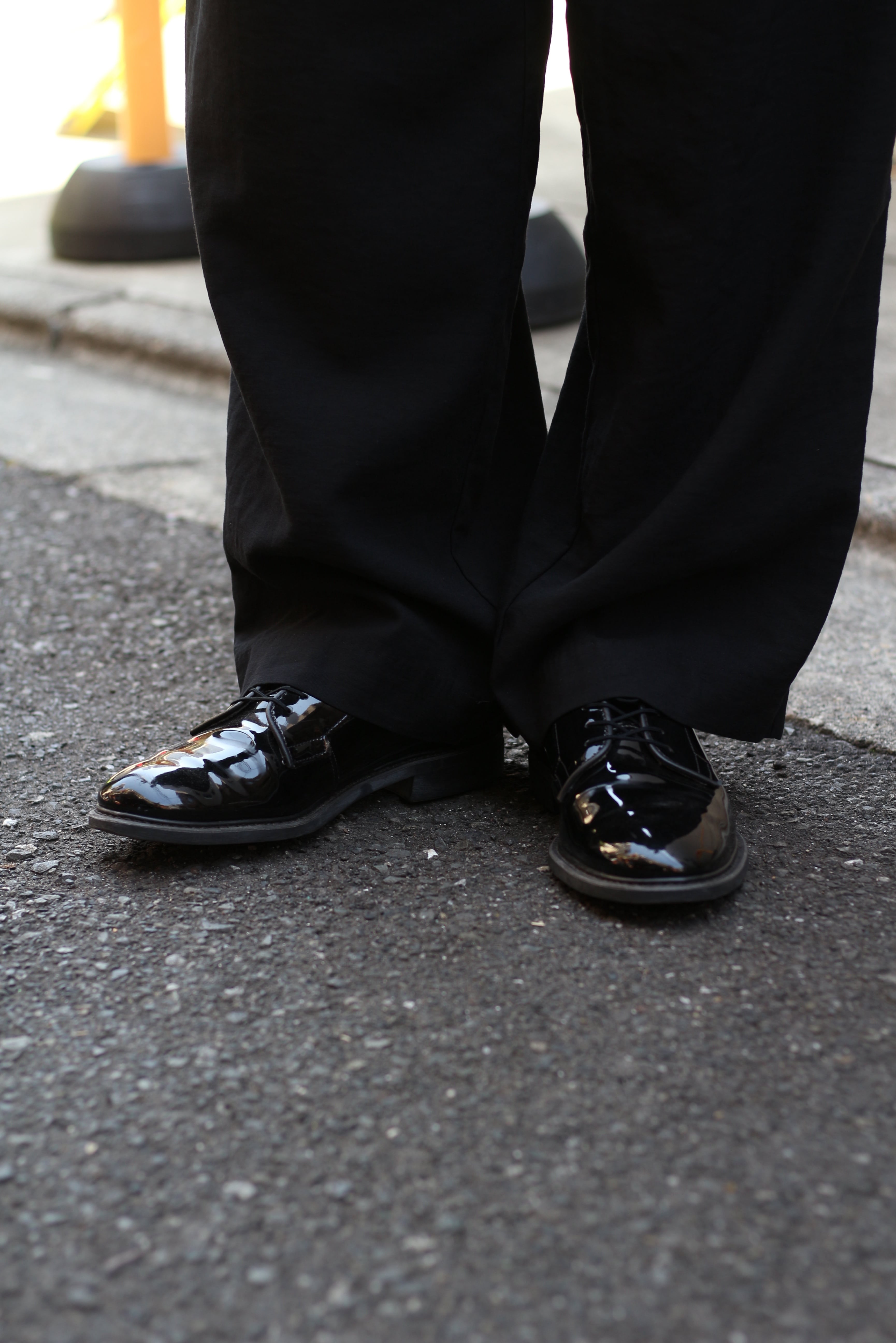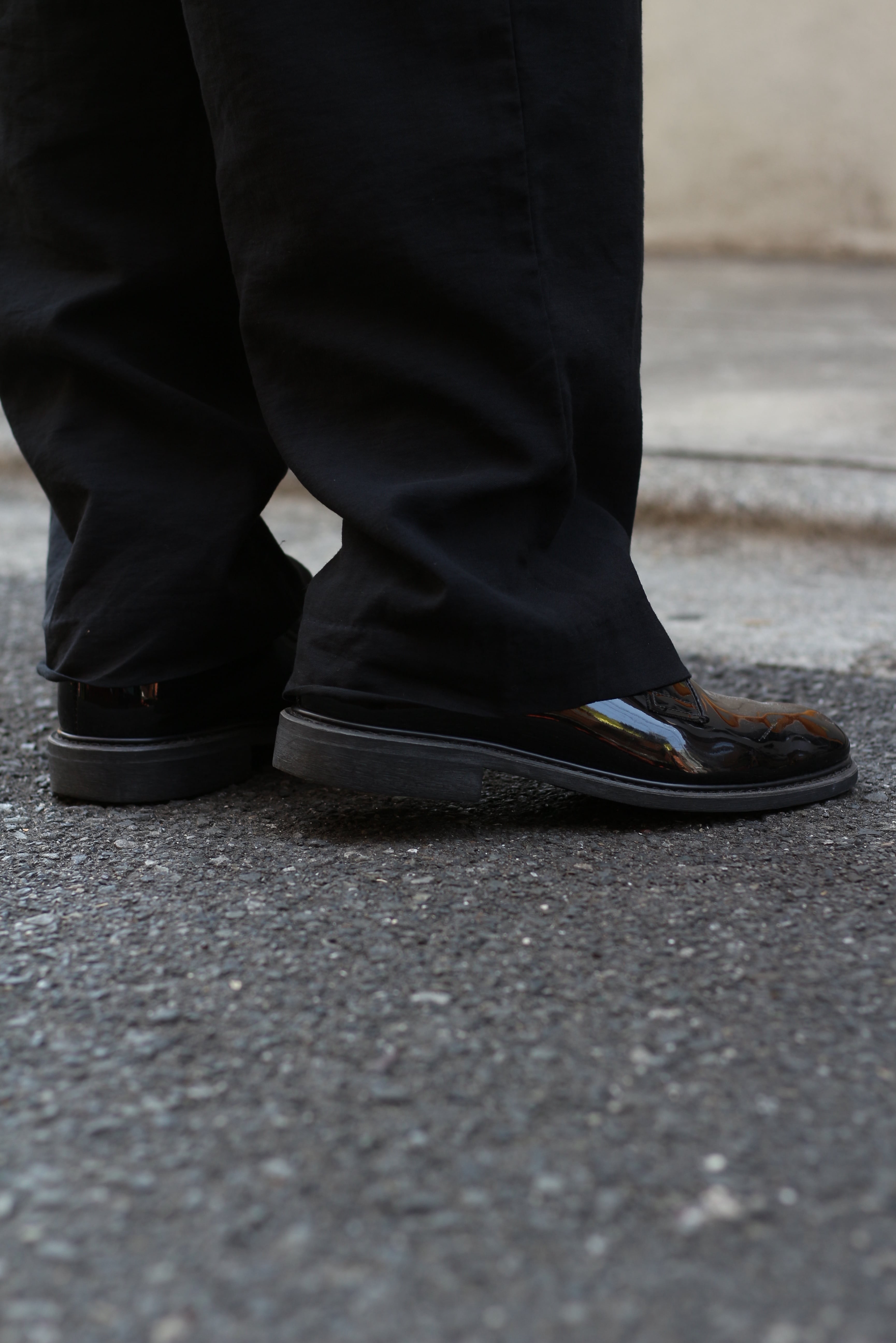 モードにもストリートにも振れる万能なブラックシューズ。
