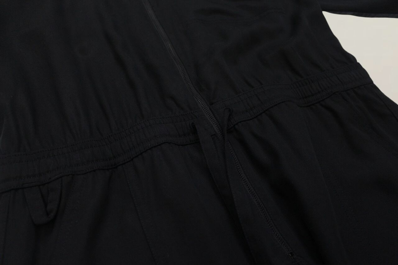 こちらのジャンプスーツはノーカラーにウエストドローコード付き