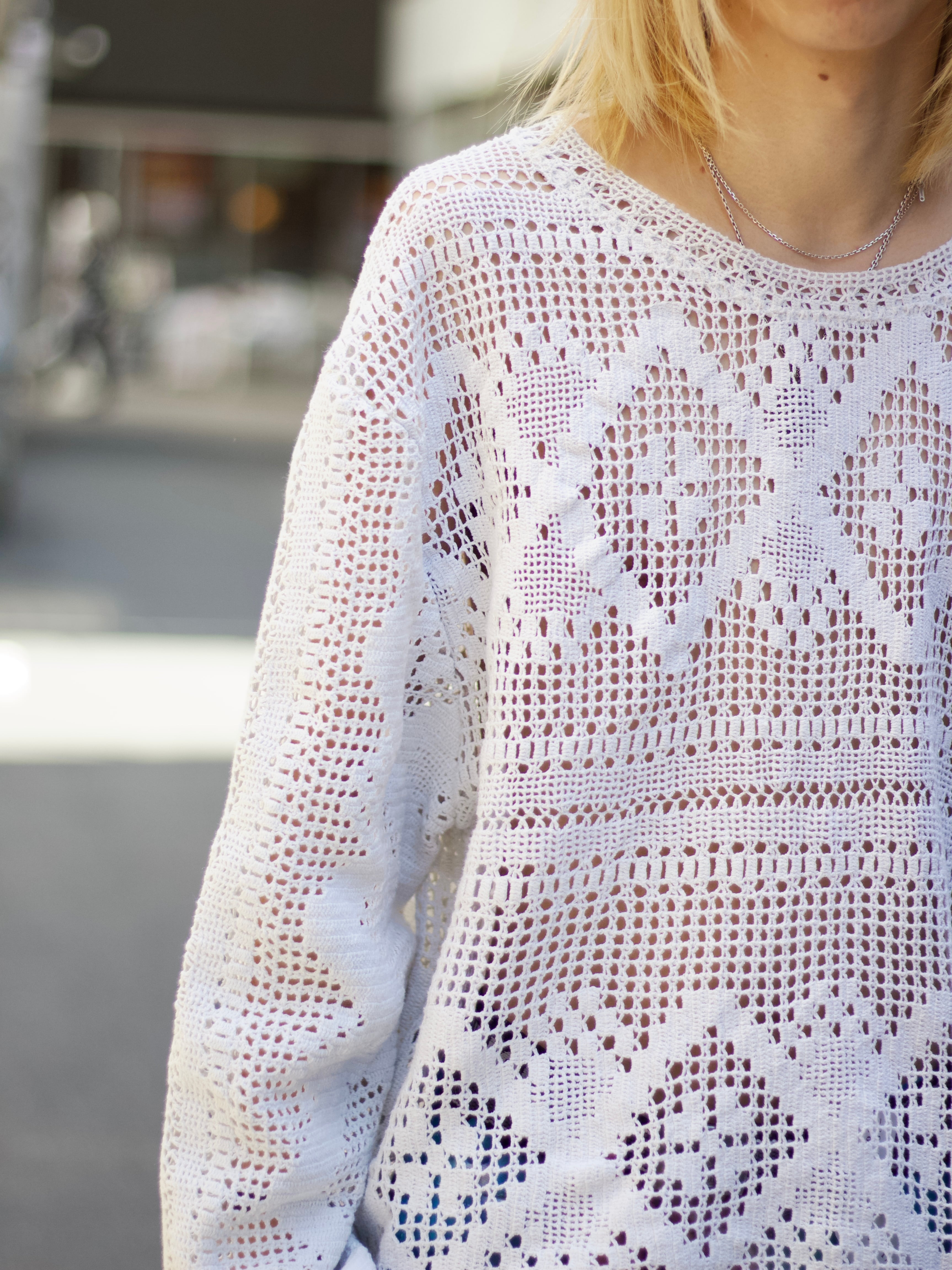 風合いの良いナチュラルなホワイトカラーでコンテンポラリーにデザインされたレースニット。