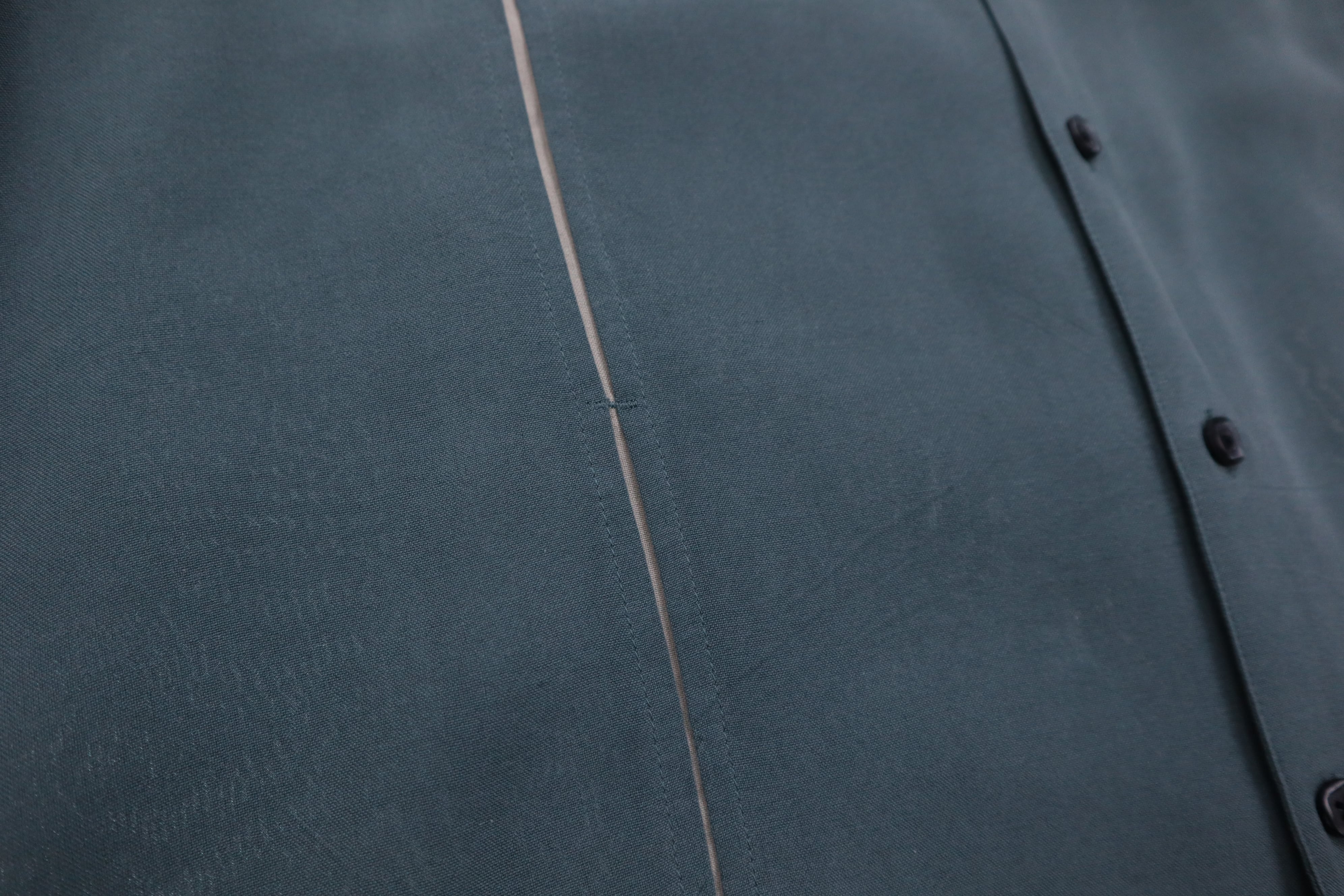 最大の特徴は、フロントに施された立体的なプリーツデザイン。平面的なシャツにはない独特の陰影と動きが生まれ、一枚で着用しても圧倒的な存在感を放ちます。