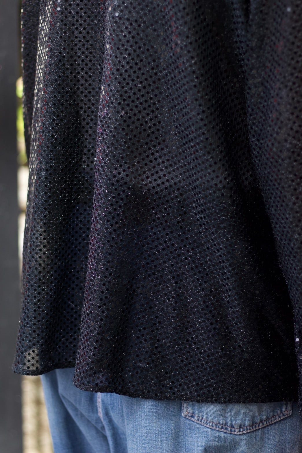 全体にドット状のスパンコールと、透け感のあるシアーが合わさることで、単なるデザインシャツでは終わらない、奥行きのある表情に仕上がっています。