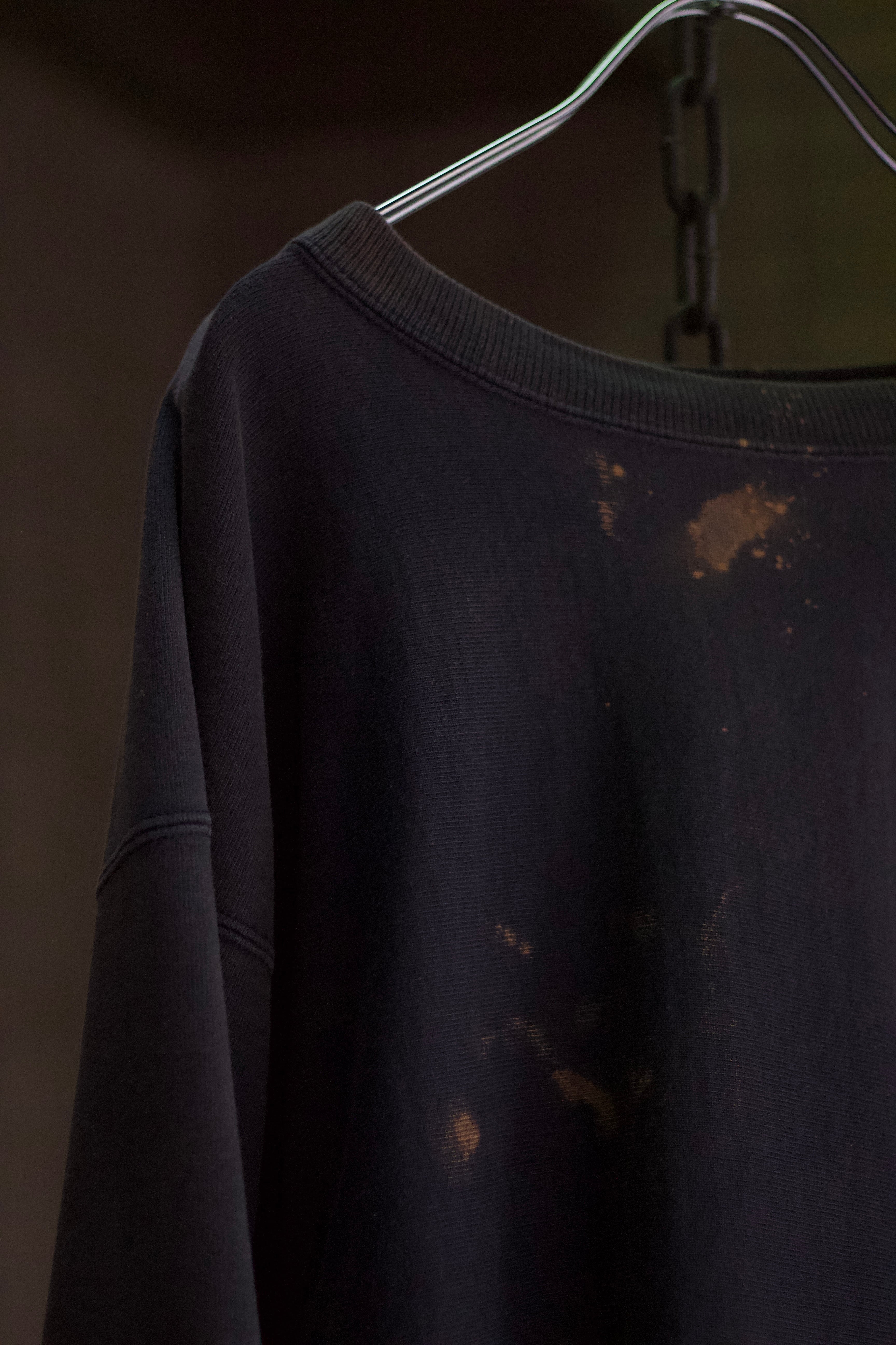 3XLという迫力のあるサイズ感に、不規則に飛び散ったブリーチのオレンジが、墨黒のボディに鮮やかに映えます。