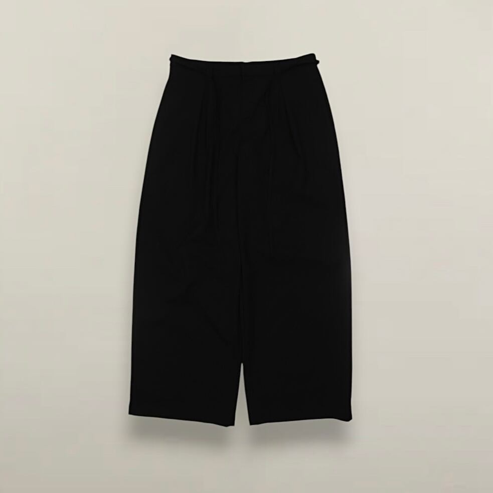 ウエストの紐がアクセントになった、ブラックのワイドイージースラックス。
