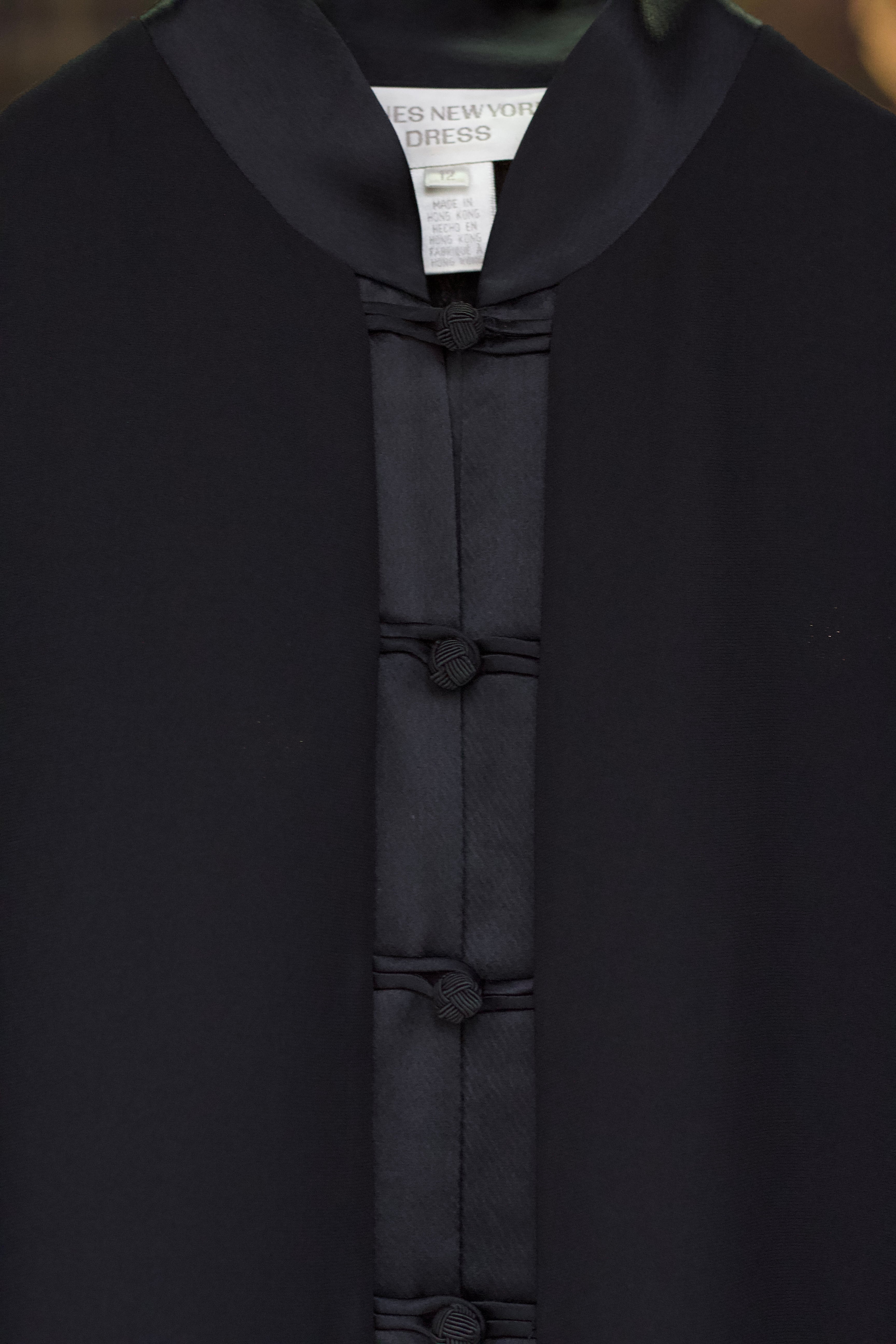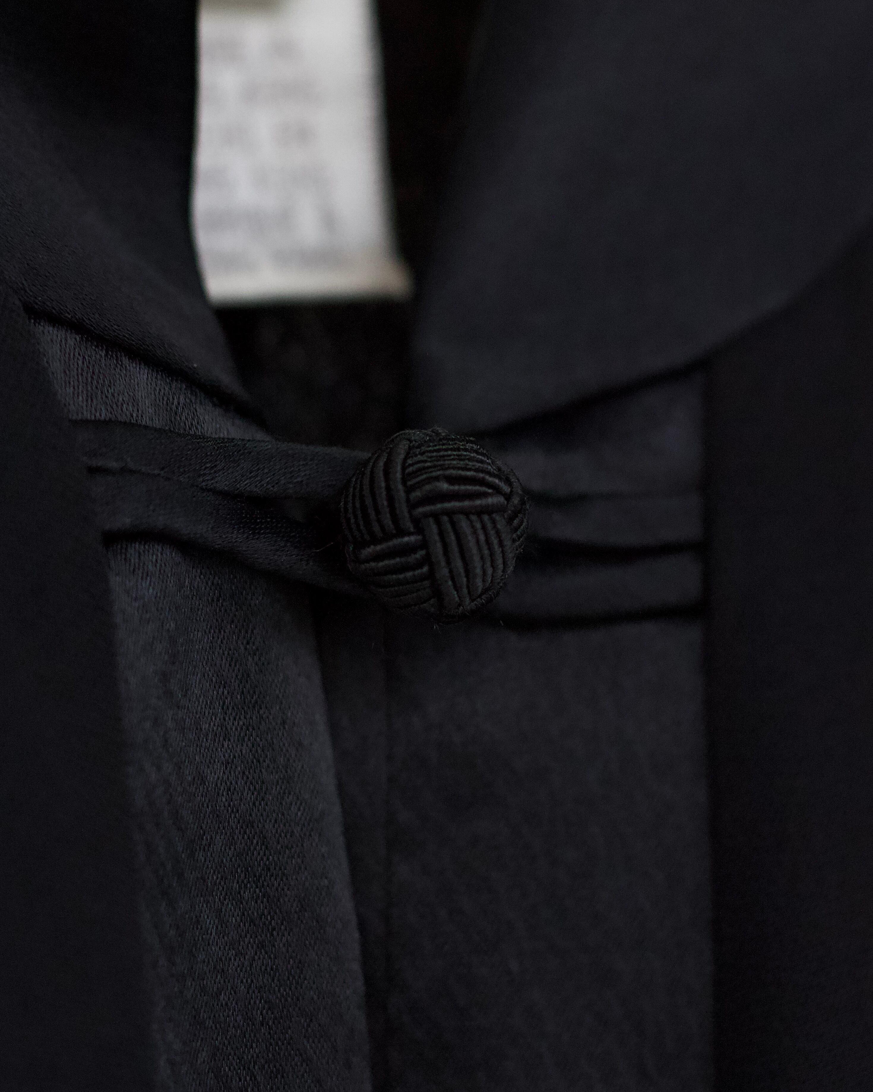 マットなボディに対して、中央に入るサテンの艶やかな光沢が直線的なラインを強調し、チャイナボタンの装飾と相まって、洗練された都会的なニュアンスを与えています。