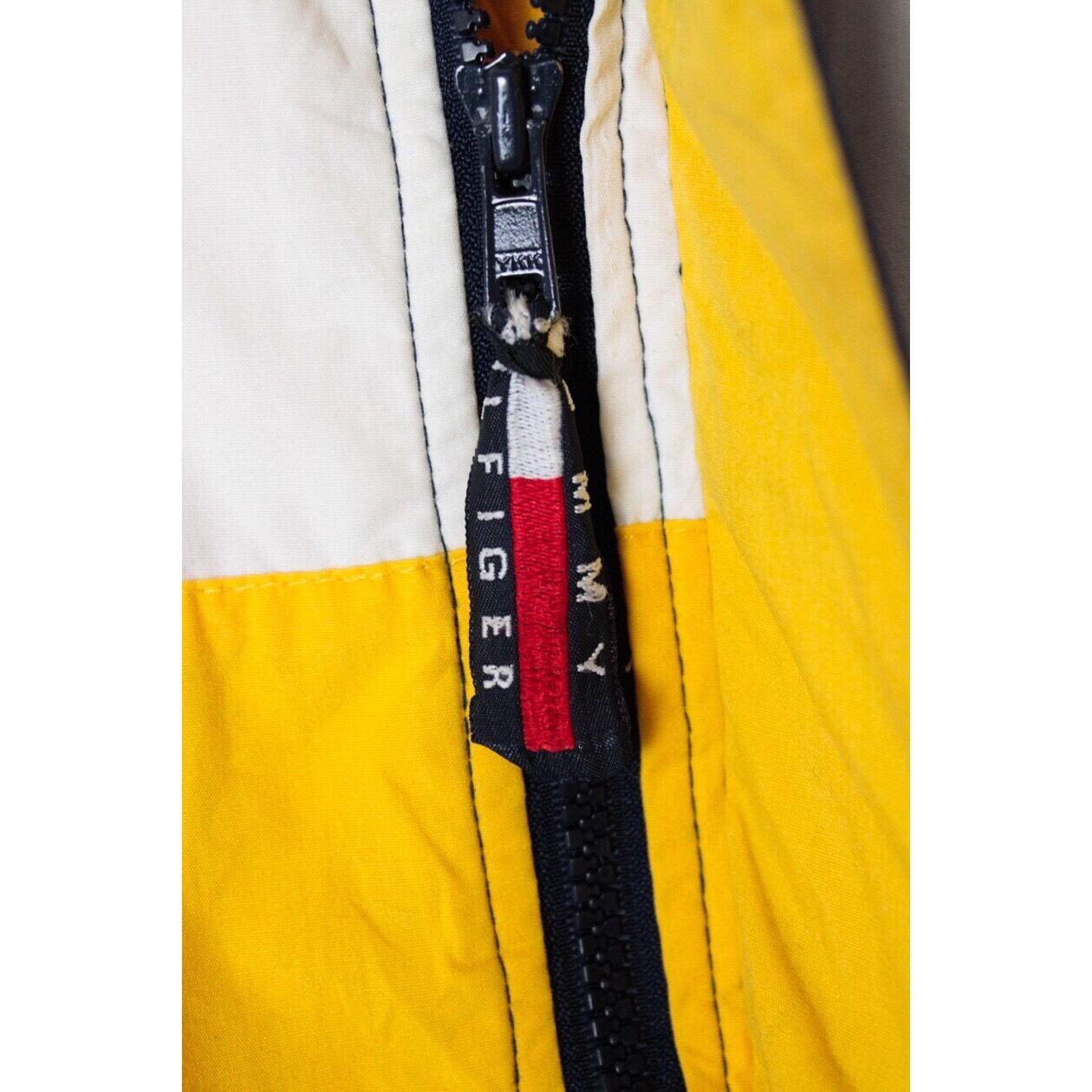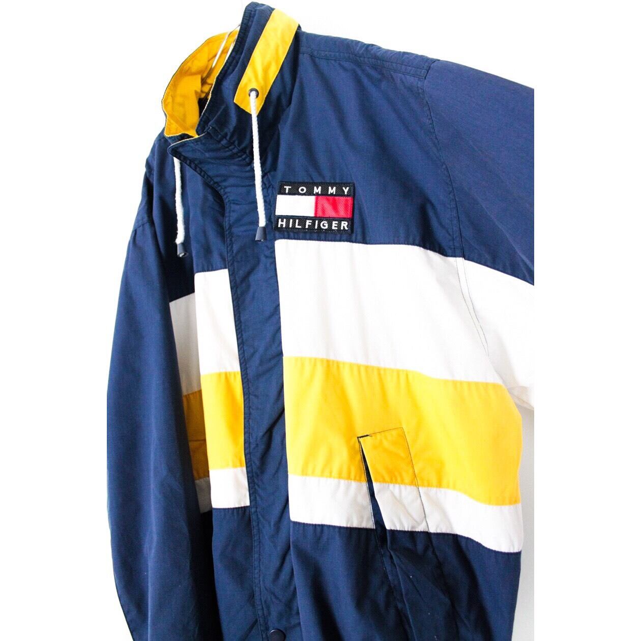 TOMMY HILFIGER のフルジップナイロンジャケットになります。90年代を感じさせる、ネイビー、イエロー、ホワイトの配色が純粋にカッコ良いですね。スポーティーな雰囲気も持つアイテムでサイズ感も大きすぎない緩めのXLが◎