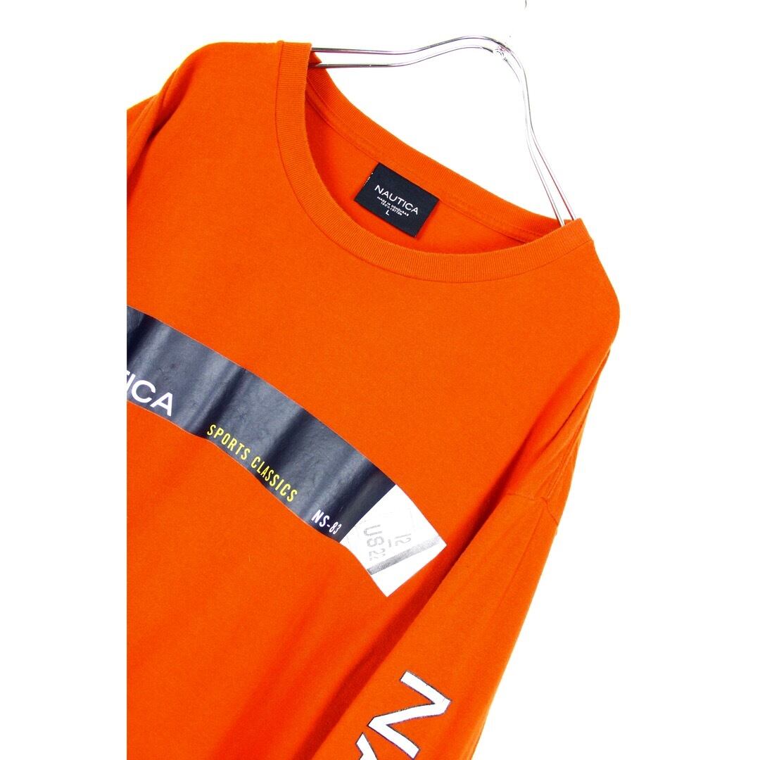 NAUTICAのプリントロングスリーブTシャツになります。オレンジボディに胸元、アームのプリントデザインが都会的でクールな一着。
