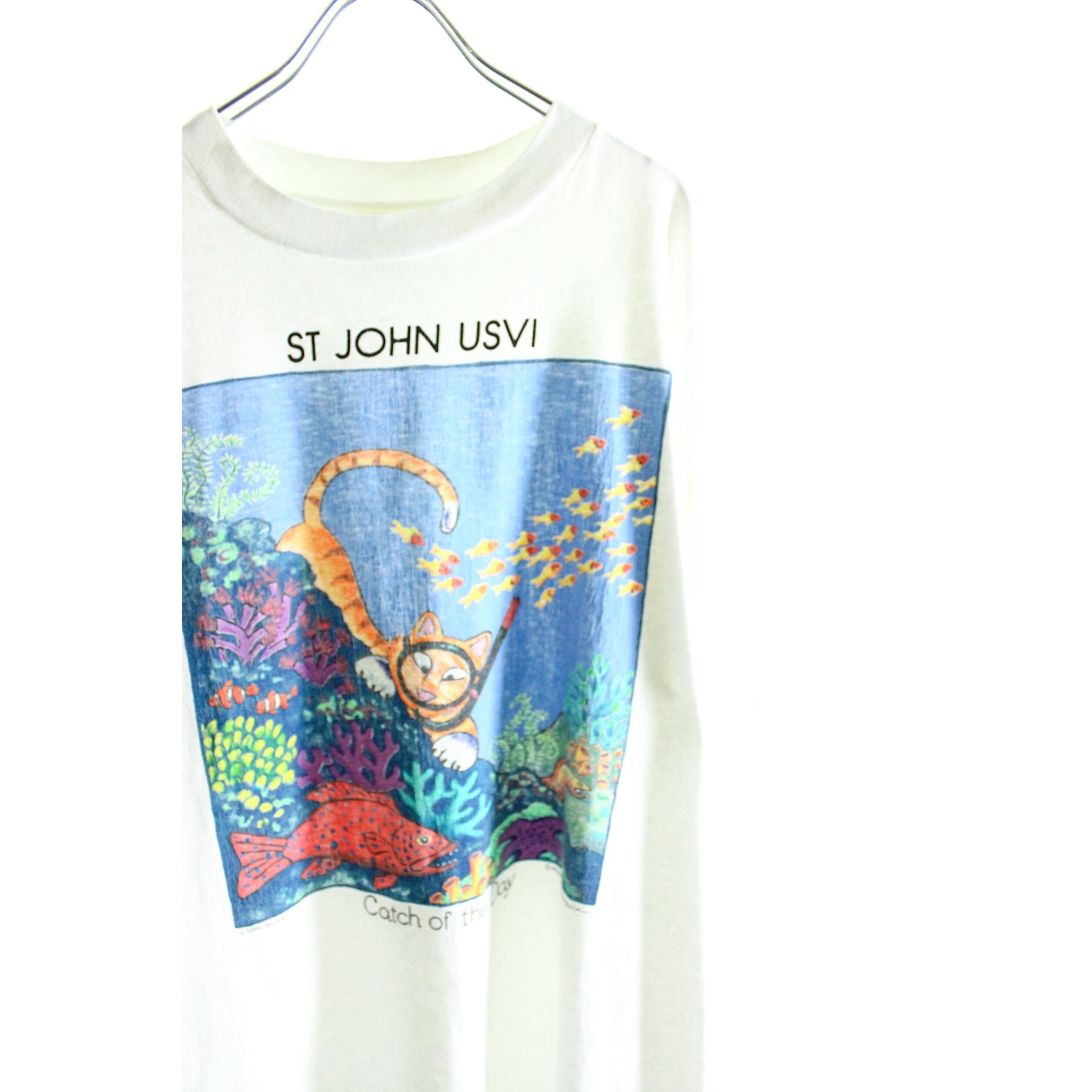 ボディは良質なアートプリント物が多い"FABRIC ART"。生地はしっかりとしたコットン100%で、経年による少しくったりした質感も雰囲気があって良いですね。アメリカ製なのも魅力です。シュノーケリングしている猫が魚を見ているなんともかわいらしく、愛くるしいプリント。全体のカラーリングもGoodです。