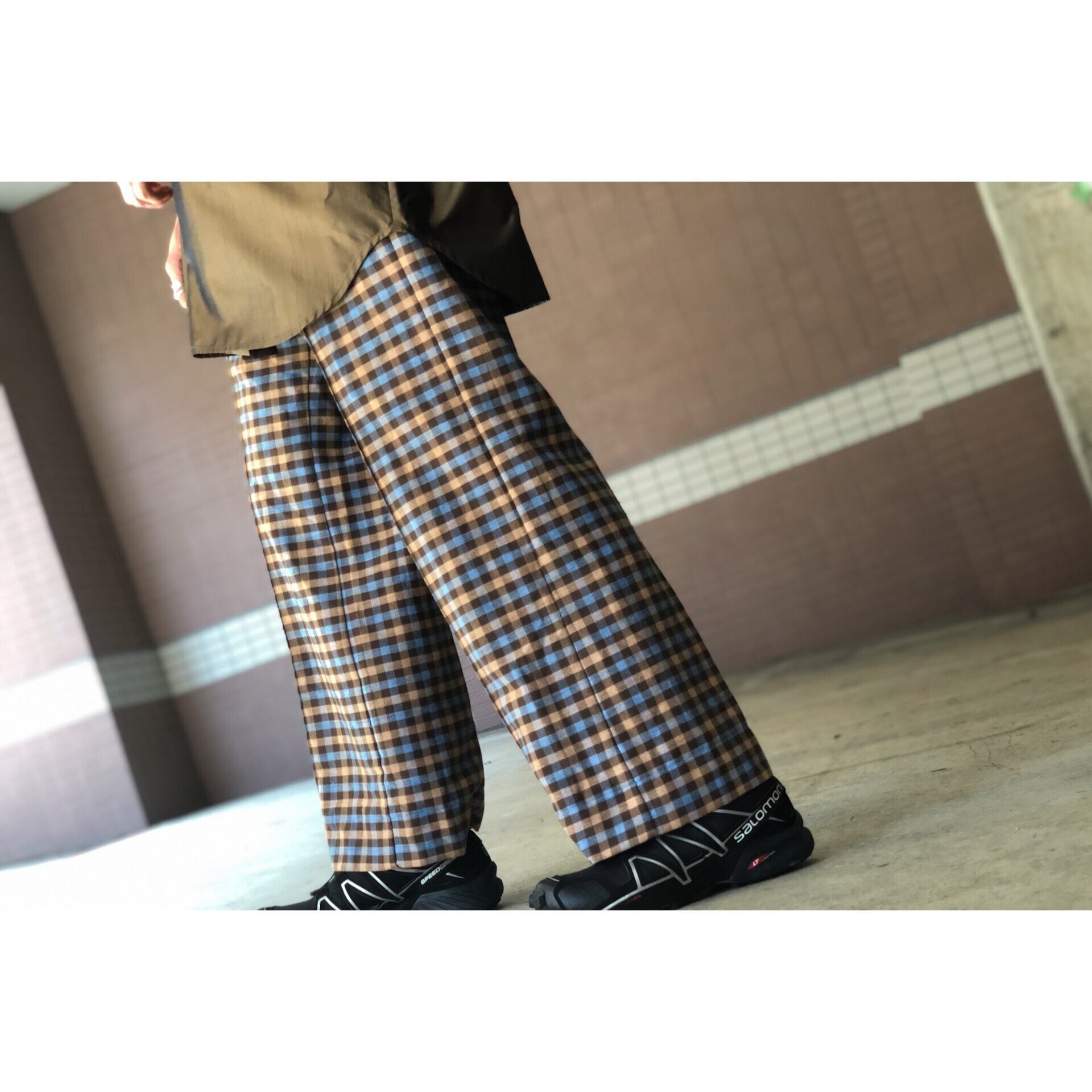旬のブラウンカラーのチェックフレアスラックスです。