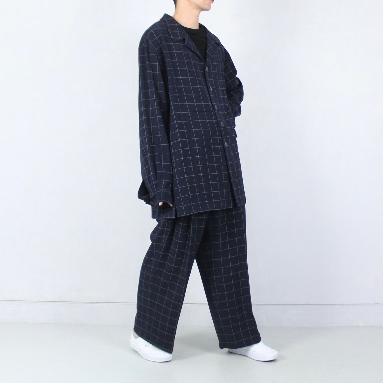 そのままはもちろんタックインスタイルもかなりカッコいいです。上からコートで合わせてもかなりサマになるので非常におすすめな2ピースセットアップです。