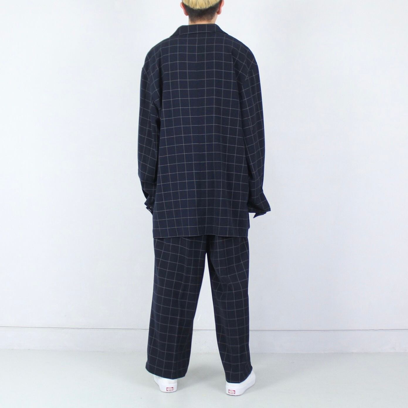 ウィンドウペンチェックの大人っぽい柄パターンに落ち着いたネイビーがなんとも雰囲気抜群。上下共に非常にとろみのあるファブリックで落ち感さいこうです。