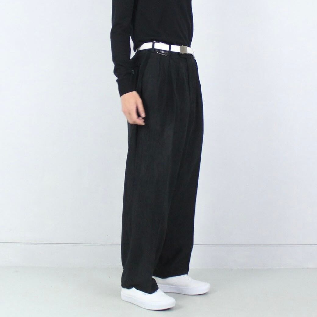 加えて36インチと非常に大きいサイズ感です。ベルトで縛って感じられるドカンシルエットは他のスラックスに差をつけられる秀逸な造り。少しテーパードが効いた形が良いですね。
