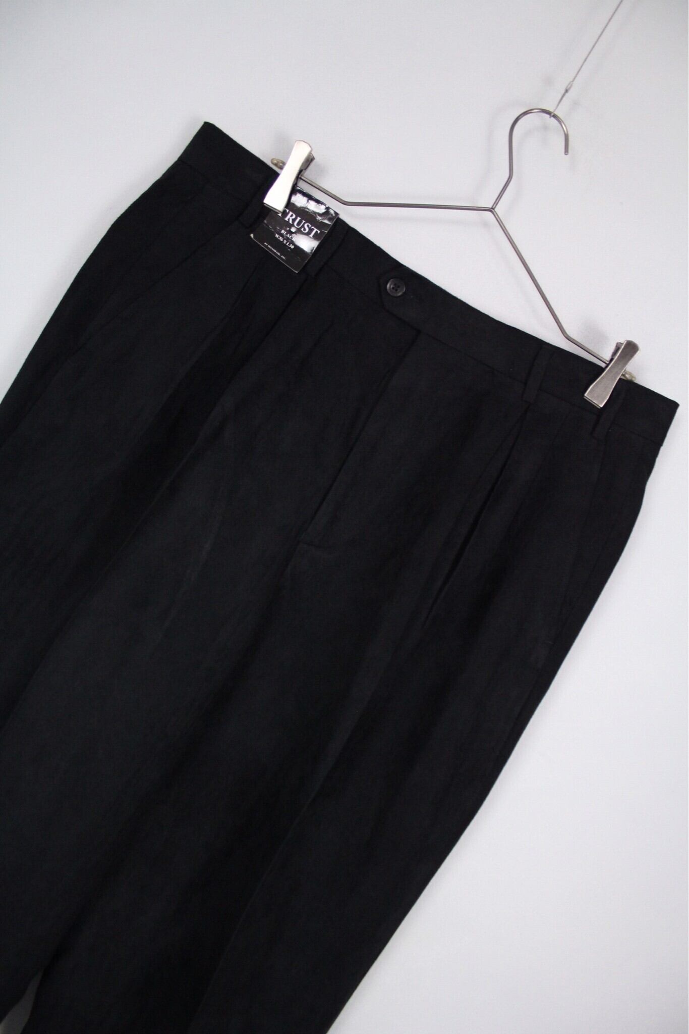 ウエスト部分には2タックに加えてタグが付いた状態。deadstockで保管時のコンディションも良くブラックのカラーが上品な印象。生地感も相まりモードな雰囲気漂います。着こなし次第では綺麗めやストリートにも着用可能。対応力の高い一本です。