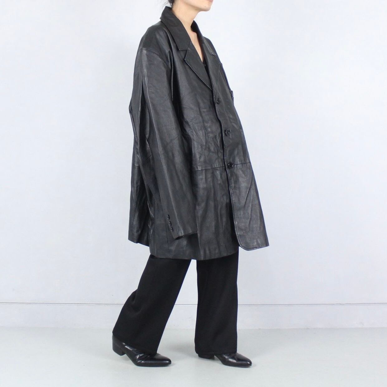従来のレザーアウターの概念を一蹴するドレープ感を体現するアイテム。オーバーサイズのレザーアイテムでここまで着やすいのはこれ以外にあまり無いと思います。