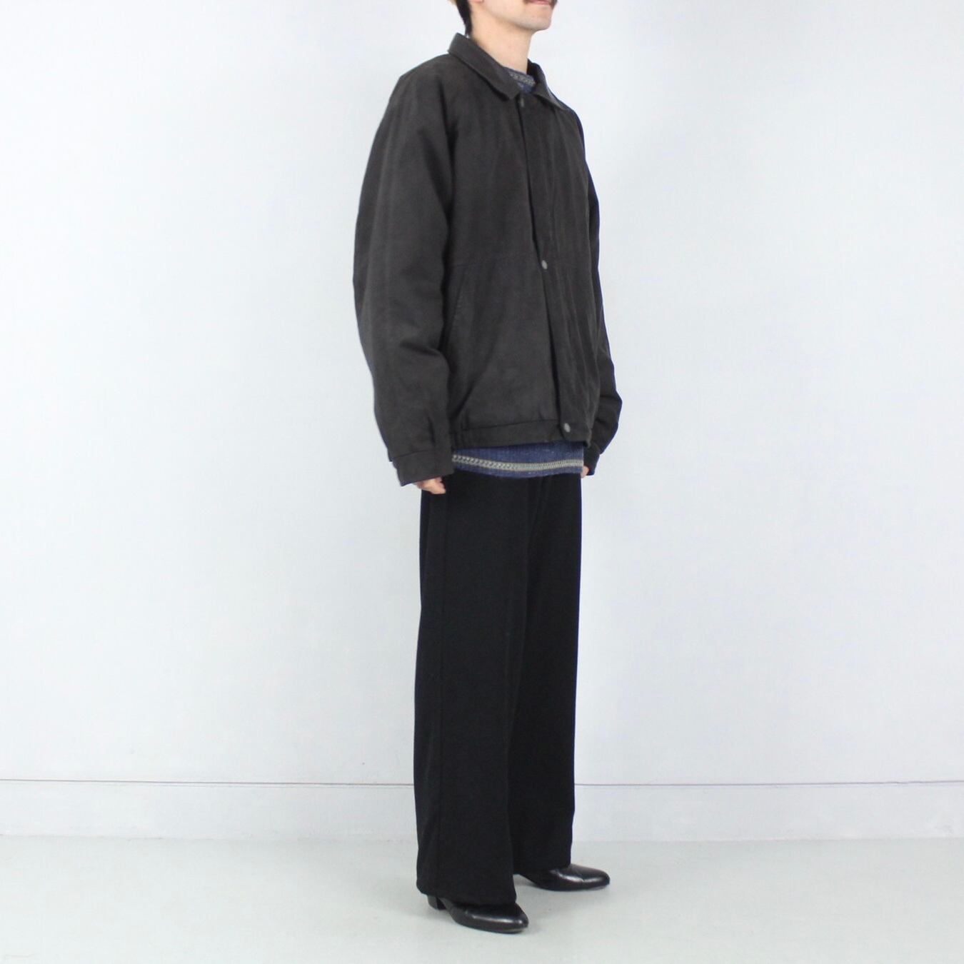 しっとりとした起毛感のあるフェイクスエード地のボディに襟レザー切り替えのマニッシュなアイテム。