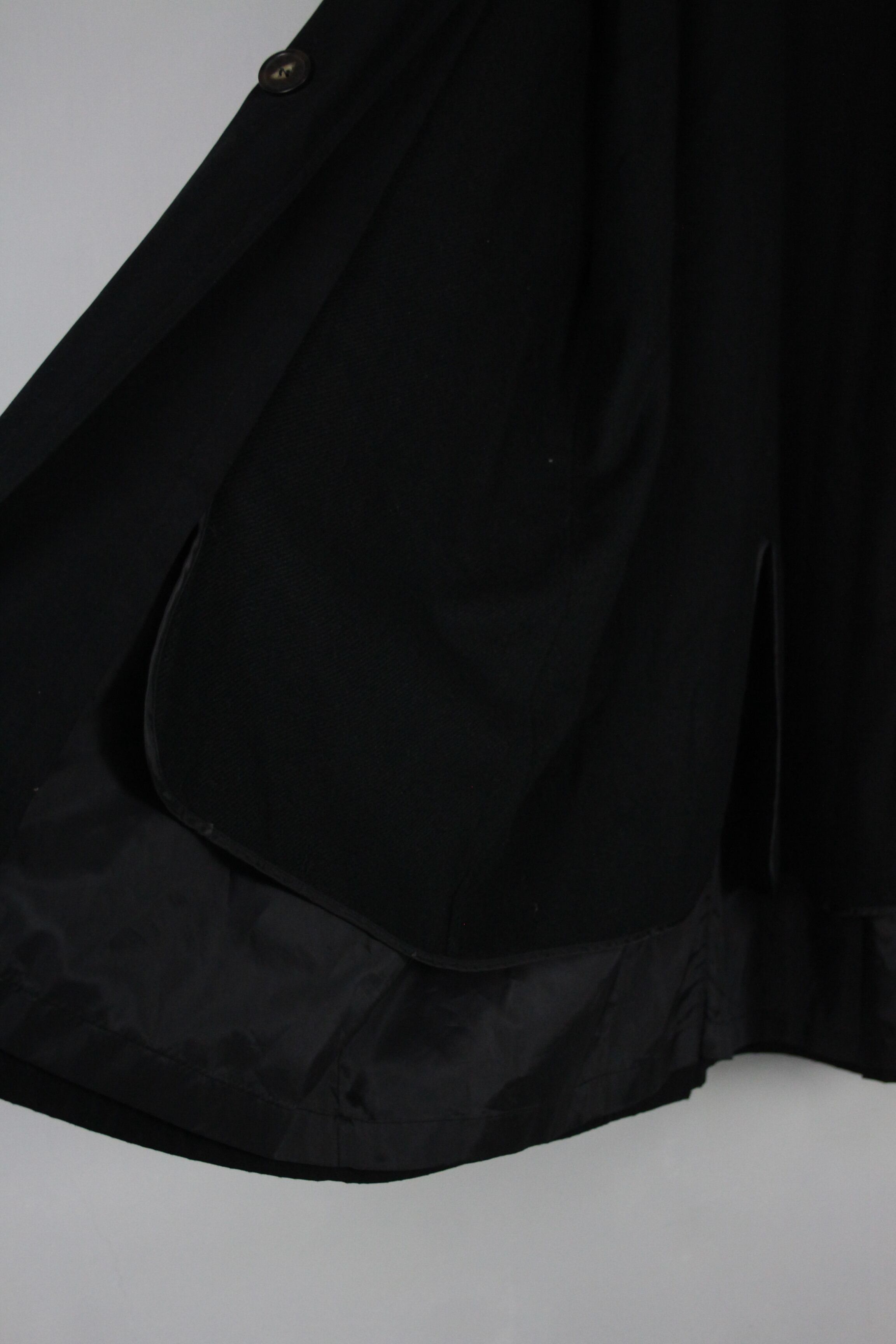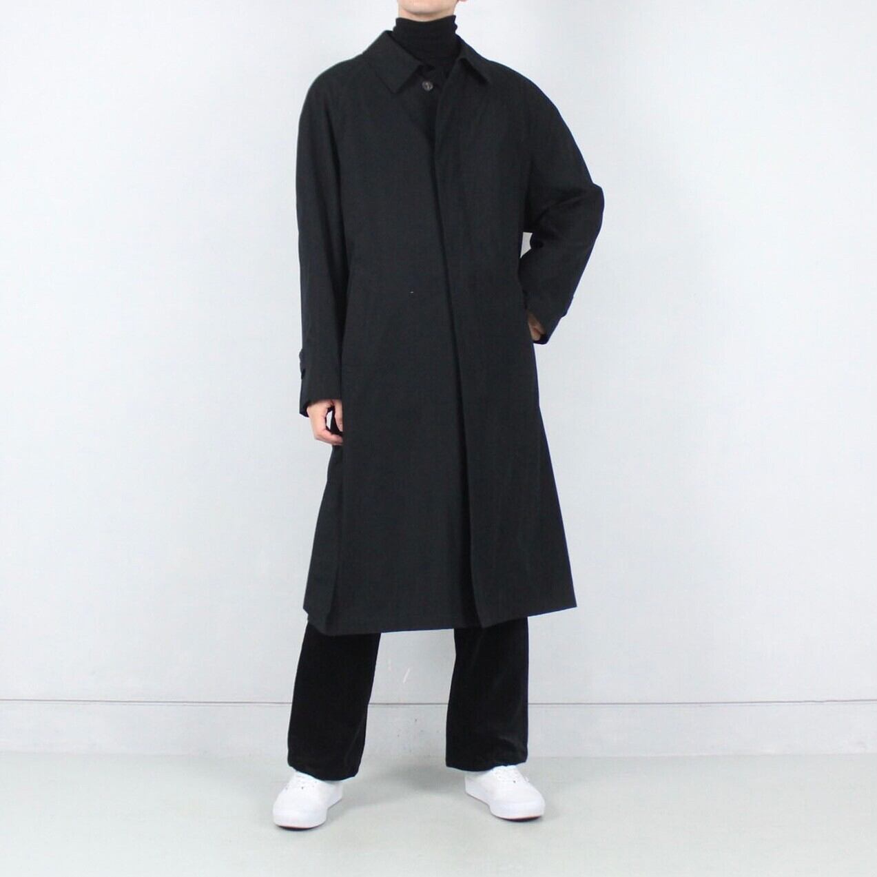ポリ素材の滑らかなスムースファブリック。無駄なくミニマルに造り込まれたディテールに加えて柔らかく高級な仕立ては古着で出回る通常のコートよりも重厚な印象。