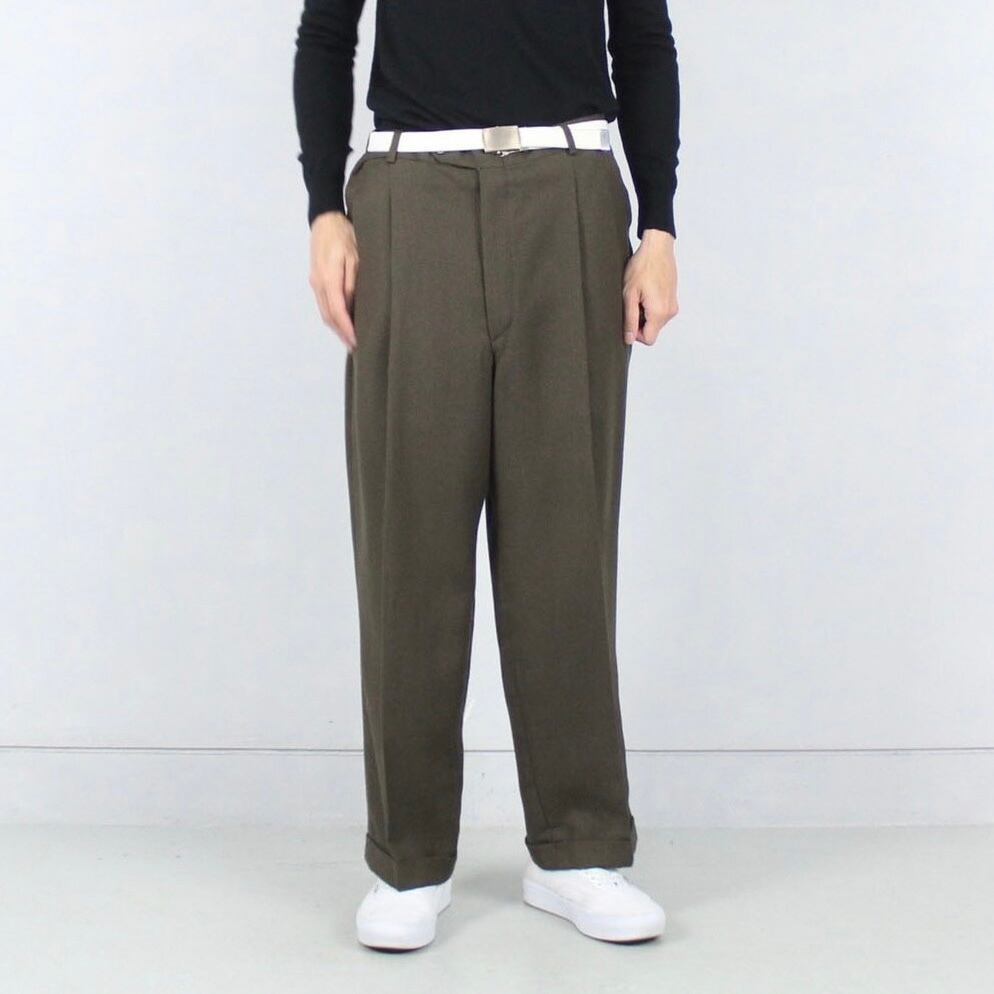 シルエットはウエスト2タックがとられ程度の良いワイドシルエットに裾に向けてストンとオチる綺麗なシルエット。裾幅も広くスニーカーに溜めて履いていただいても◎トップス、シューズを選ばない汎用性高いシルエットかと