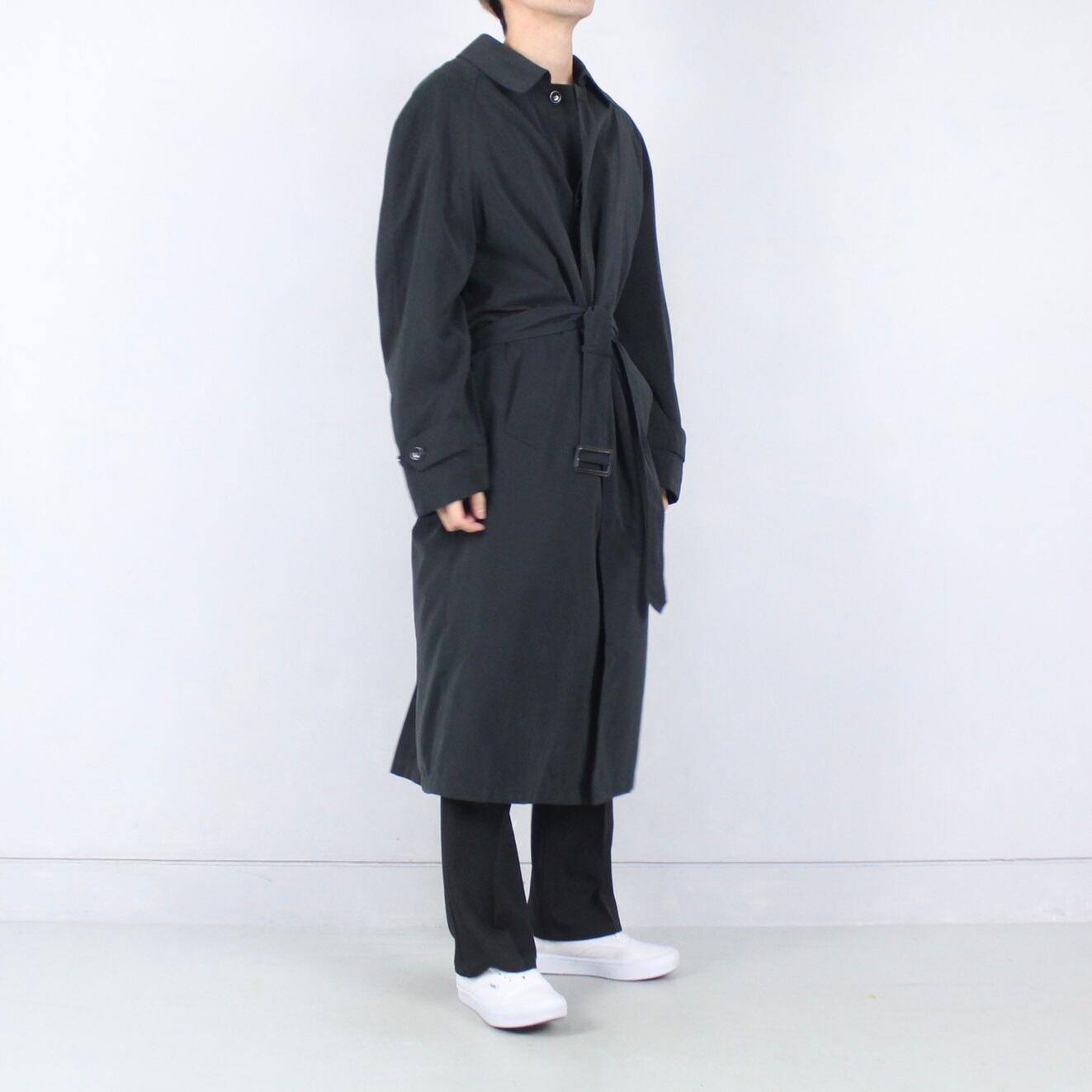 ポリ素材の滑らかなスムースファブリック。無駄なくミニマルに造り込まれたディテールに加えて柔らかく高級な仕立ては古着で出回る通常のコートよりも重厚な印象。
