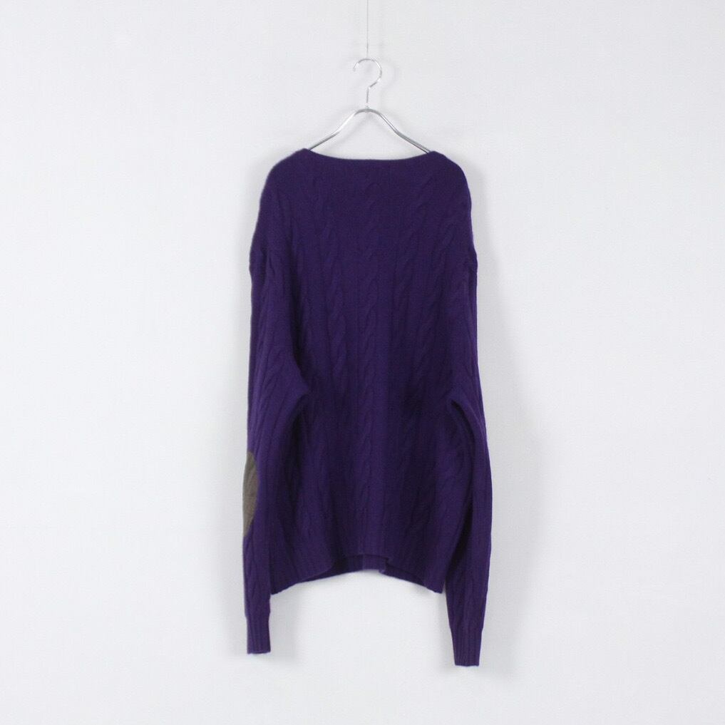 着心地もストレスなく抜群です。ケーブル編みで肉厚な質感。ハンドニット特有の暖かみが感じられます。膝にはレザーパッチも◎デザイン性も最高の一言。
