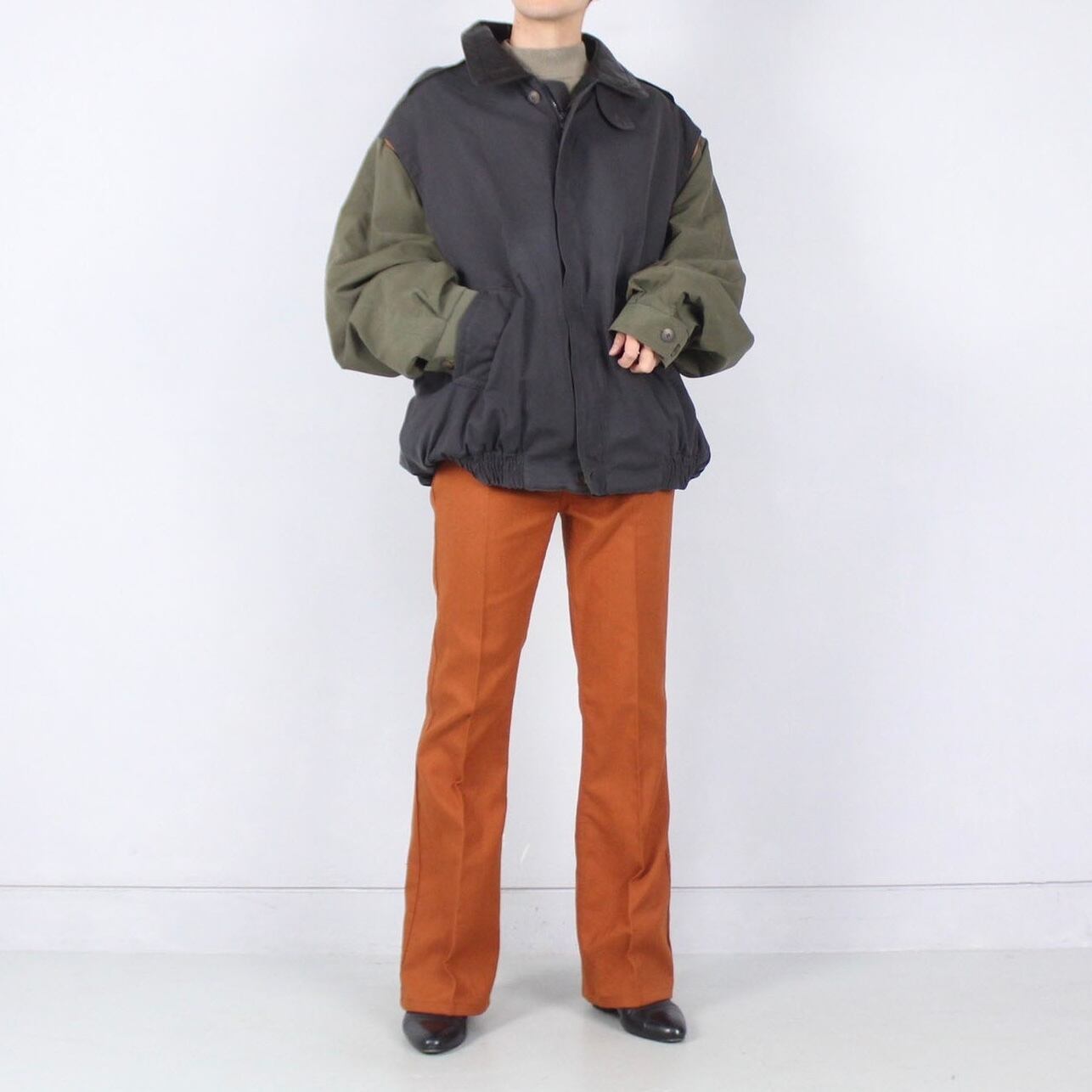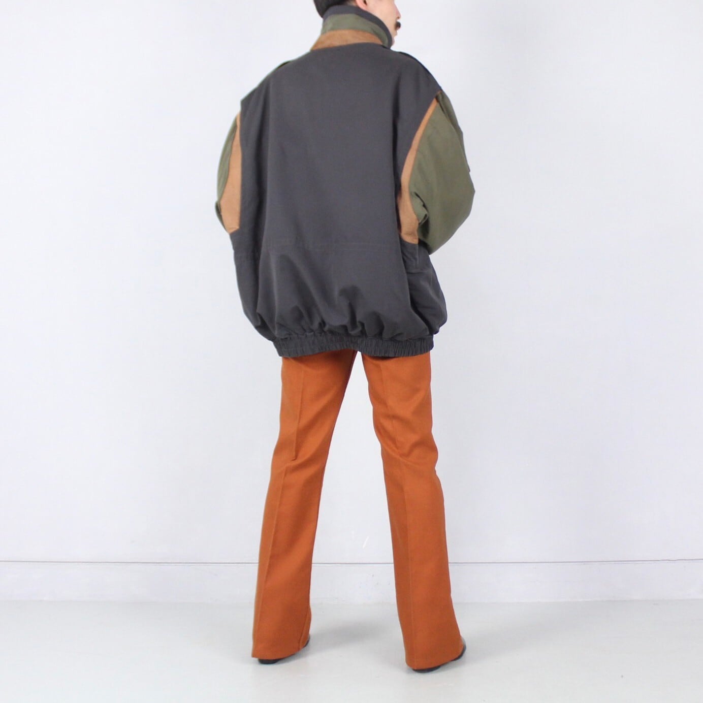 ブラック×グリーン×ブラウンの贅沢3カラー使いに襟はブラックのレザー切替、しかもスタンドカラーにも変化する大盤振る舞いのスペシャルピース。フロントだけでなくバックまで気の利いた抜かりないデザイン。