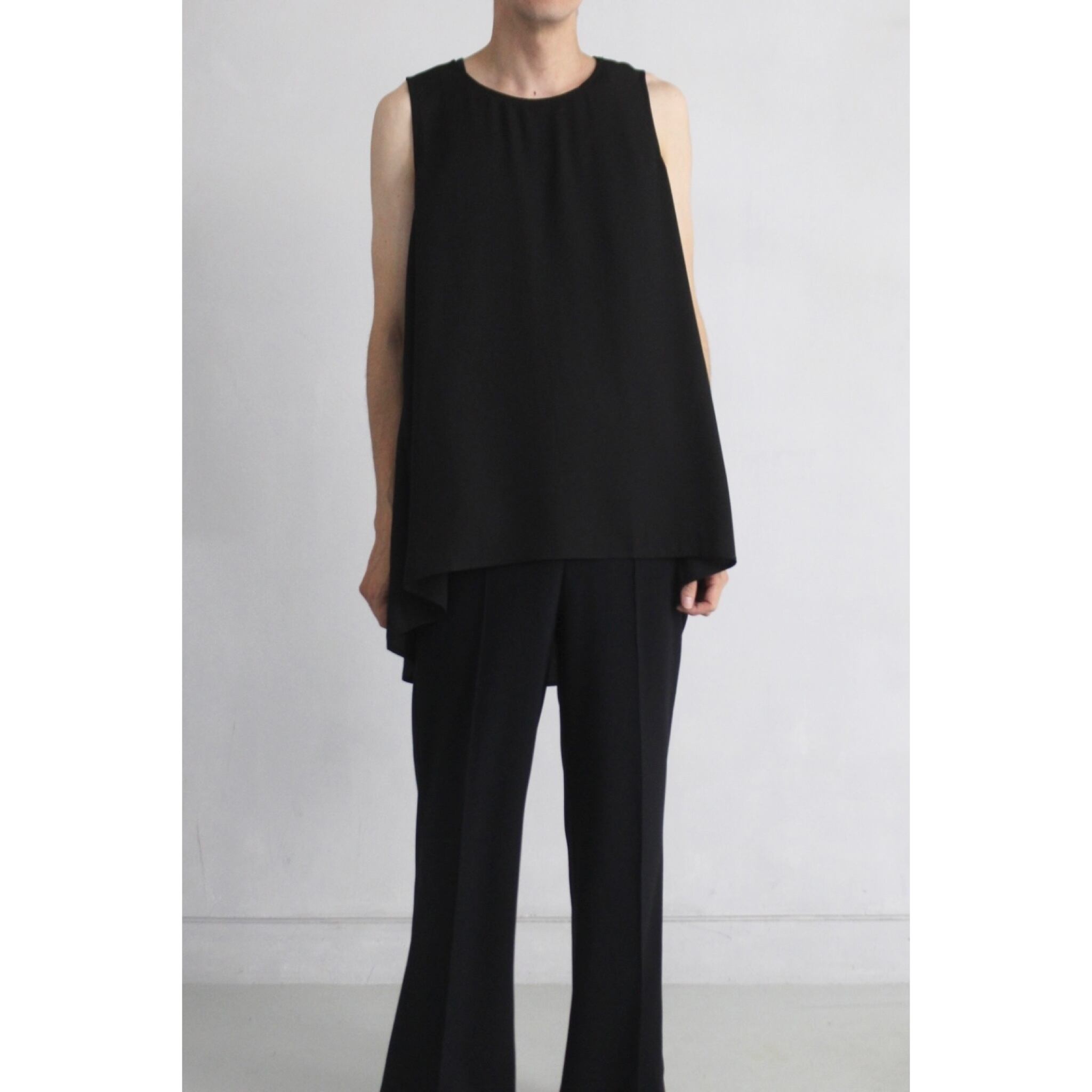 ミニマルなオールブラックカラーながら裾のカッティングのデザインも秀逸です。後身頃の長い動きのあるドレープするシルエット。