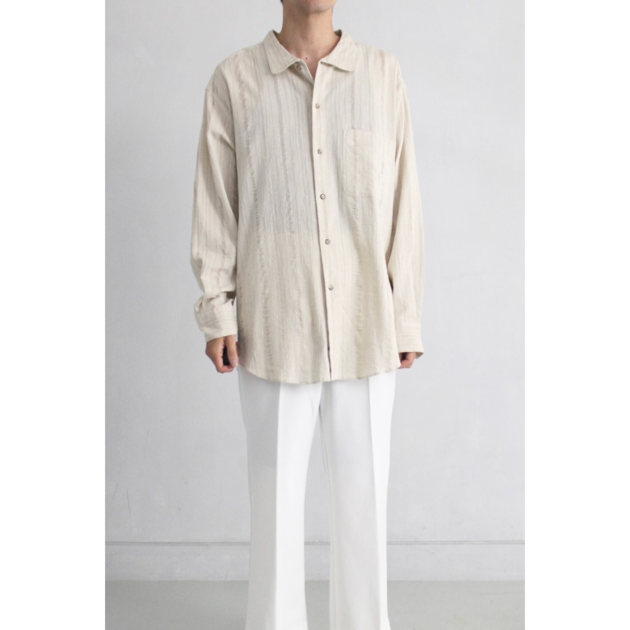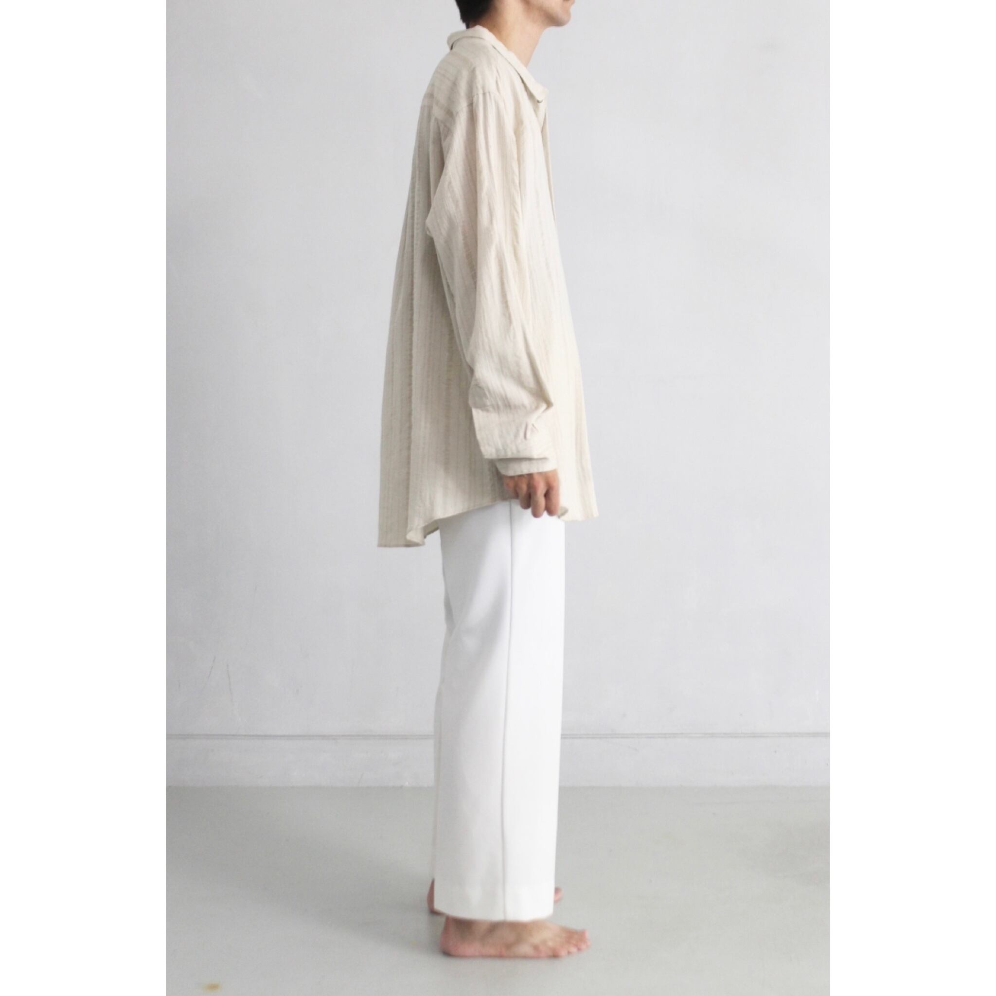 リネンのようなファブリックにシワ感の表情のある極薄手コットン生地。とても着心地も良く夏場から秋口にかけて間違いなく重宝する生地感です。