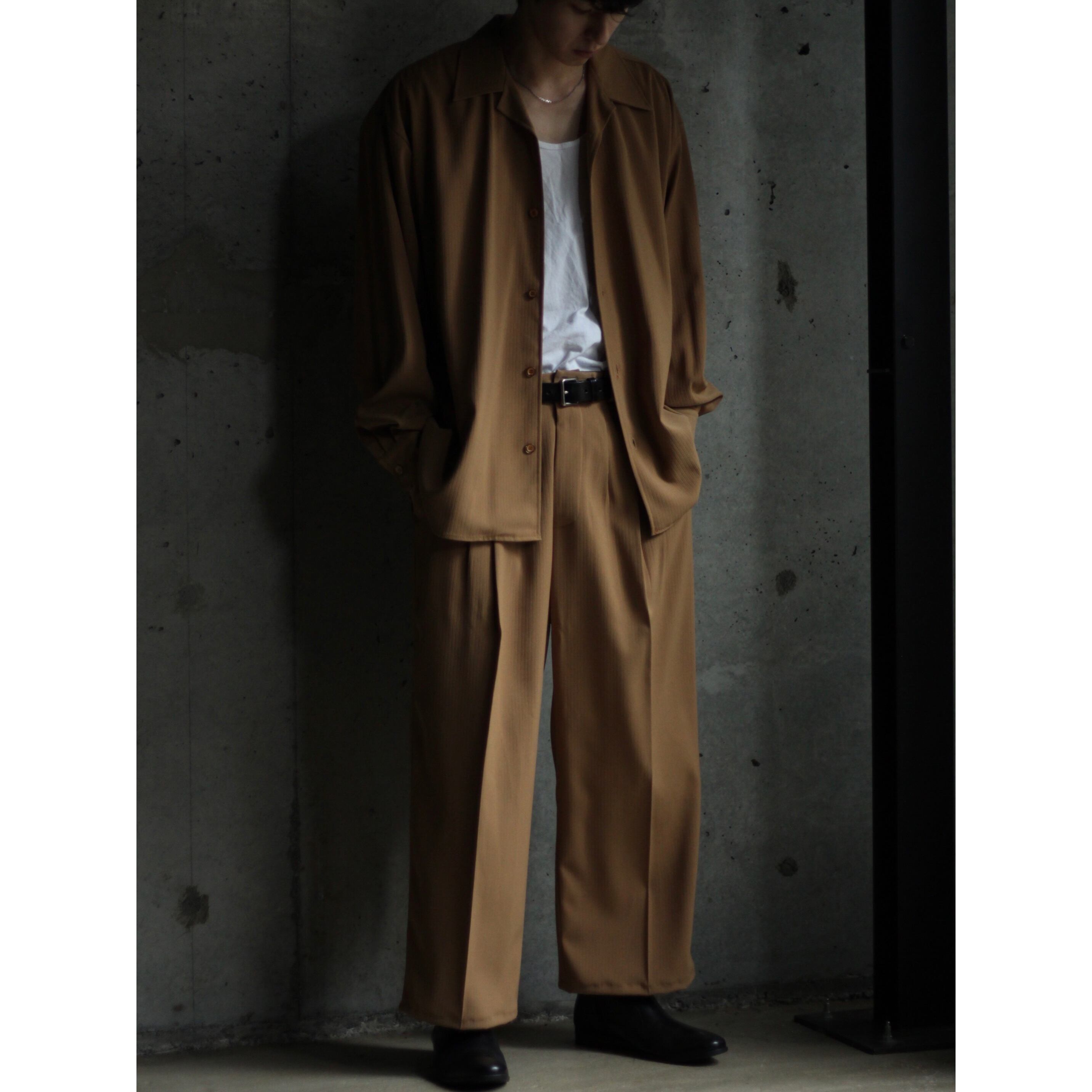 1990年代のUSA製でシャツはボックスシルエット。シャツとカバーオールの中間程の生地の厚さで羽織としても優秀。ボトムスは裾幅27cmの3タックの入る驚異のワイドスラックス。ズドンと落ちるシルエットはパンツ単体でも稀に見るスペシャルアイテムです。軽やかで滑らかなトロミのあるポリエステル素材を採用。