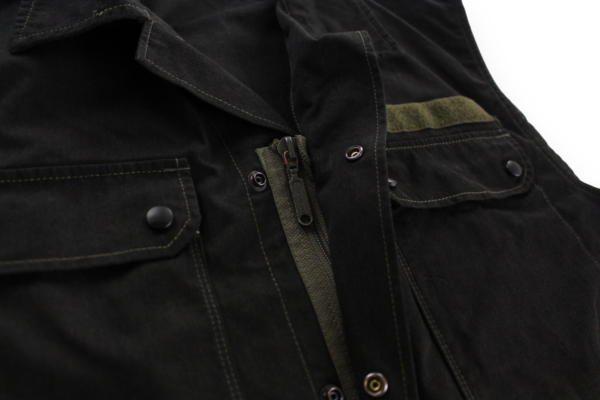 胸で主張する縦長なフラップポケットやジッパーとスナップボタンの二重構造となったフロントのディテール。