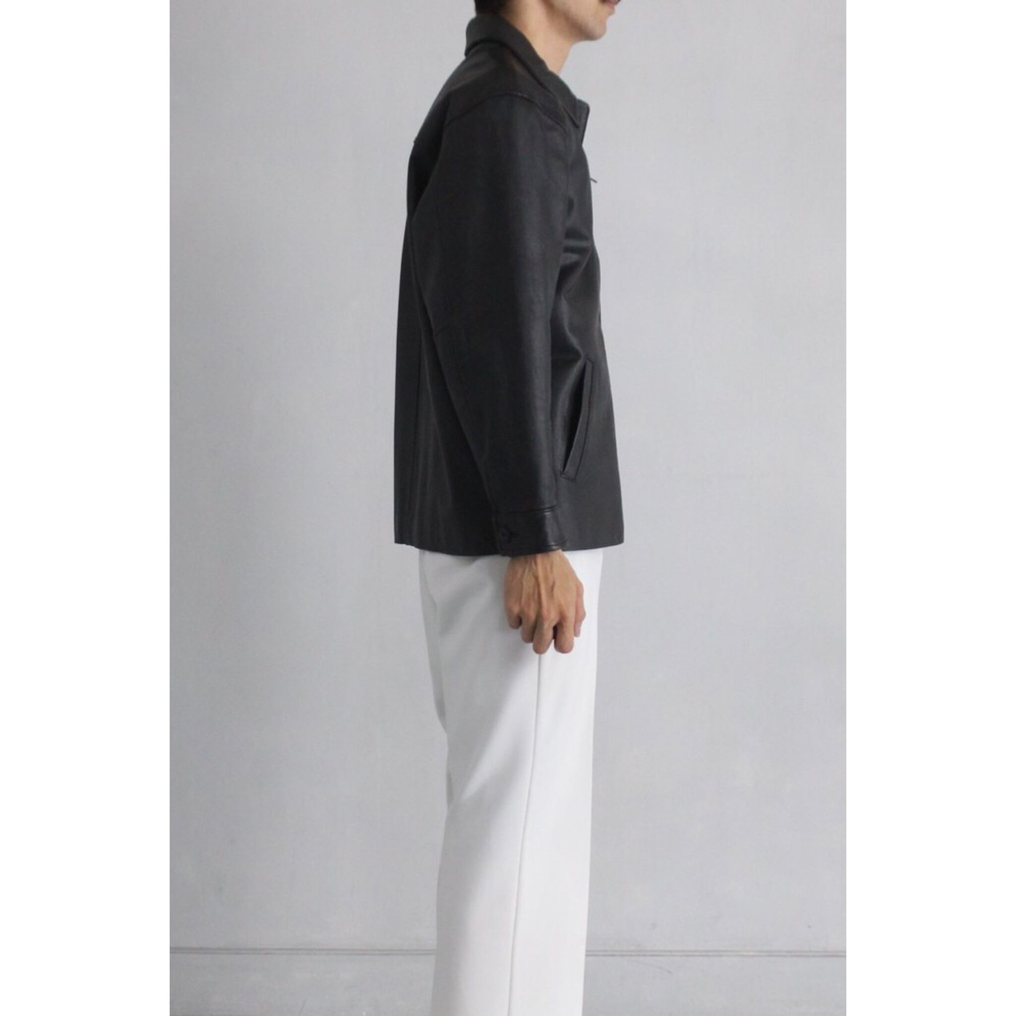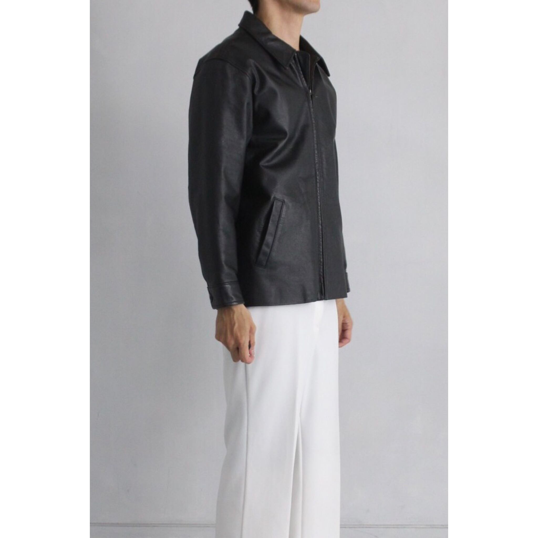 非常に使い勝手が良いブラックカラー襟付きジップアップタイプのレザー。ガバッと羽織れるサイズ感も良く,身幅たっぷりでインナーも着込めますし,オチ感もあるので合わせるインナーは選ばないかと。フロント両サイドポケット×2に内ポケットも完備してます。