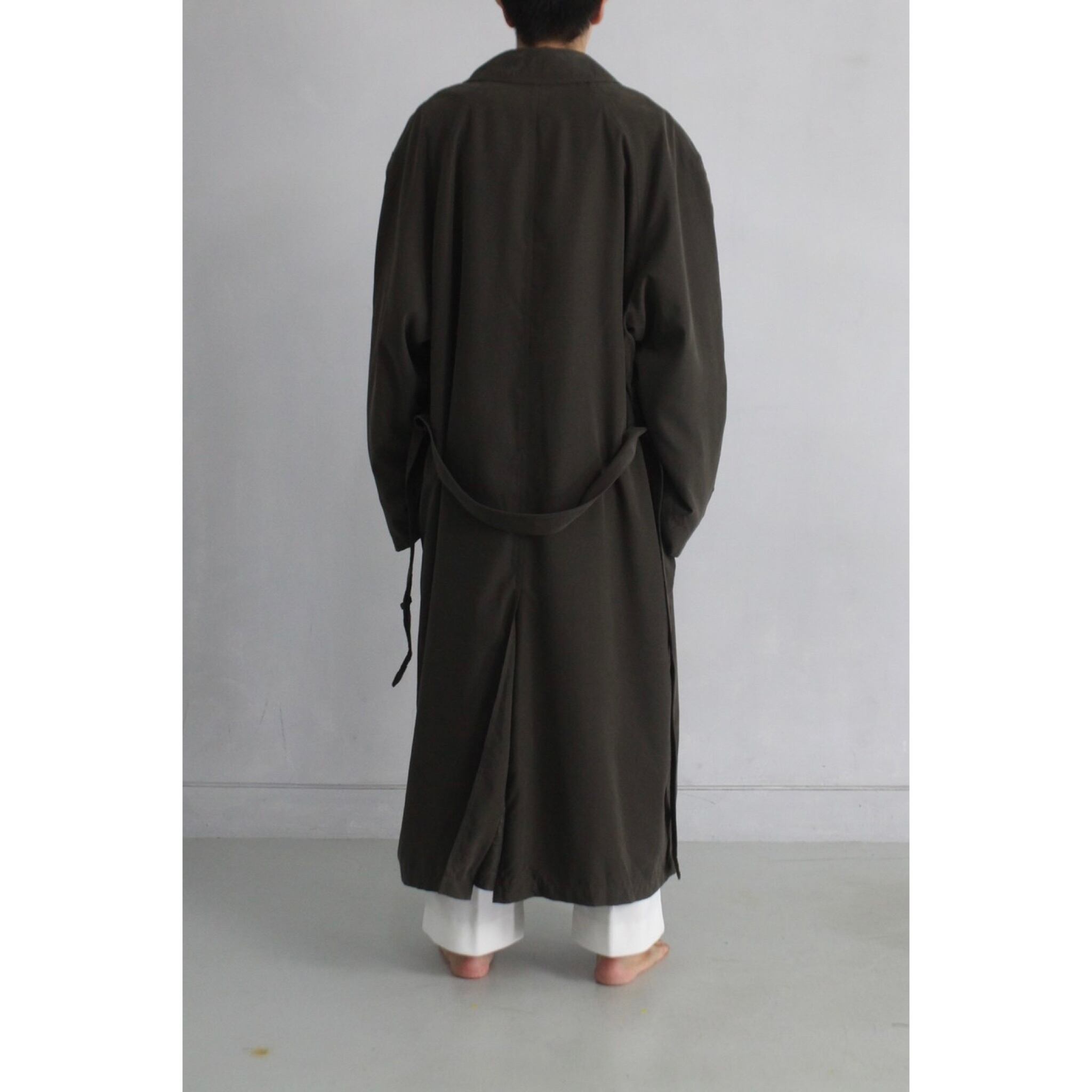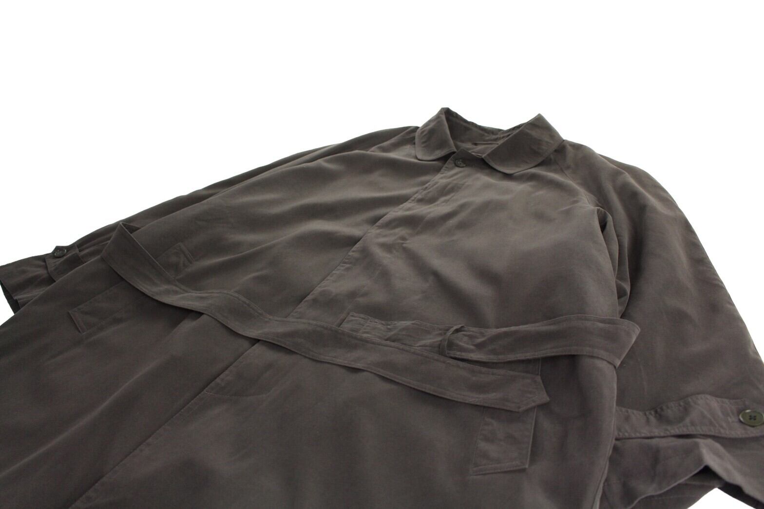 表面滑らかなスムース地、更にはラグランスリーブにより流れる様な肩落ちに裾に向かって垂れるように落ちる色気のある生地です。ほんのりと光沢のある生地感も高級感に拍車がかって◎身幅はたっぷりと長すぎることない膝下丈の理想的なシルエットです。普段のスタイルにサラッと羽織るだけで雰囲気良く馴染むと思います。
