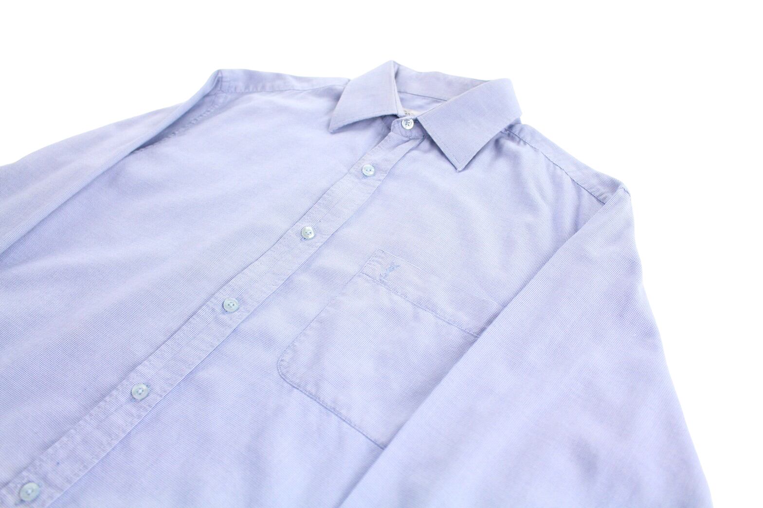 遠くからだとドットのような細かいチェック柄でほぼ無地に近いブランドらしい上品なシャツ。左胸には同色刺繍で"YSL"のブランドロゴ。ボタンも同色というなんとも気の利いたアイテム。